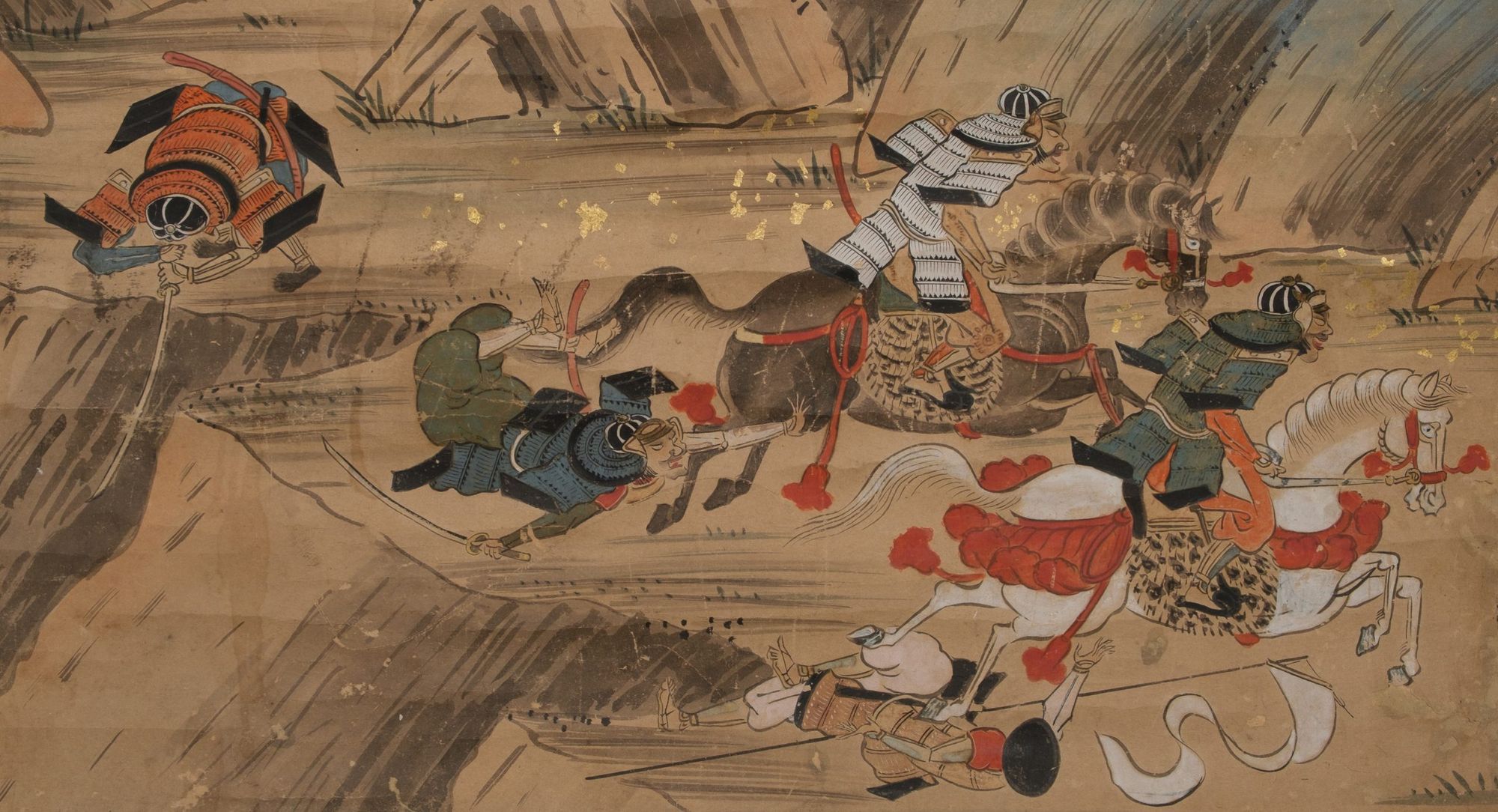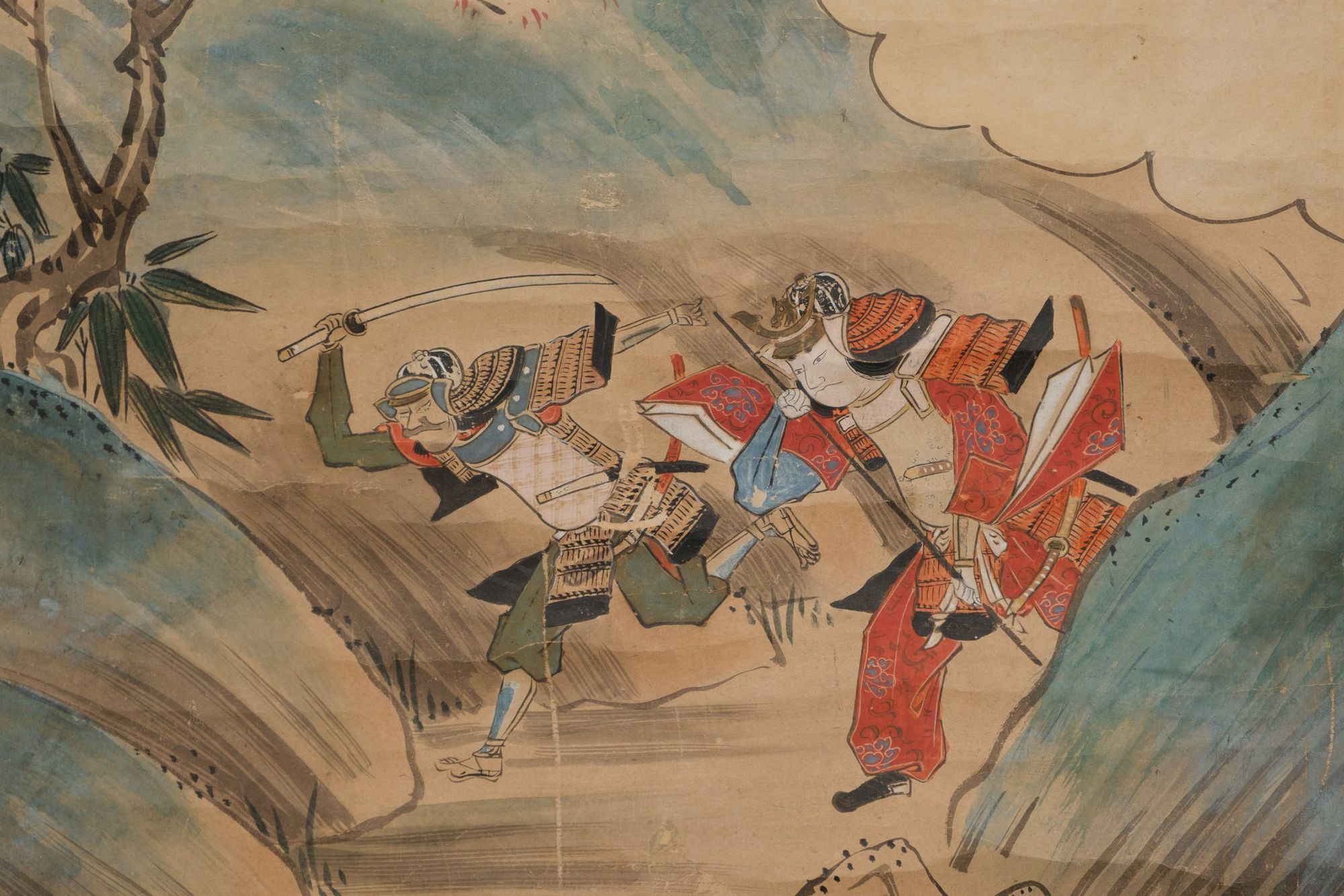 The lower scene portrays the same noble figure, now in pursuit of a group of fleeing enemies or rogue samurai. Accompanied by a retainer, he chases down the culprits, who are escaping on foot stumbling, but also on the two horses they stole.