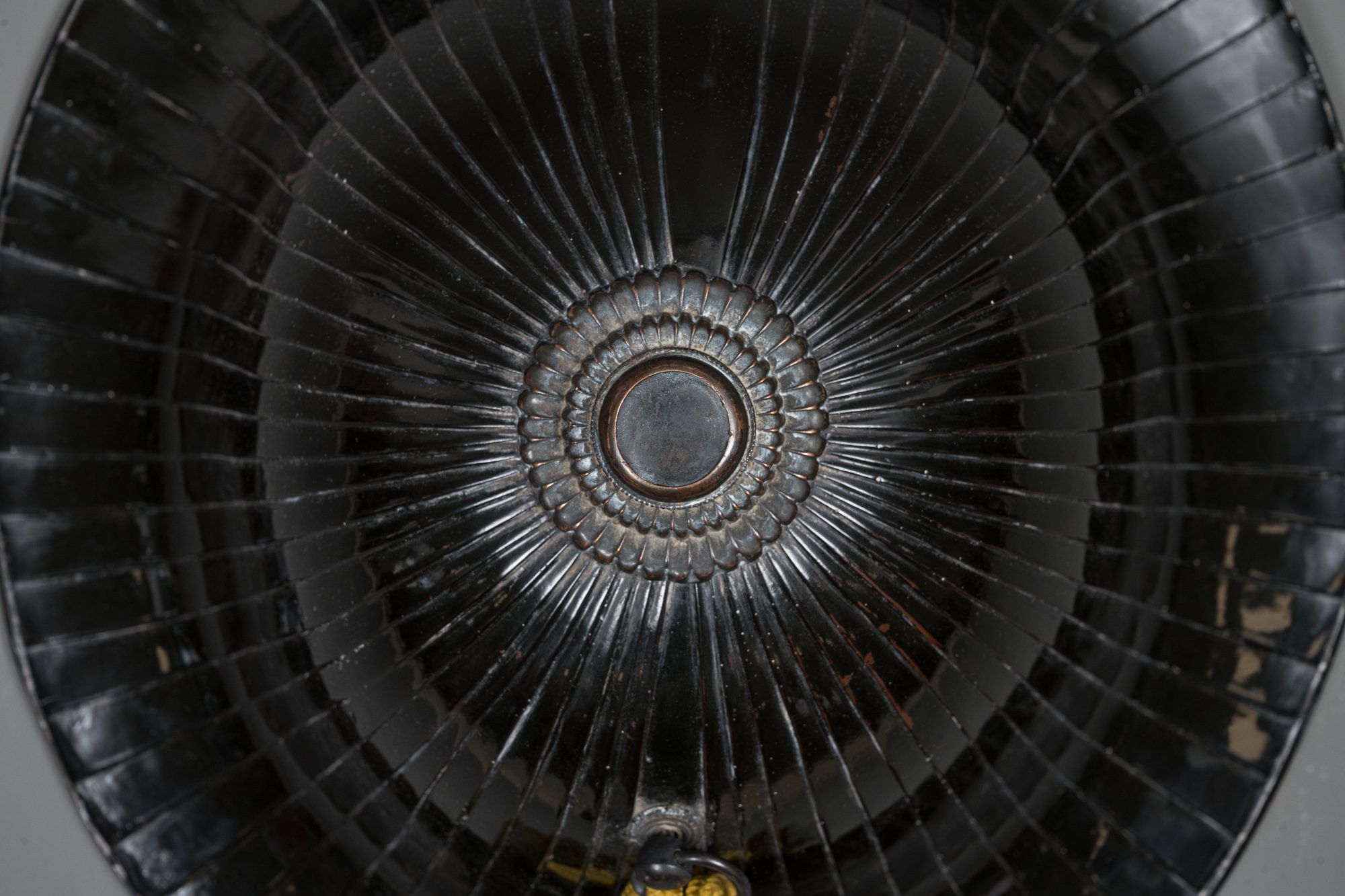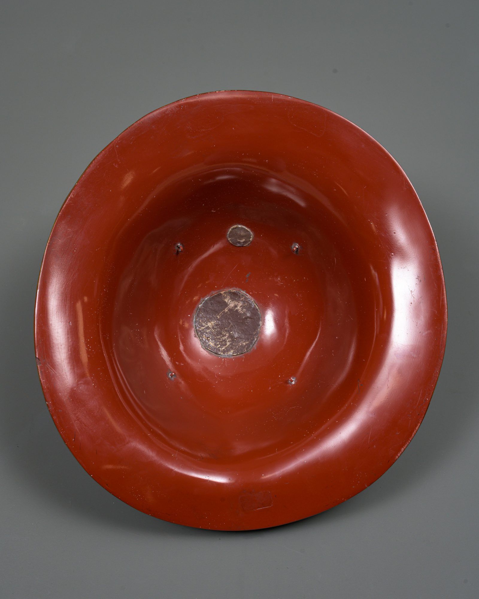The form imitates the layered structure of a 61-plate kabuto 兜 (helmet), with raised relief detailing. At the apex, it is fitted with a large, four-tiered patinated copper tehen no kanamono 天辺の金物 (decorative apex fitting), shaped like a chrysanthemum kiku 菊 (chrysanthemum). The reverse is adorned with a cord ring and a gold silk age’maki 揚巻 (decorative tassel).