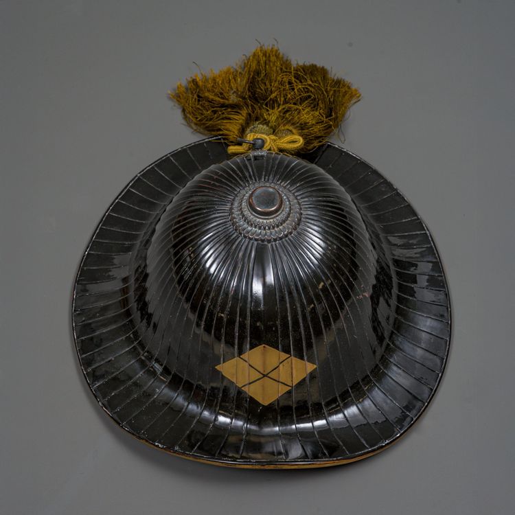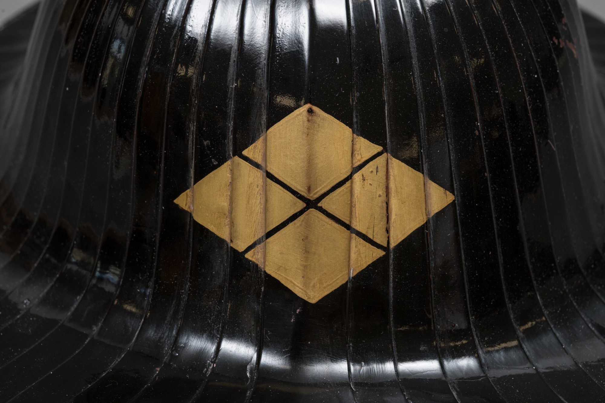 An attractive black lacquered bajô’jingasa 馬上陣笠 (horseback samurai hat), featuring a slightly upturned visor. The front displays a gold maki-e crest mon 紋 (crest) depicting a diamond-shaped emblem known as Takeda bishi 武田菱 (Takeda diamond).