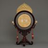 The suspended large drum (taiko) with gilded drum skins fastened by a single rows of dome-shaped rivets on a brown lacquered keyaki wooden frame. When struck, the drum creates a nice strong and deep sound.