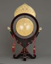 The circular frame adorned with a gilded metal flame with an open work and engraved swirling cloud design with in the centre three raised ‘precious jewels’ 宝珠 (hôju)
