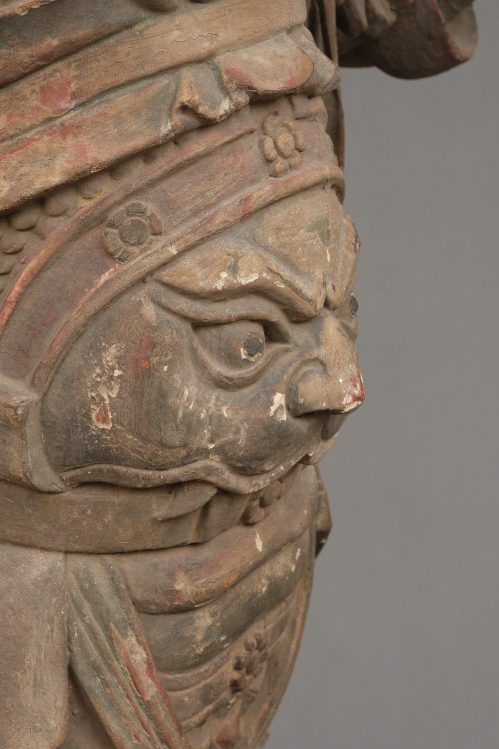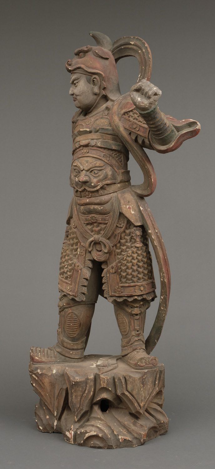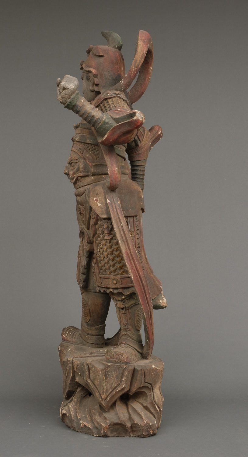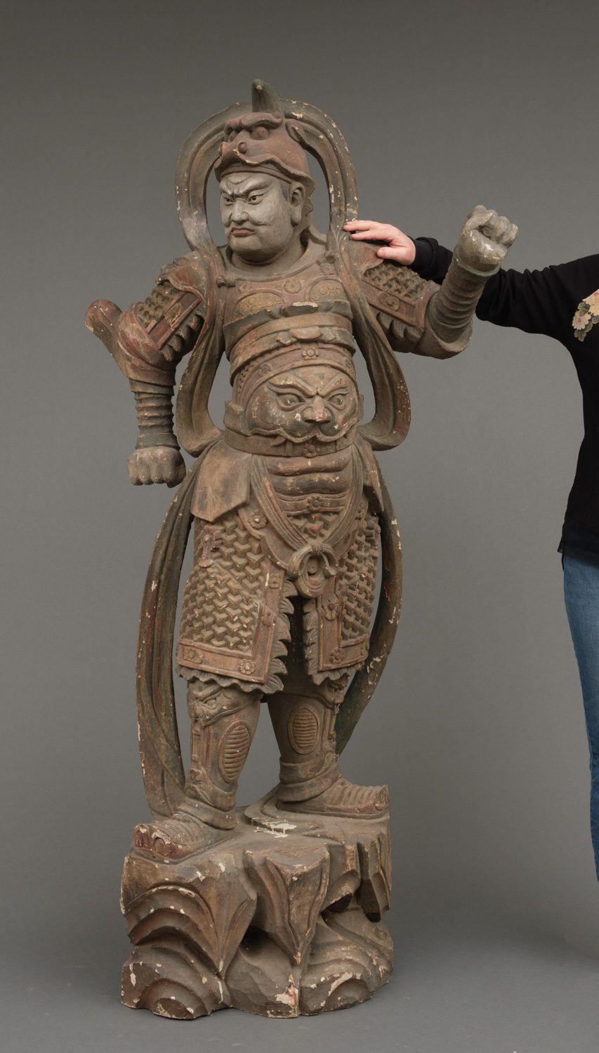 Important life-size wooden statue (high 172 cm!!) of a Buddhist deity in his manifestation of a warrior, clad in armour and standing on a rock. The eyes of this impressive statue have glass eye pupils. And a terrifying head of a monster figure sculpted on his belly, as an extra protection against unfriendly identities towards Buddism. The deity is one of a group of 8 devas (“ten”), deities assimilated from Indian Brahmanism and Hinduism into Buddhism. A god in a suit-of-armour is one of the gohoshin, a “deva” that guards the buddhas and extend their protection to the followers of Buddhism. There are various groups of so called “ten”. This “ten” is Gobujo, one of the Eight Legions (hachibushu). This group of eight deva (each representing his own tribe or legion) protect Shaka nyorai, the historical buddha Gautama as the nyorai-buddha Shakyamuni (Shaka). In a temple the hachibushu statues are placed around a central Shaka nyorai figure. Characteristic for Gobujo is the elephant head he wears on his head. Meiji period (1868-1912). With age test. See last picture.