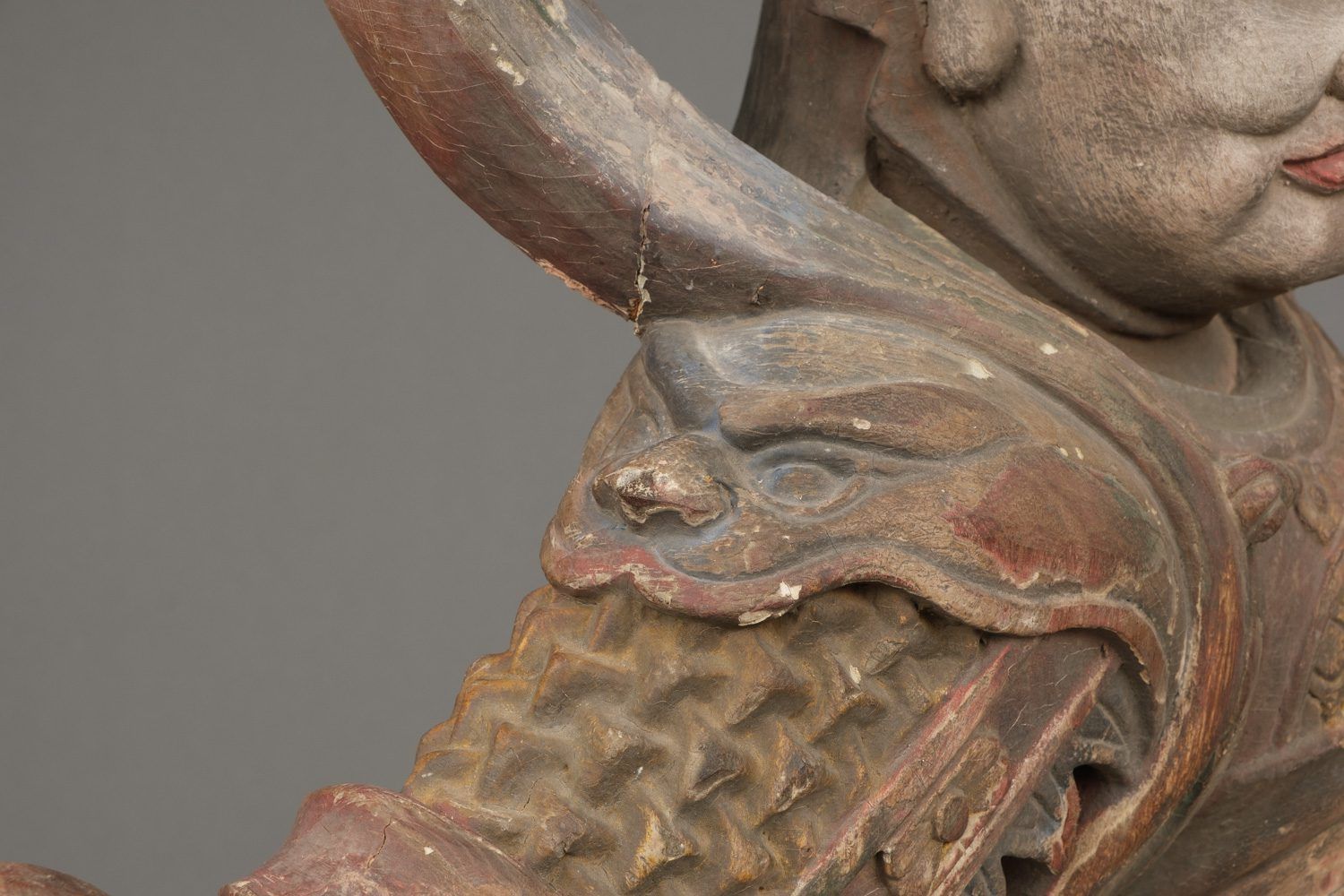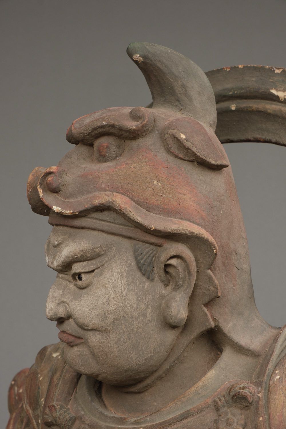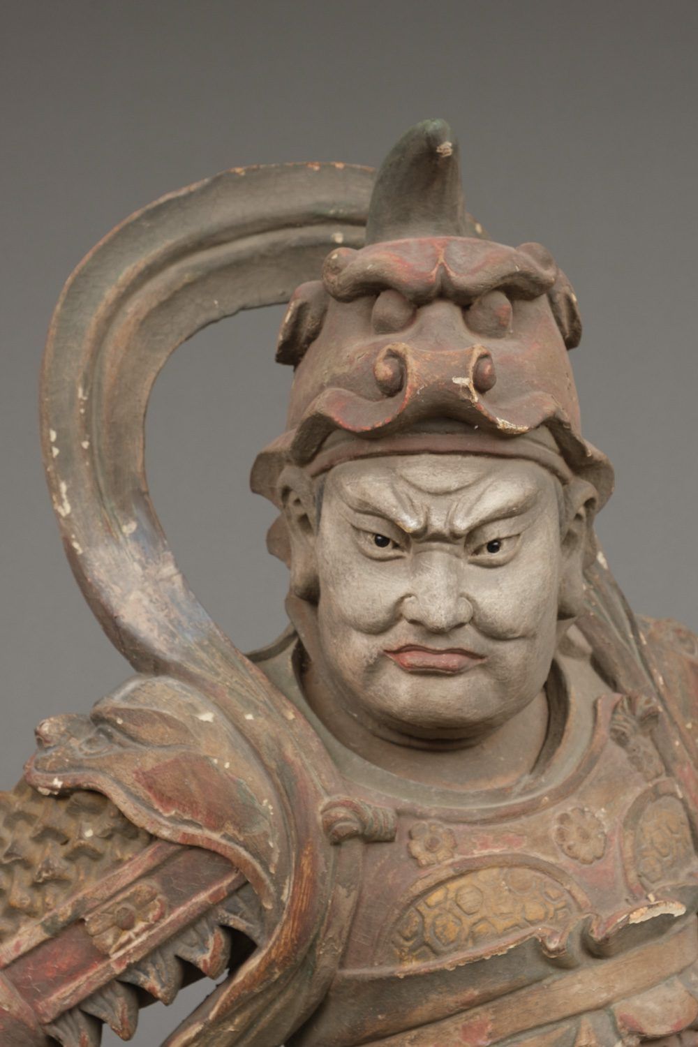 Important life-size wooden statue (high 172 cm!!) of a Buddhist deity in his manifestation of a warrior, clad in armour and standing on a rock. The eyes of this impressive statue have glass eye pupils. And a terrifying head of a monster figure sculpted on his belly, as an extra protection against unfriendly identities towards Buddism. The deity is one of a group of 8 devas (“ten”), deities assimilated from Indian Brahmanism and Hinduism into Buddhism. A god in a suit-of-armour is one of the gohoshin, a “deva” that guards the buddhas and extend their protection to the followers of Buddhism. There are various groups of so called “ten”. This “ten” is Gobujo, one of the Eight Legions (hachibushu). This group of eight deva (each representing his own tribe or legion) protect Shaka nyorai, the historical buddha Gautama as the nyorai-buddha Shakyamuni (Shaka). In a temple the hachibushu statues are placed around a central Shaka nyorai figure. Characteristic for Gobujo is the elephant head he wears on his head. Meiji period (1868-1912). With age test. See last picture.