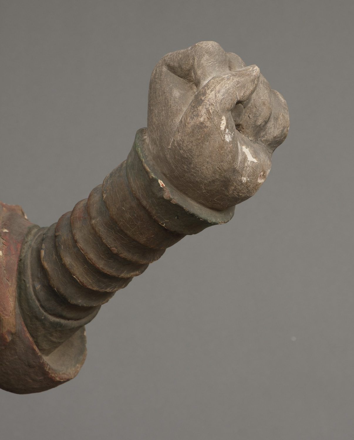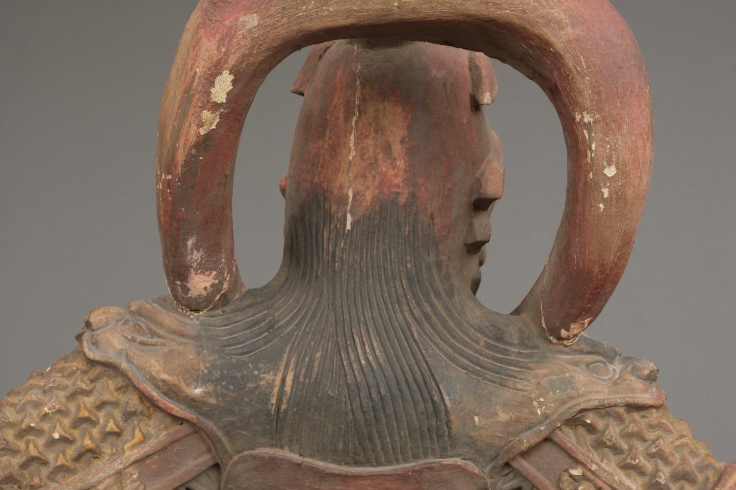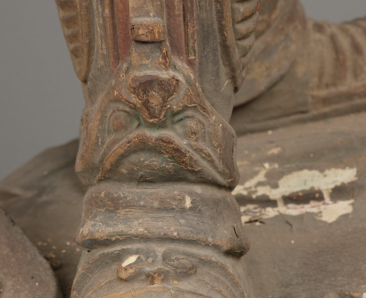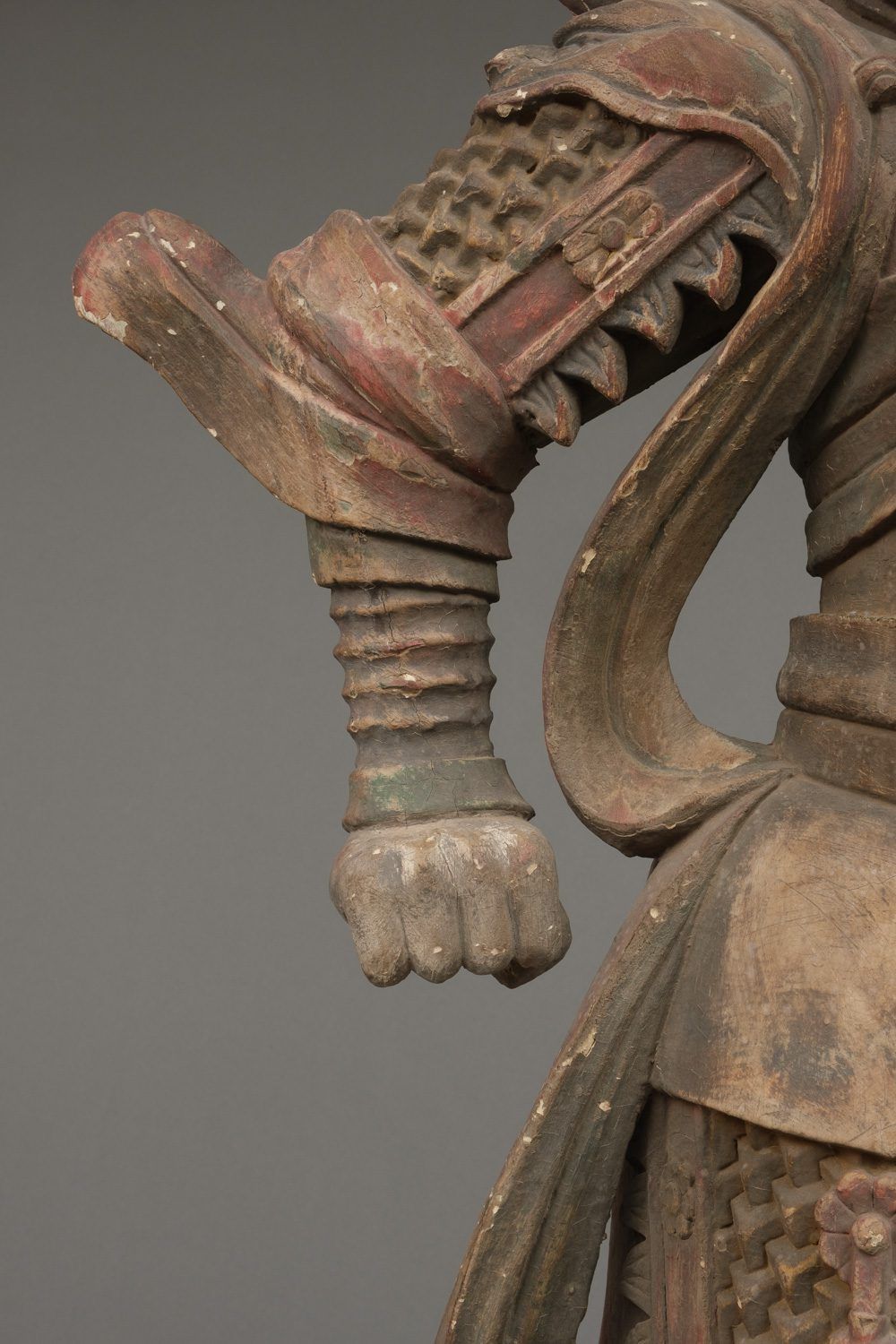 Important life-size wooden statue (high 172 cm!!) of a Buddhist deity in his manifestation of a warrior, clad in armour and standing on a rock. The eyes of this impressive statue have glass eye pupils. And a terrifying head of a monster figure sculpted on his belly, as an extra protection against unfriendly identities towards Buddism. The deity is one of a group of 8 devas (“ten”), deities assimilated from Indian Brahmanism and Hinduism into Buddhism. A god in a suit-of-armour is one of the gohoshin, a “deva” that guards the buddhas and extend their protection to the followers of Buddhism. There are various groups of so called “ten”. This “ten” is Gobujo, one of the Eight Legions (hachibushu). This group of eight deva (each representing his own tribe or legion) protect Shaka nyorai, the historical buddha Gautama as the nyorai-buddha Shakyamuni (Shaka). In a temple the hachibushu statues are placed around a central Shaka nyorai figure. Characteristic for Gobujo is the elephant head he wears on his head. Meiji period (1868-1912). With age test. See last picture.