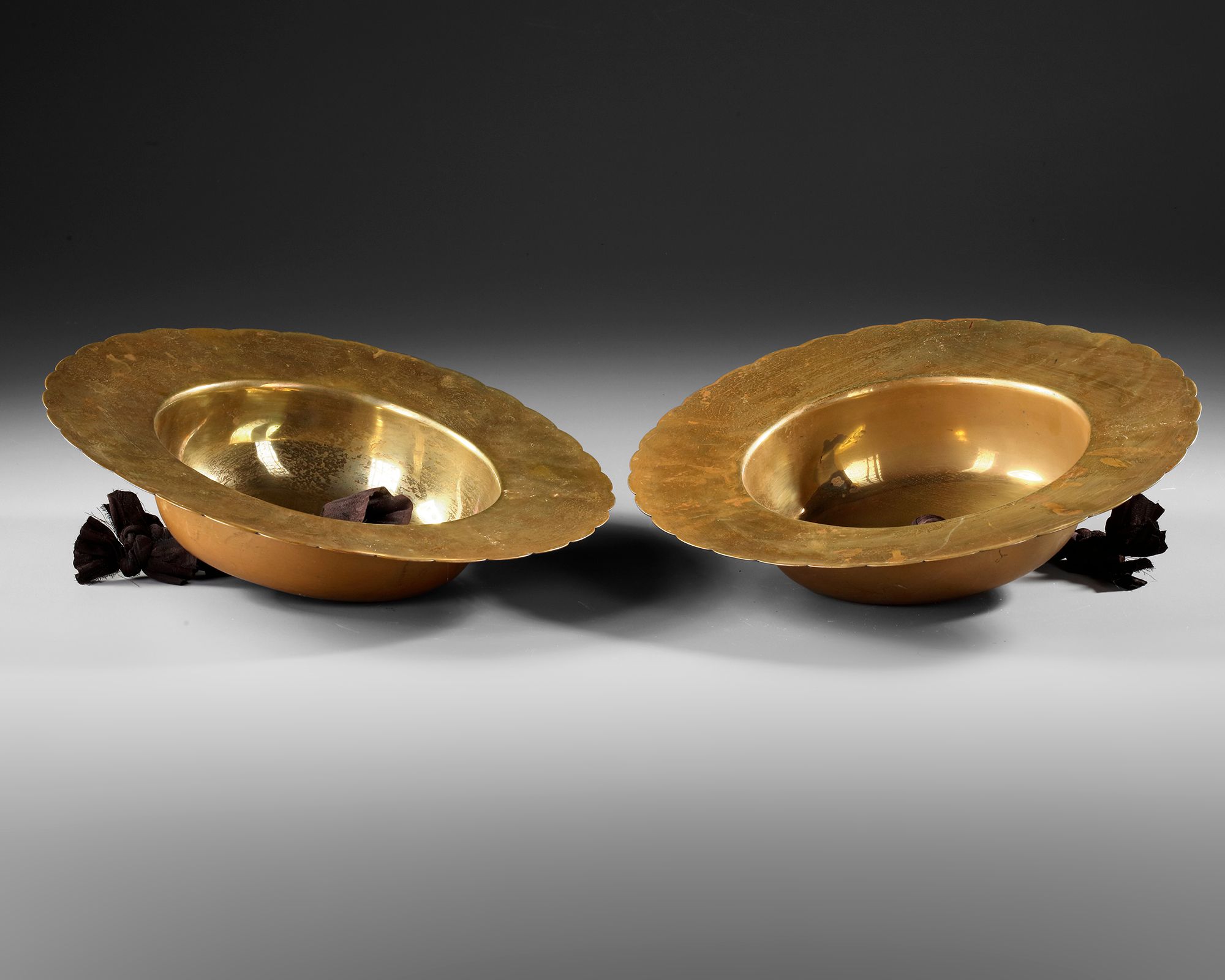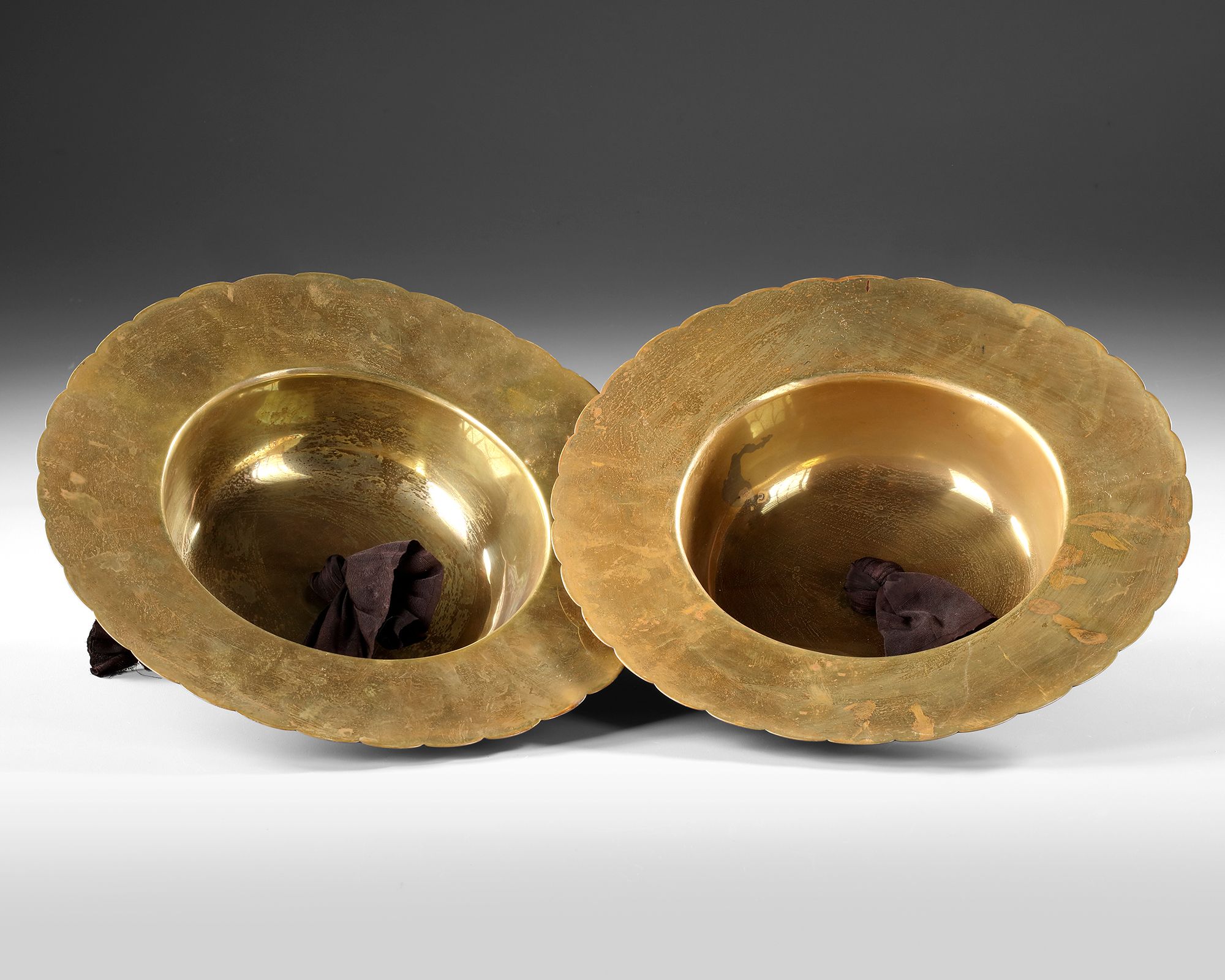 A beautifully crafted pair of Japanese temple cymbals made of polished metal with scalloped edges and dark cord handles. Traditionally used in Buddhist rituals, they produce deep, resonant tones that enhance spiritual ceremonies.
