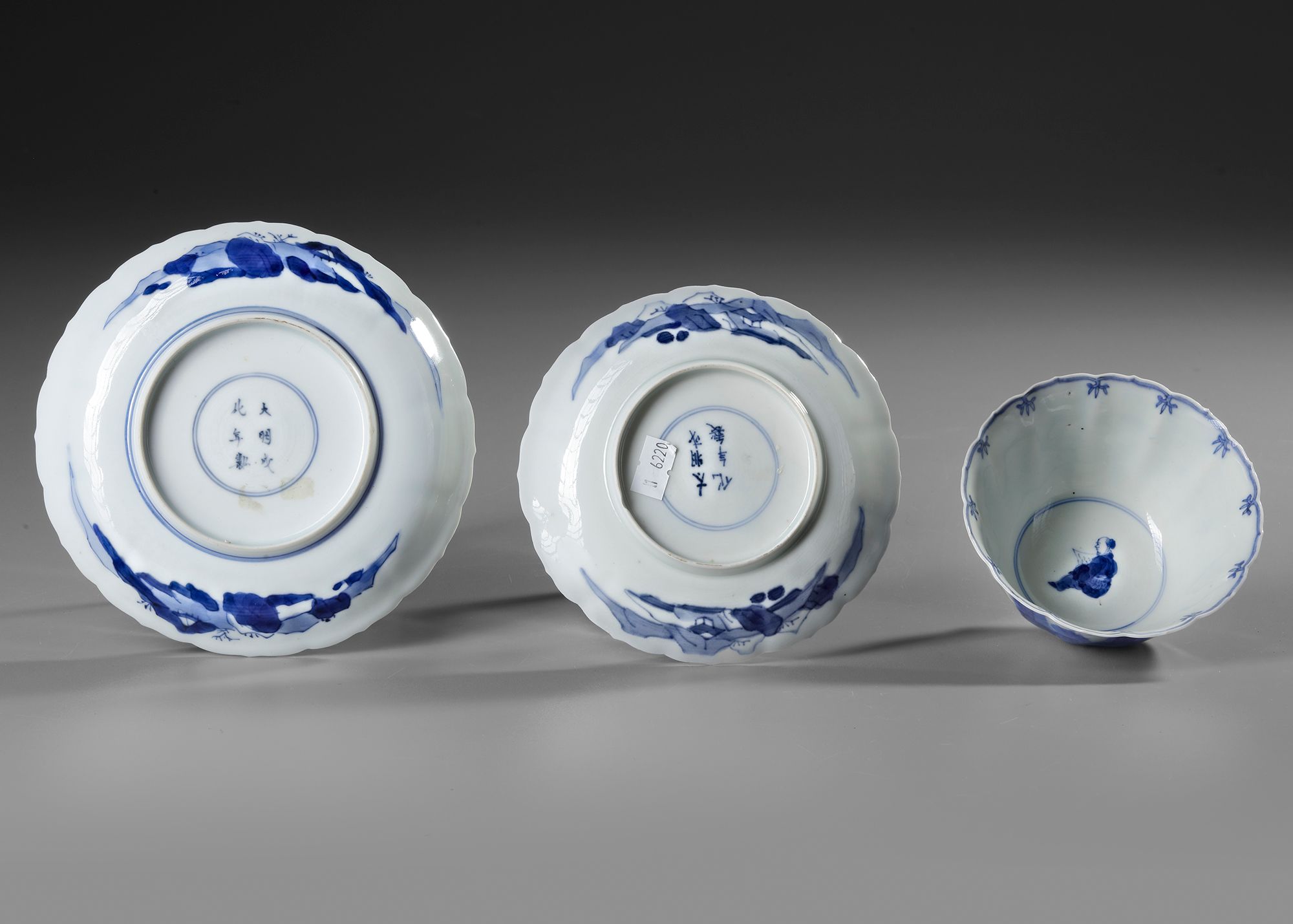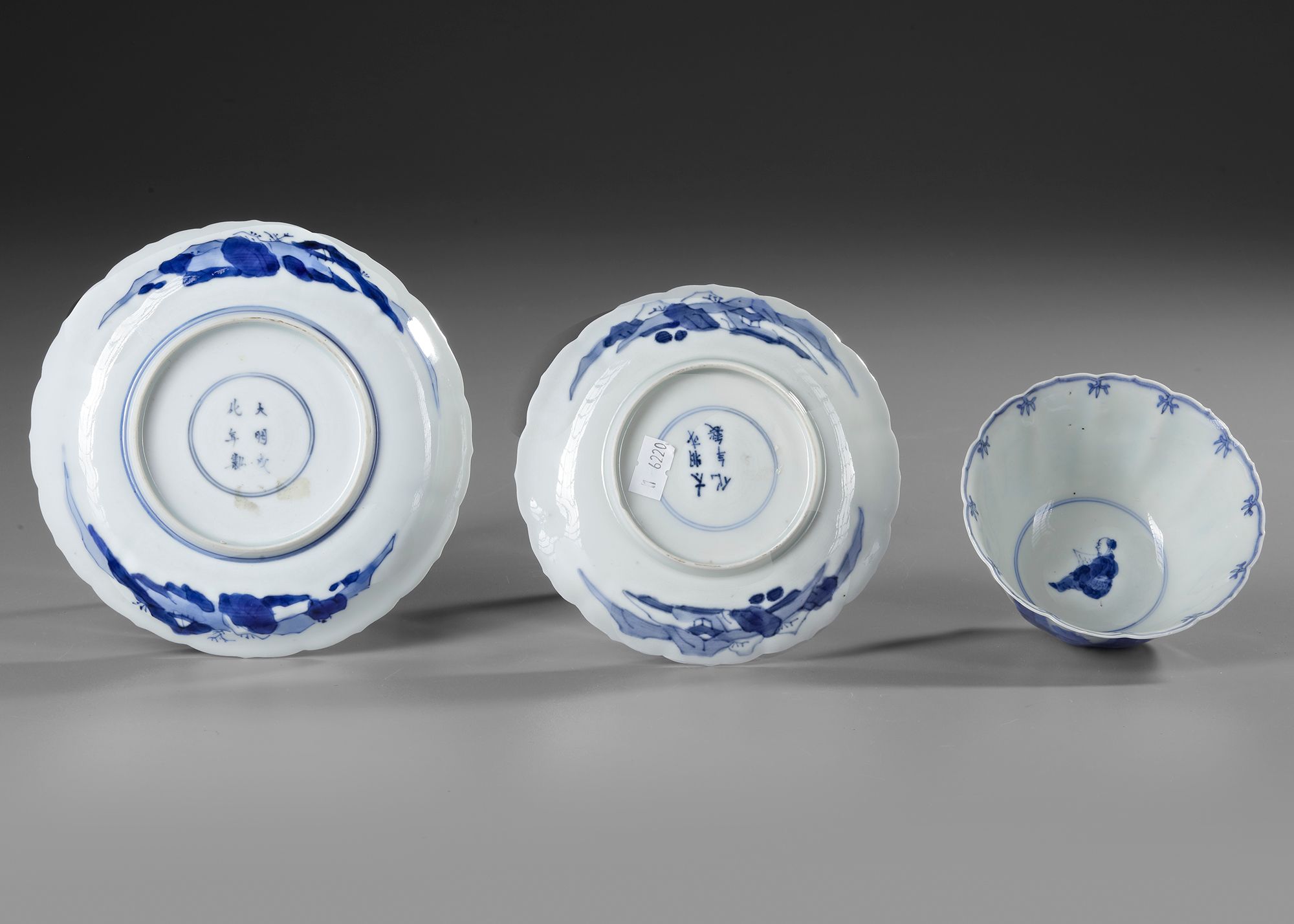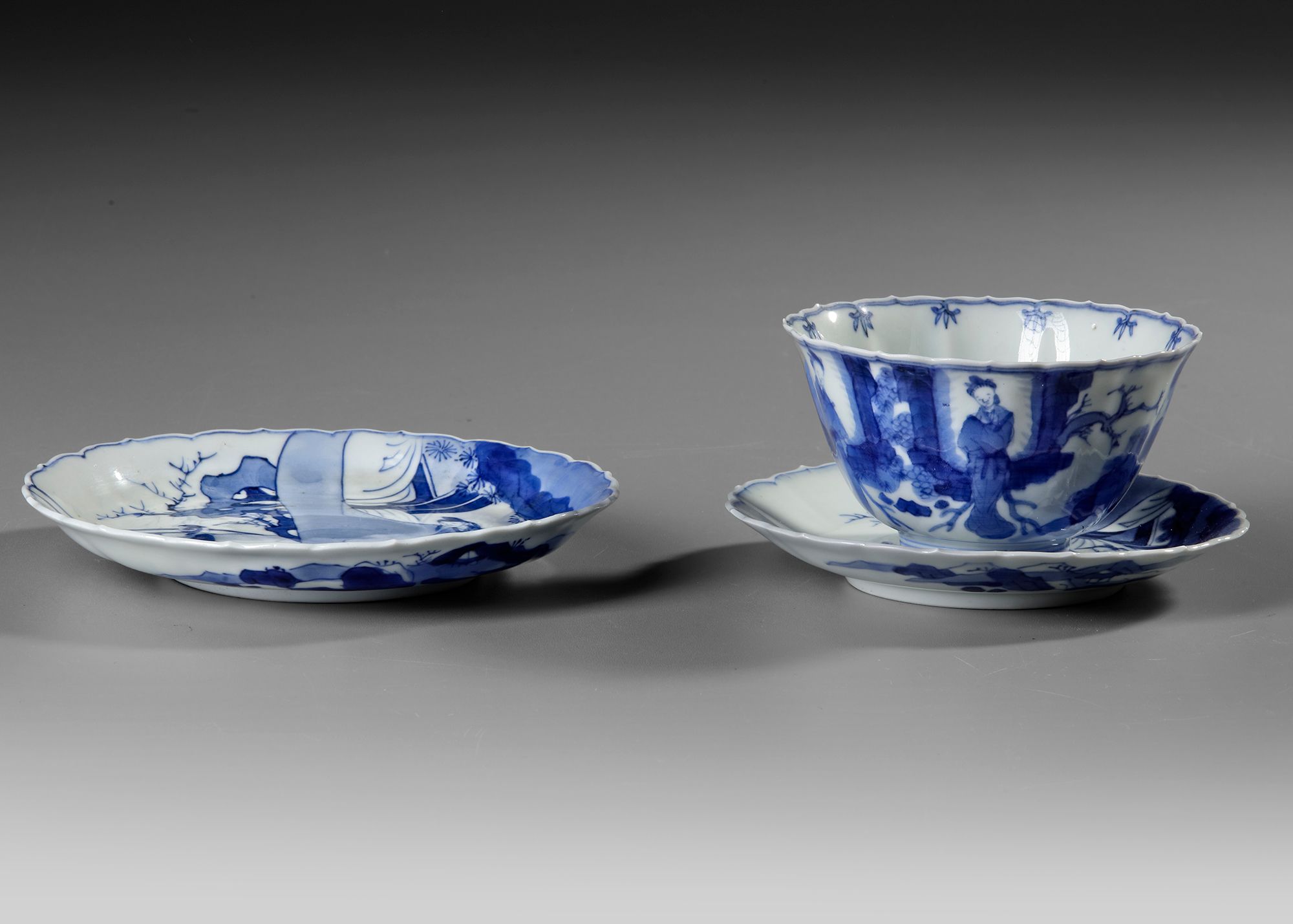 A set comprising a blue and white bowl and two dishes, each delicately painted in underglaze cobalt blue. The bowl is decorated with elegant ladies in a serene landscape, framed by bamboo motifs along the rim. One dish depicts two figures conversing on a terrace beneath a tree, while the other features a similar terrace scene with detailed architectural and natural elements. Each piece has a scalloped rim and displays.