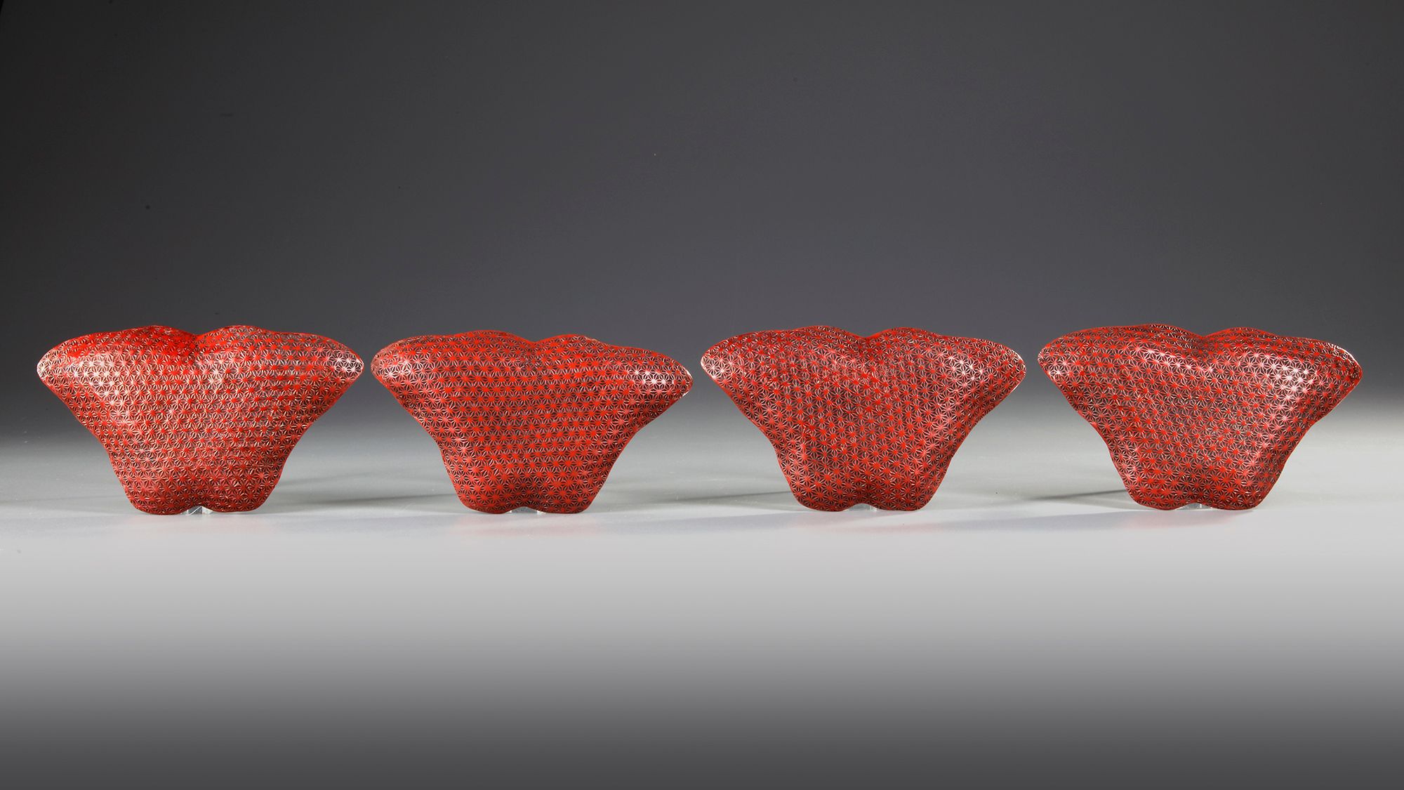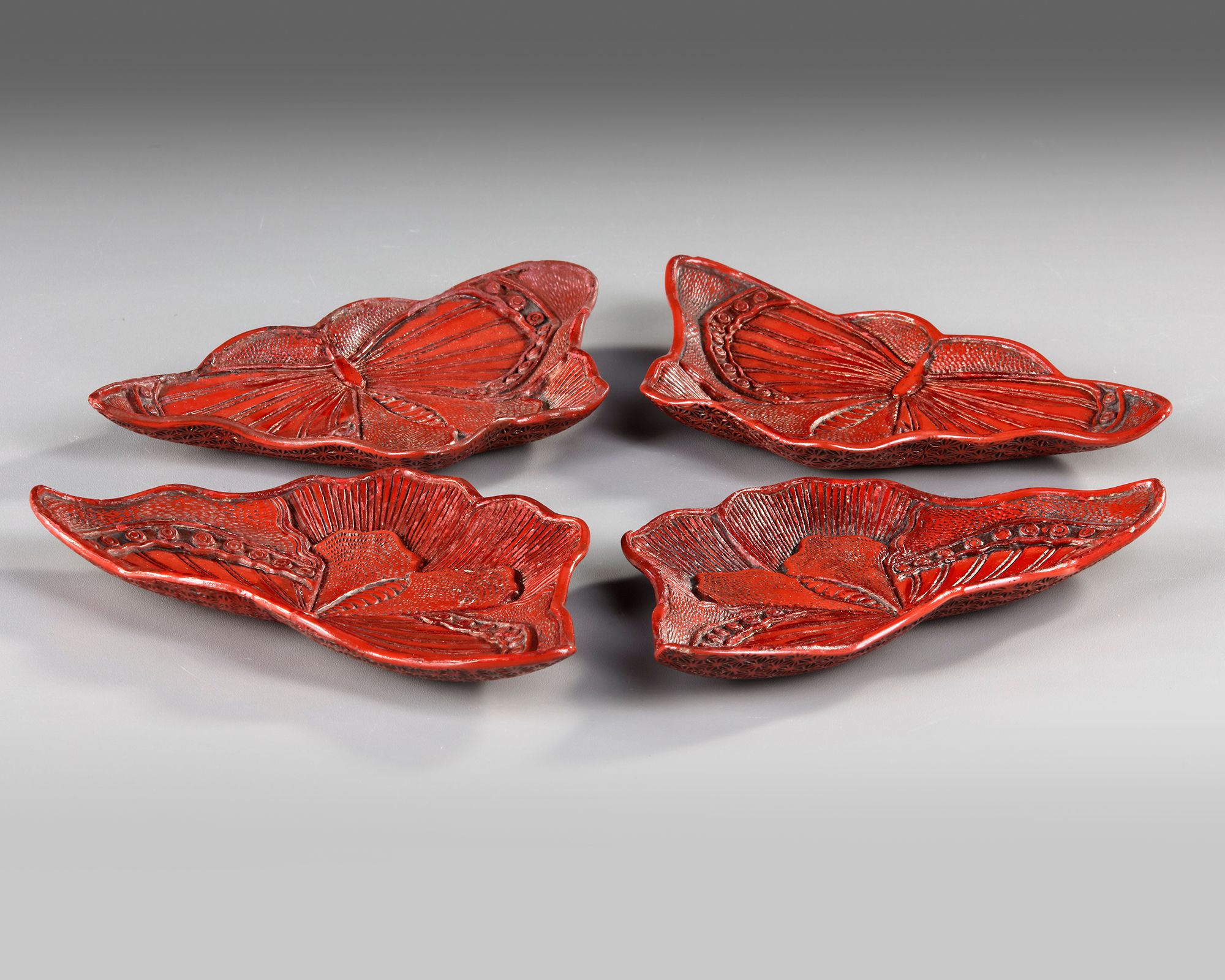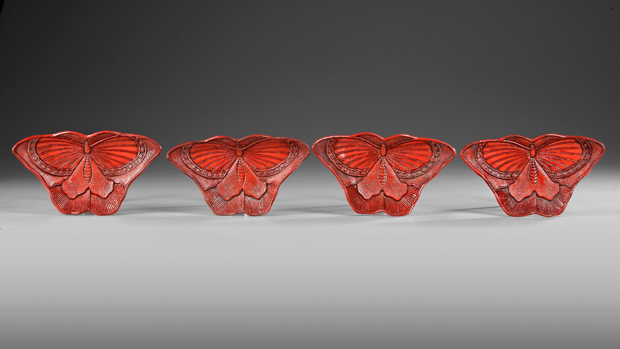 The butterflies are modeled as dishes, carved through the red lacquer layers. Width 17.5 cm. Depth 10 cm.