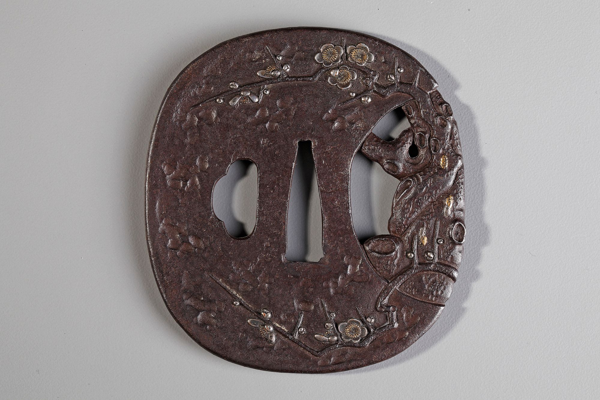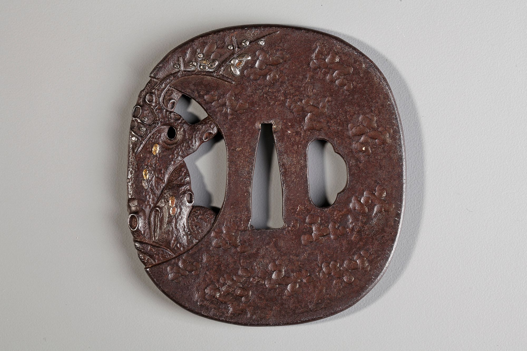 Of rounded rectangular form, carved and pierced in relief of a plum tree, inlaid with gold and silver. Diameter .7.8 cm.