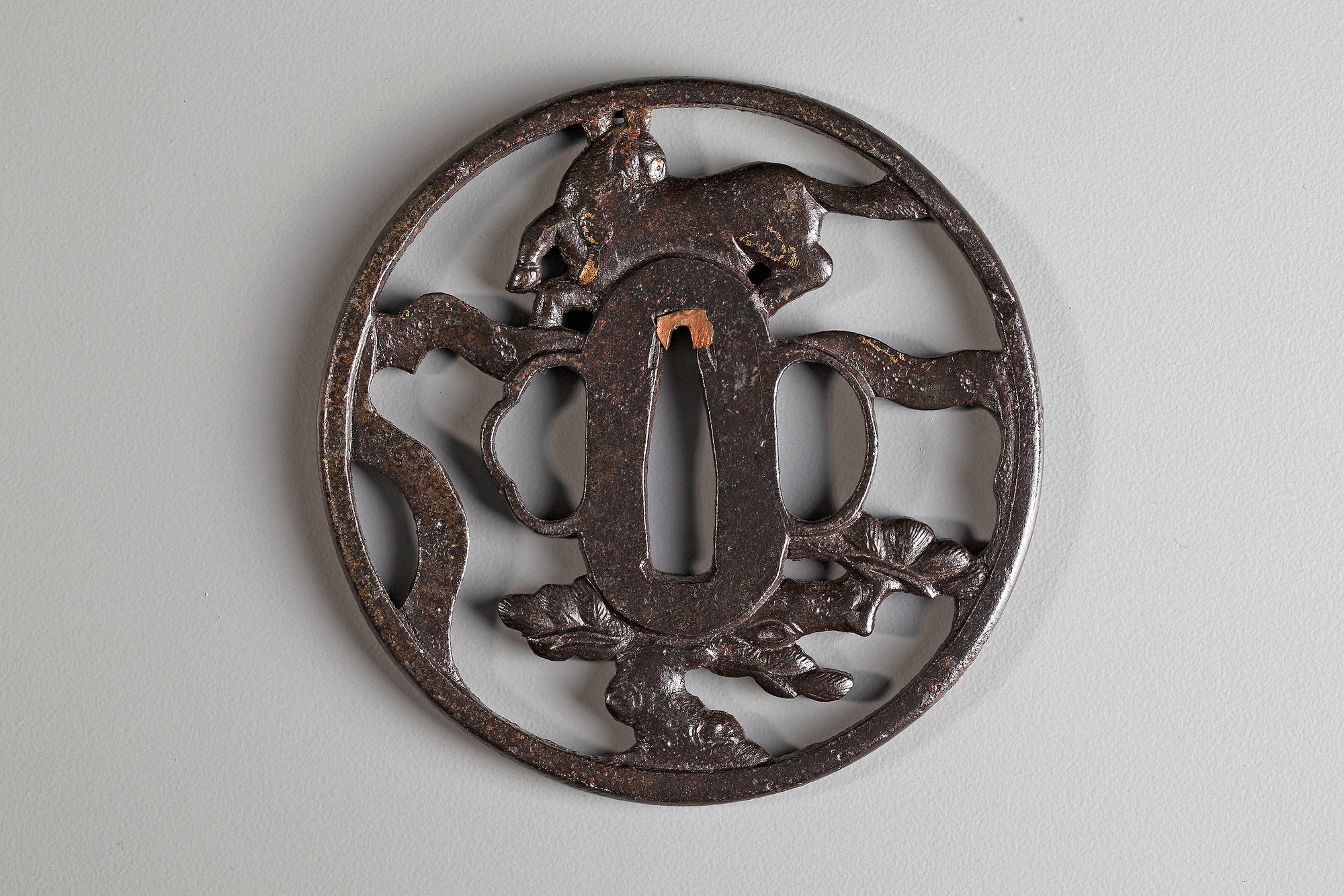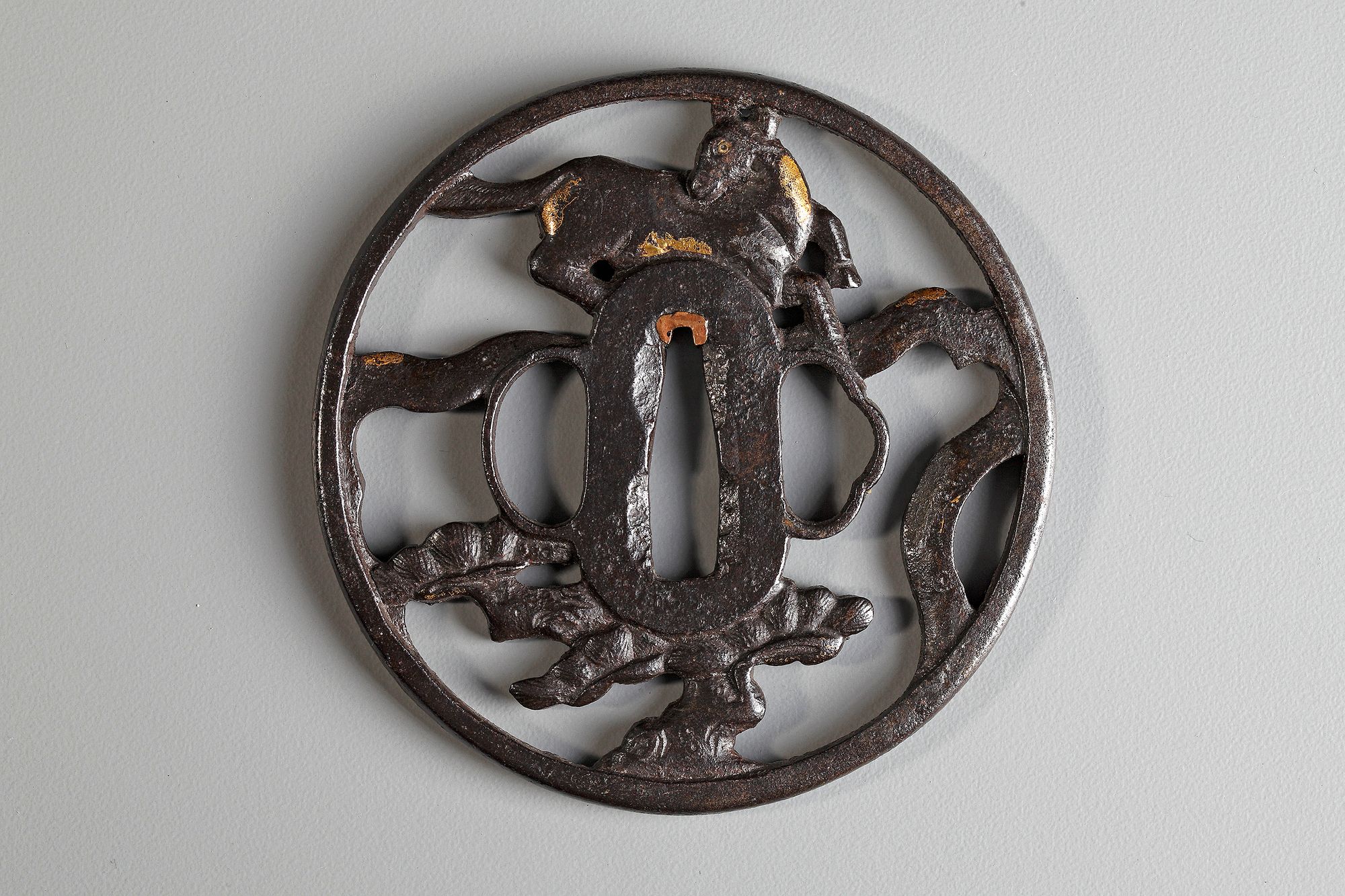 Of rounded form, carved and pierced in the shape of a horse and a pine tree. Diameter .8.20 cm.