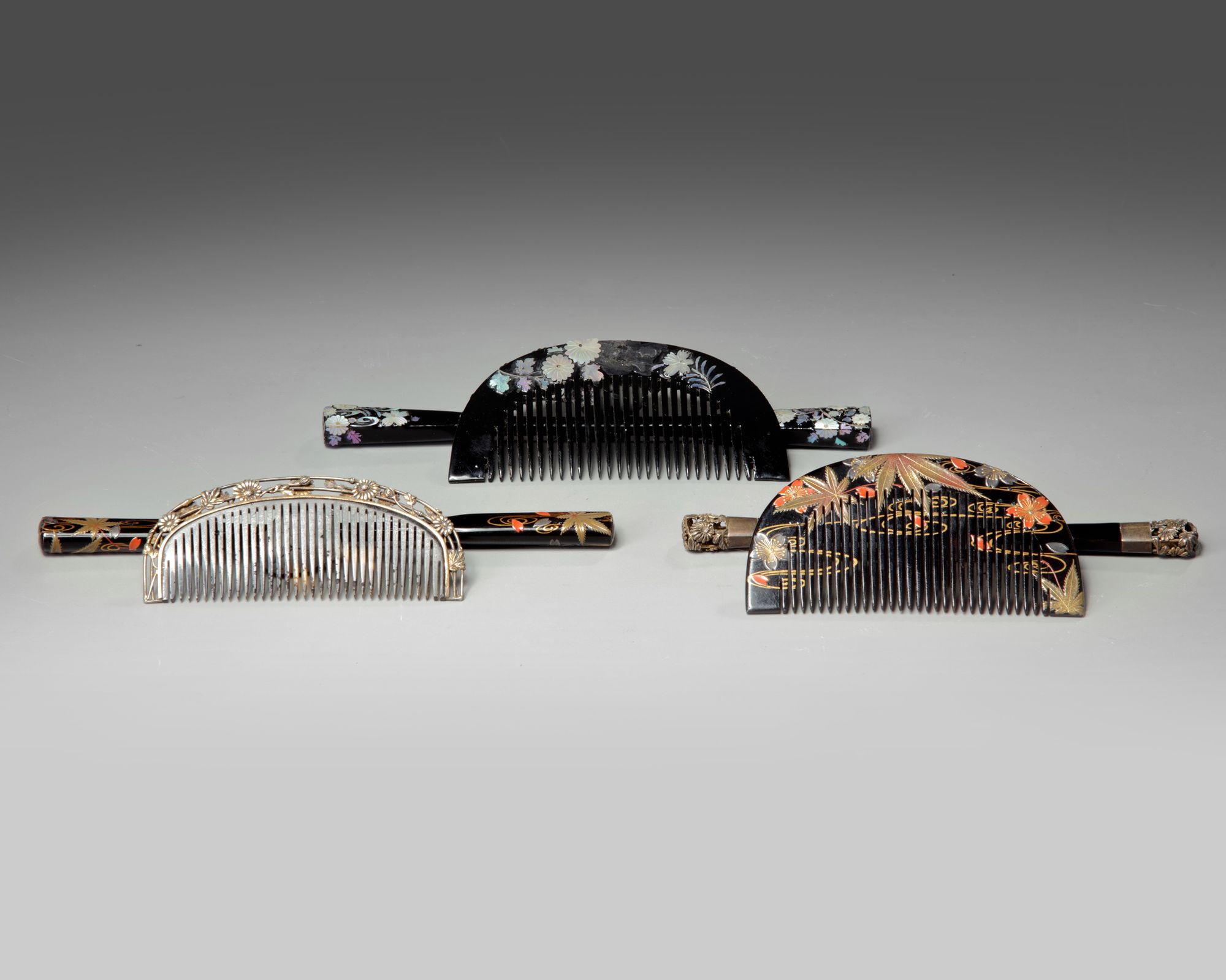 The base color is black with silver, gold and red lacquer with mother of pearl inlays. The design is plum branches and blossoms. depth 16 cm.