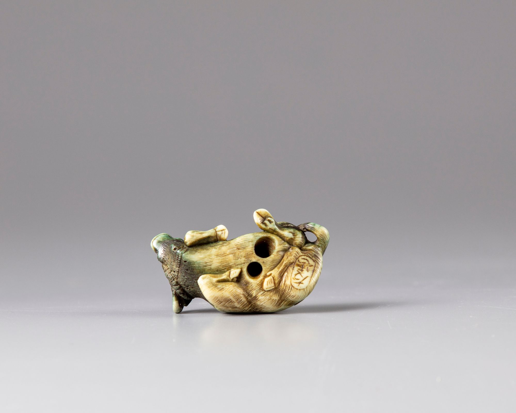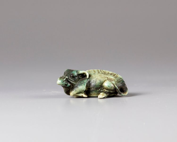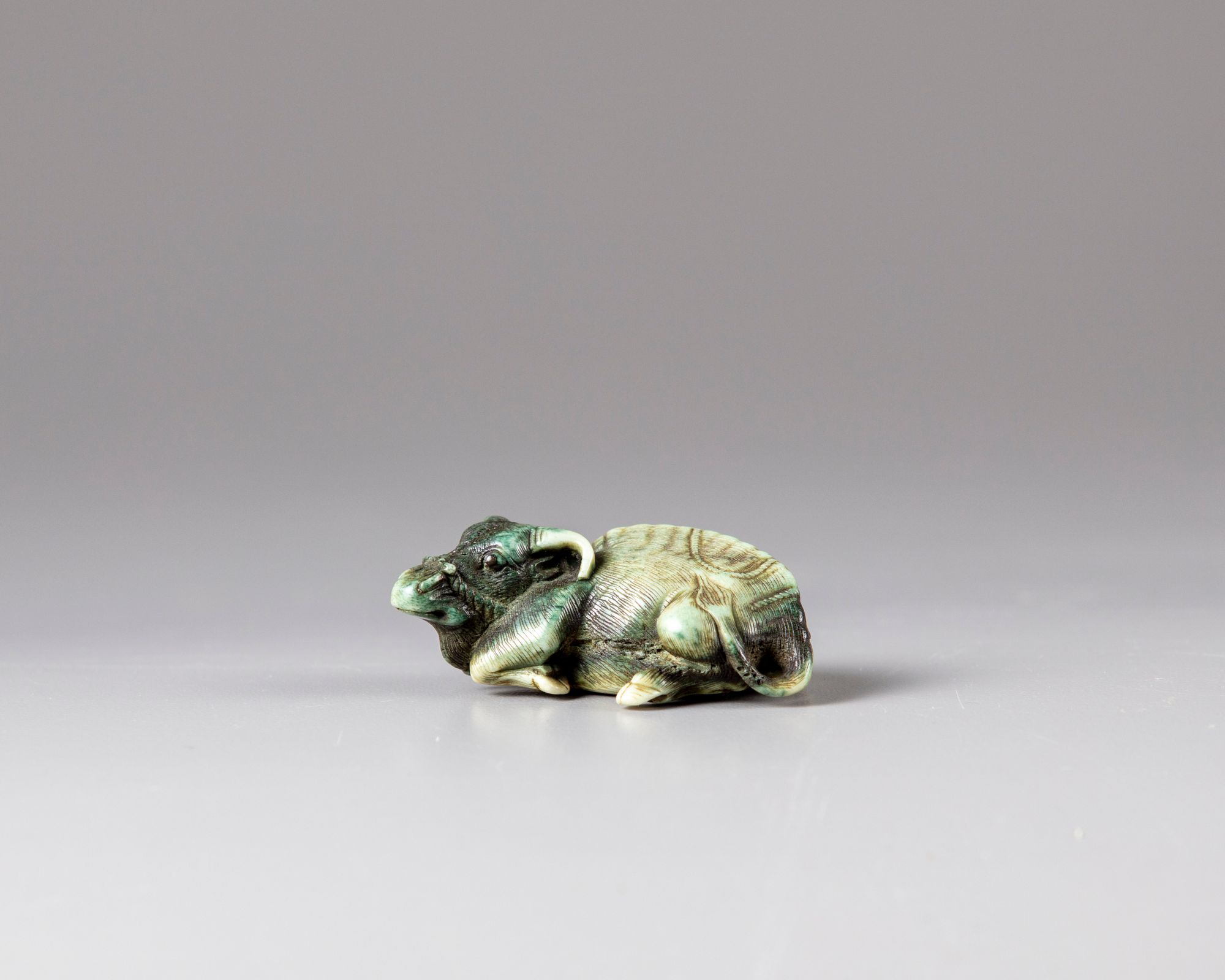 A Japanese bone netsuke of a recumbent ox, signed Tomatada, Kyoto school
