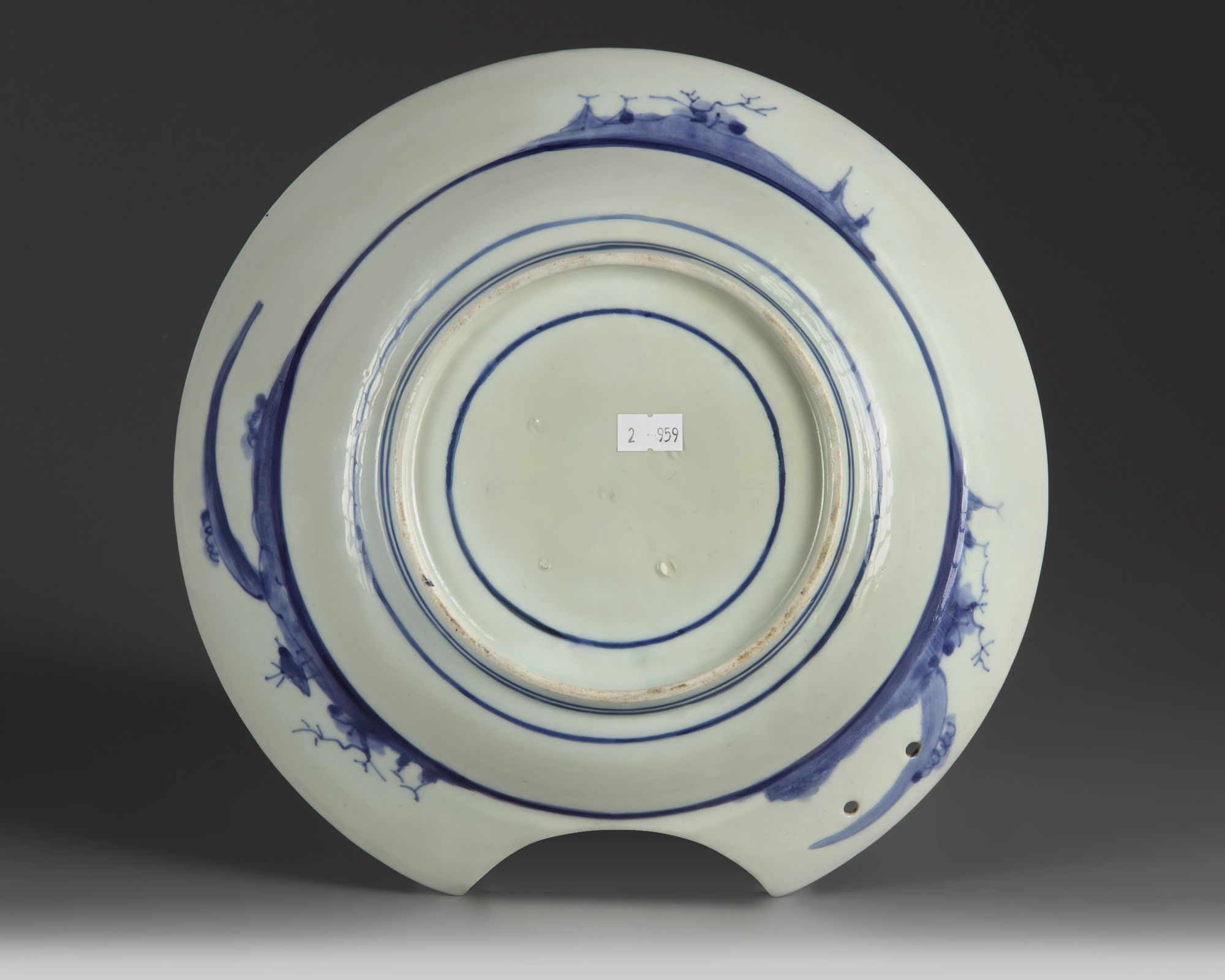 Decorated in underglaze blue with a bird in flight above peonies in a fenced garden. The reverse with three sketchy landscapes with a pavilion and trees. Three circles round the foot, one on the base.