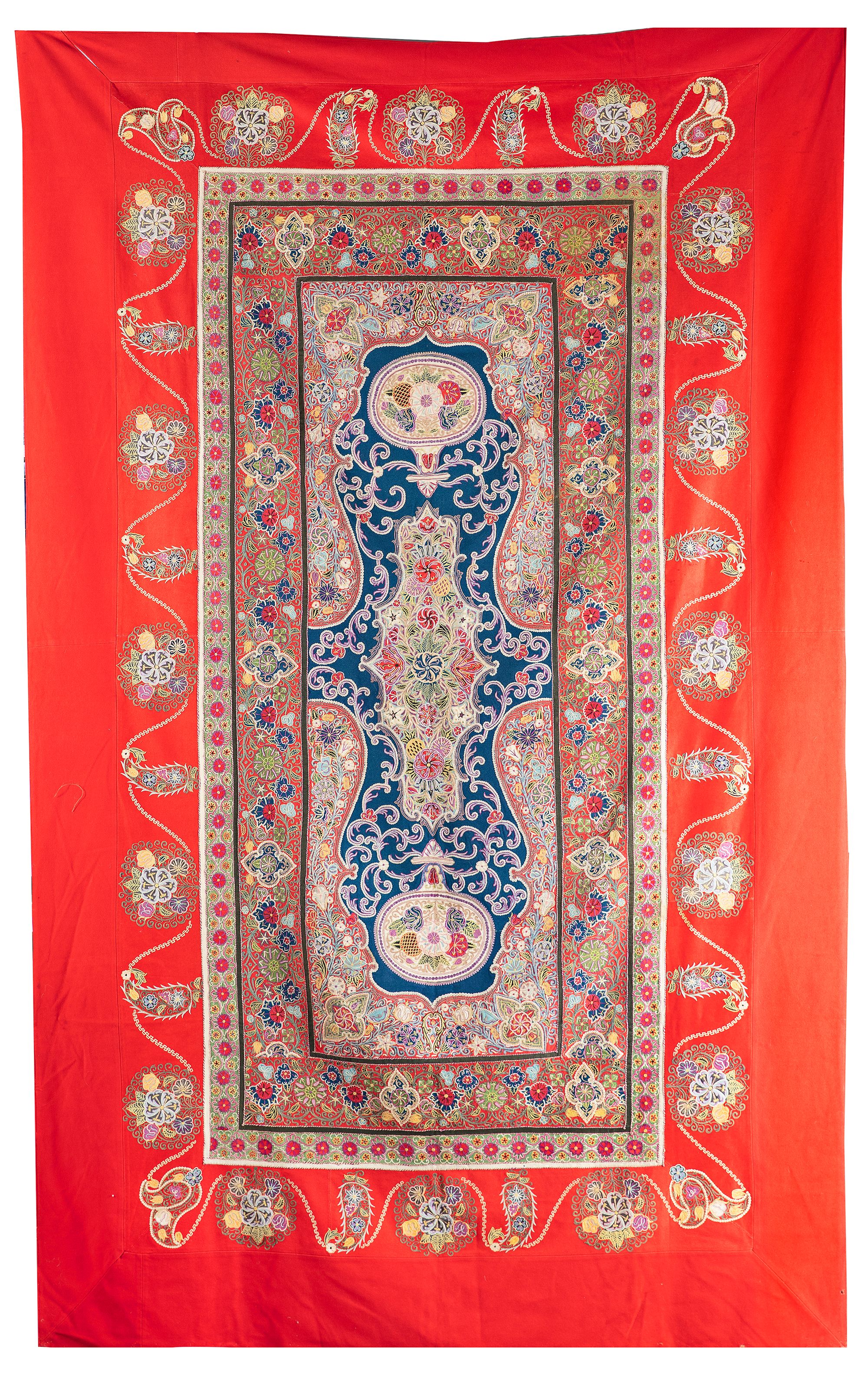 A wool floor cover applied and embroidered in coloured silks, with a central medallion, enclosed by borders worked with trailing floral vines.