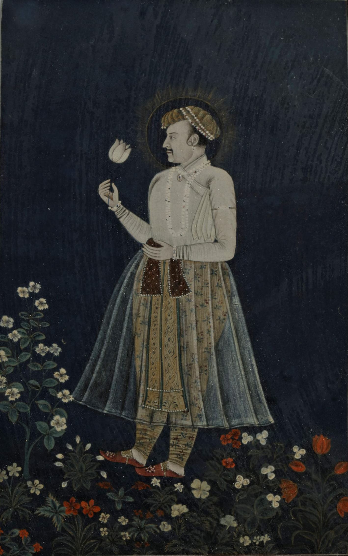 The painting depicts a dignitary figure standing amongst flower sprigs and holding a white flower in his hand with a halo around his head.