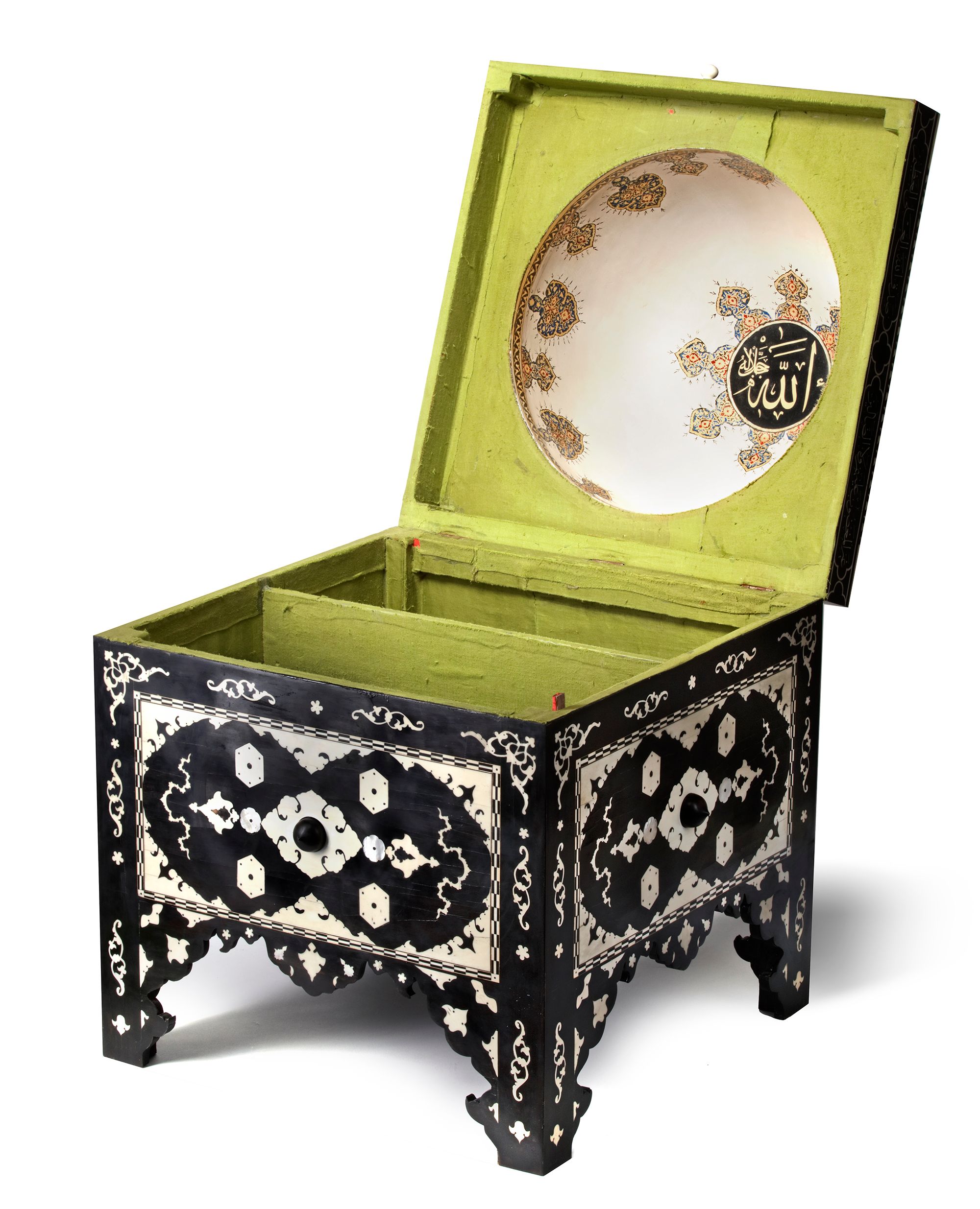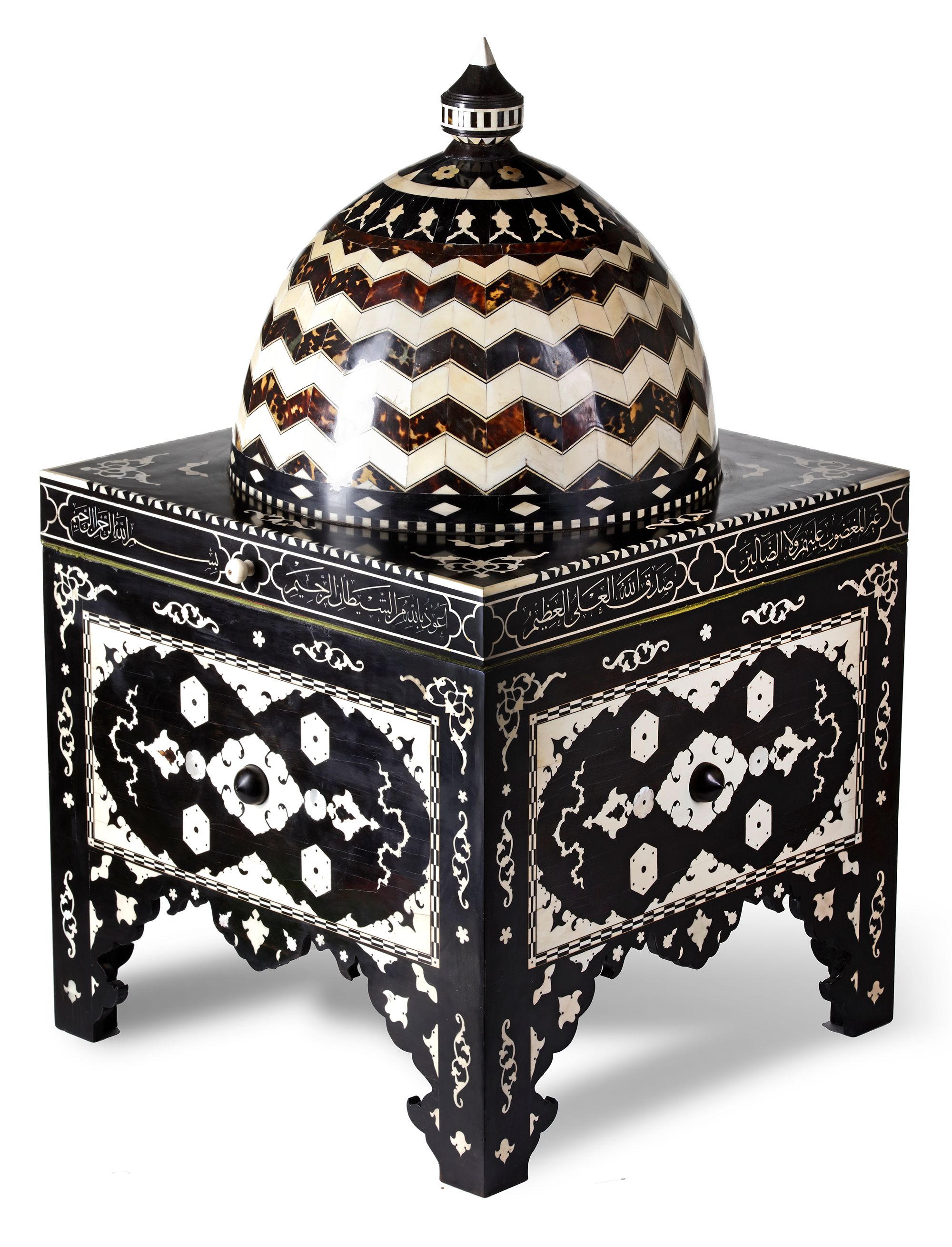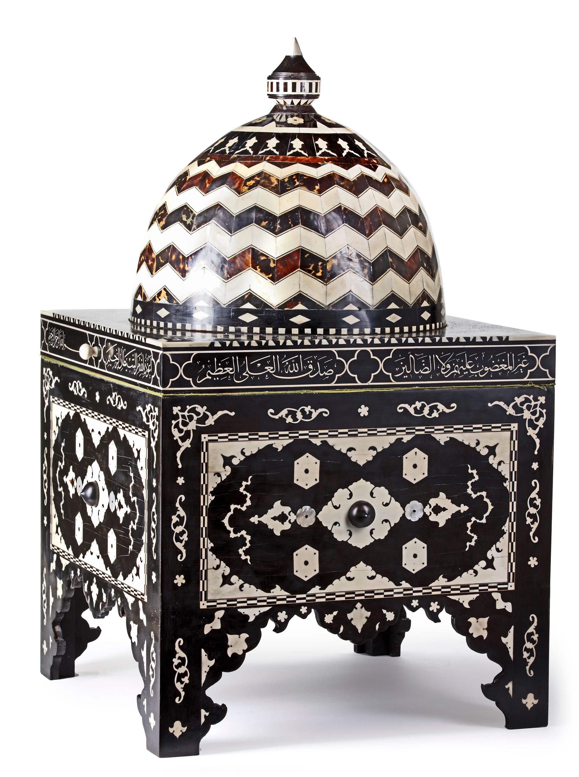 The cabinet was prepared in order to house sections of the Quran. It has two interior compartments. The interior of the dome is decorated with medallions made up of compositions of palmette and rumi (split-palmette) motifs painted on a background painted cream with lifazi aljalala.