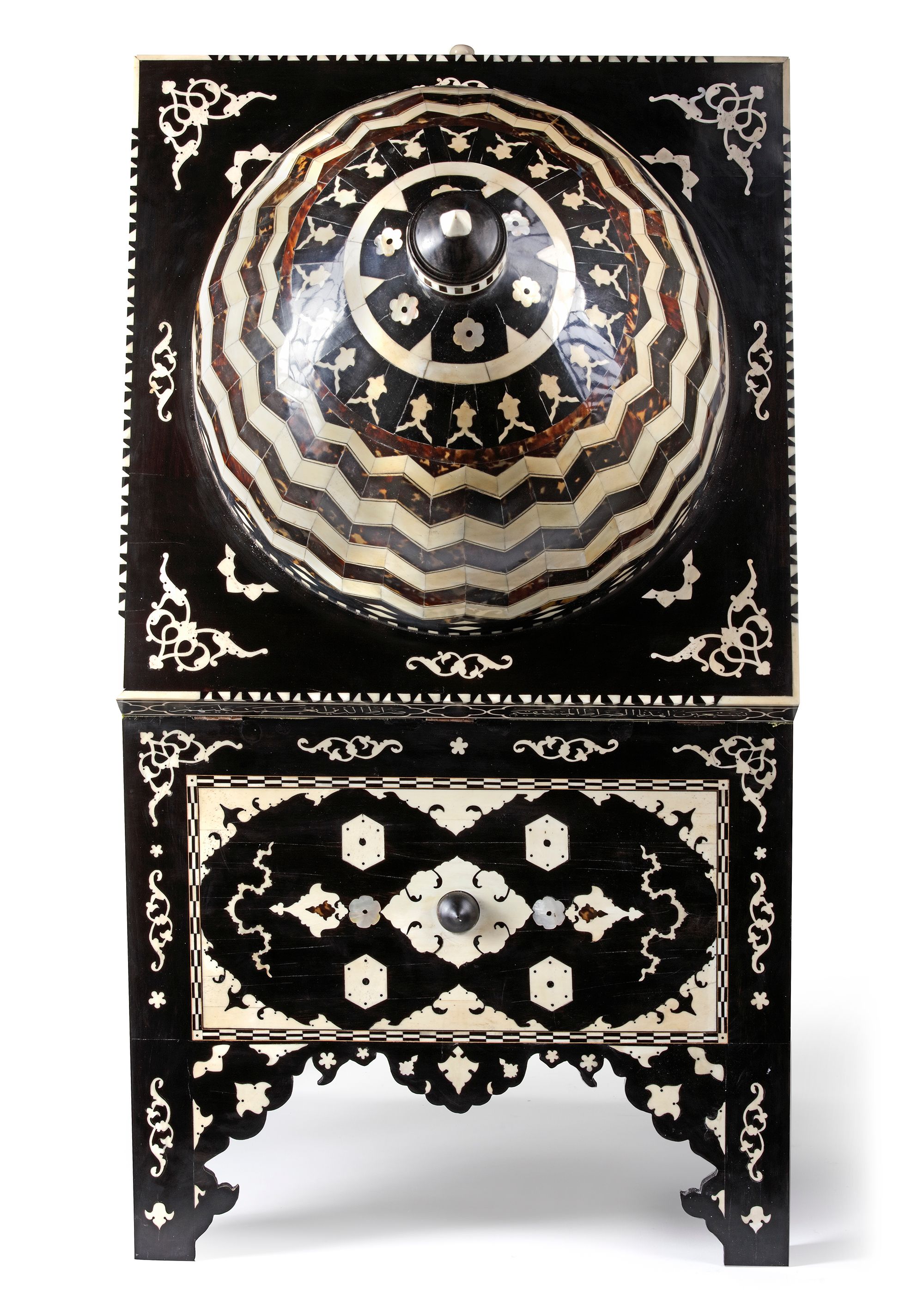 A four sided cabinet with short legs and domed cover. The decoration with wood and bone using the inlay technique.