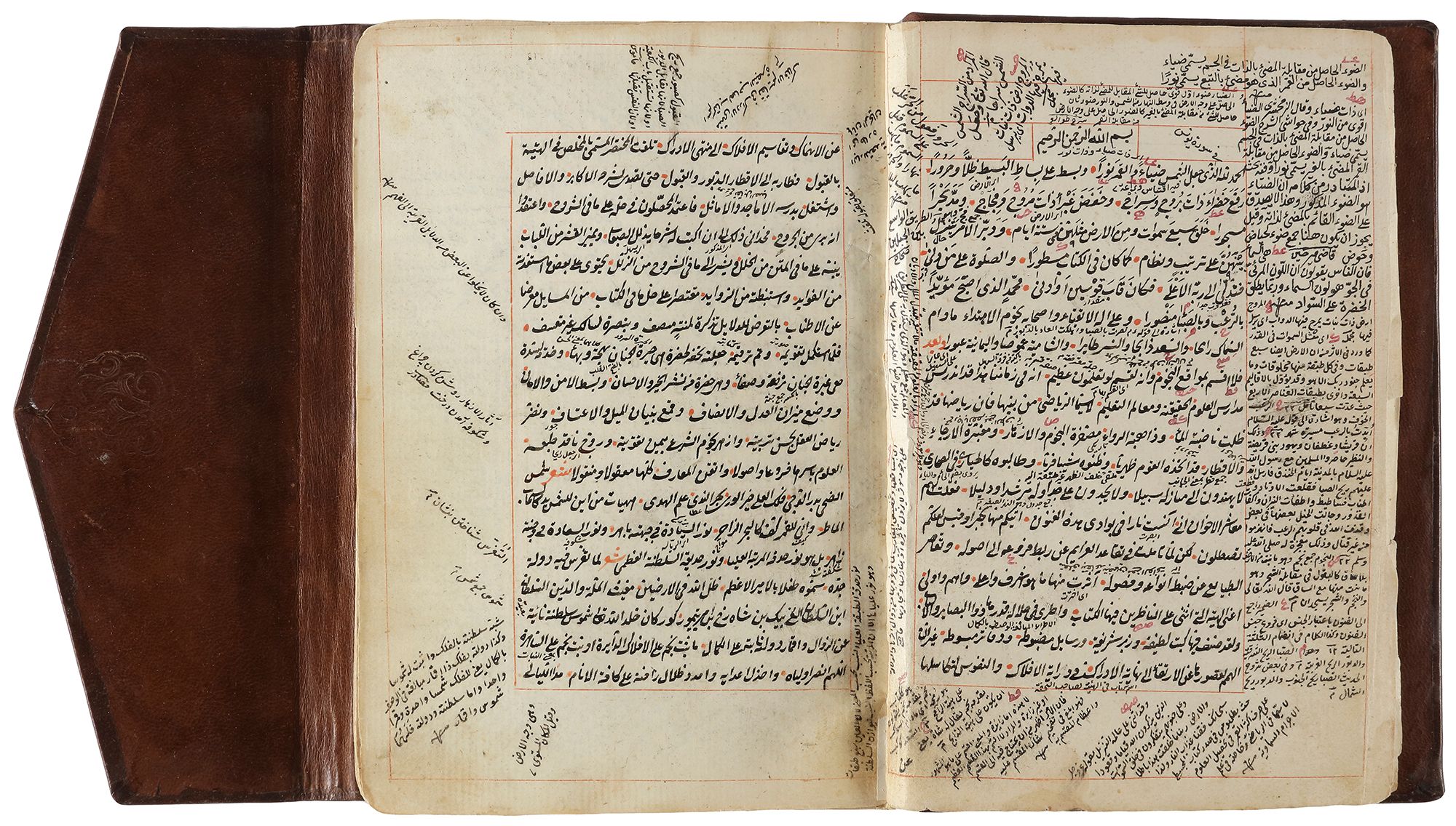 It contains 60 pages in 19 lines each, Nastaliq black ink with its marks, the topics in red ink, in addition to many illustrations, as well as plenty of comments and margins. The binding with brown leather and cupboard cover.