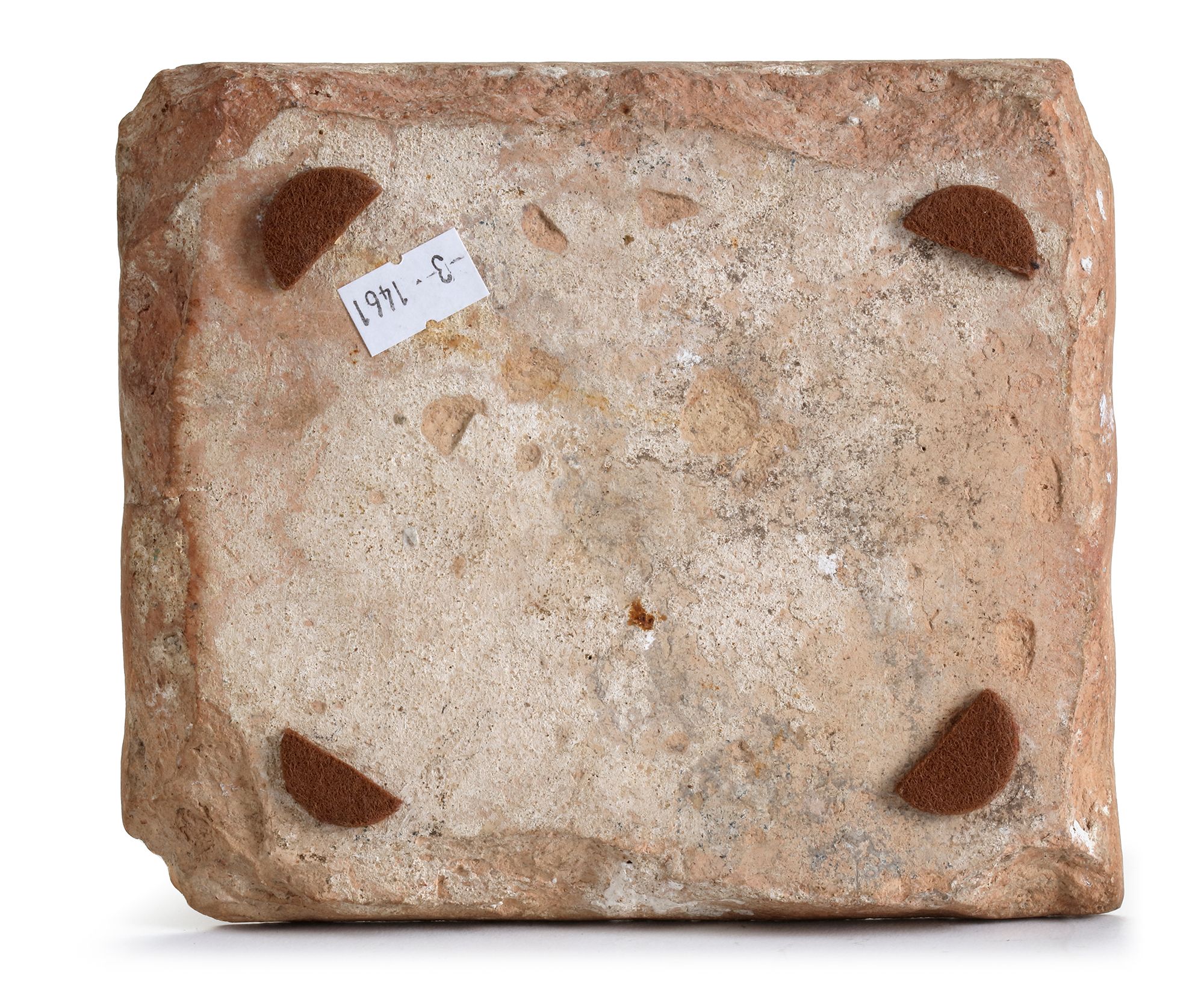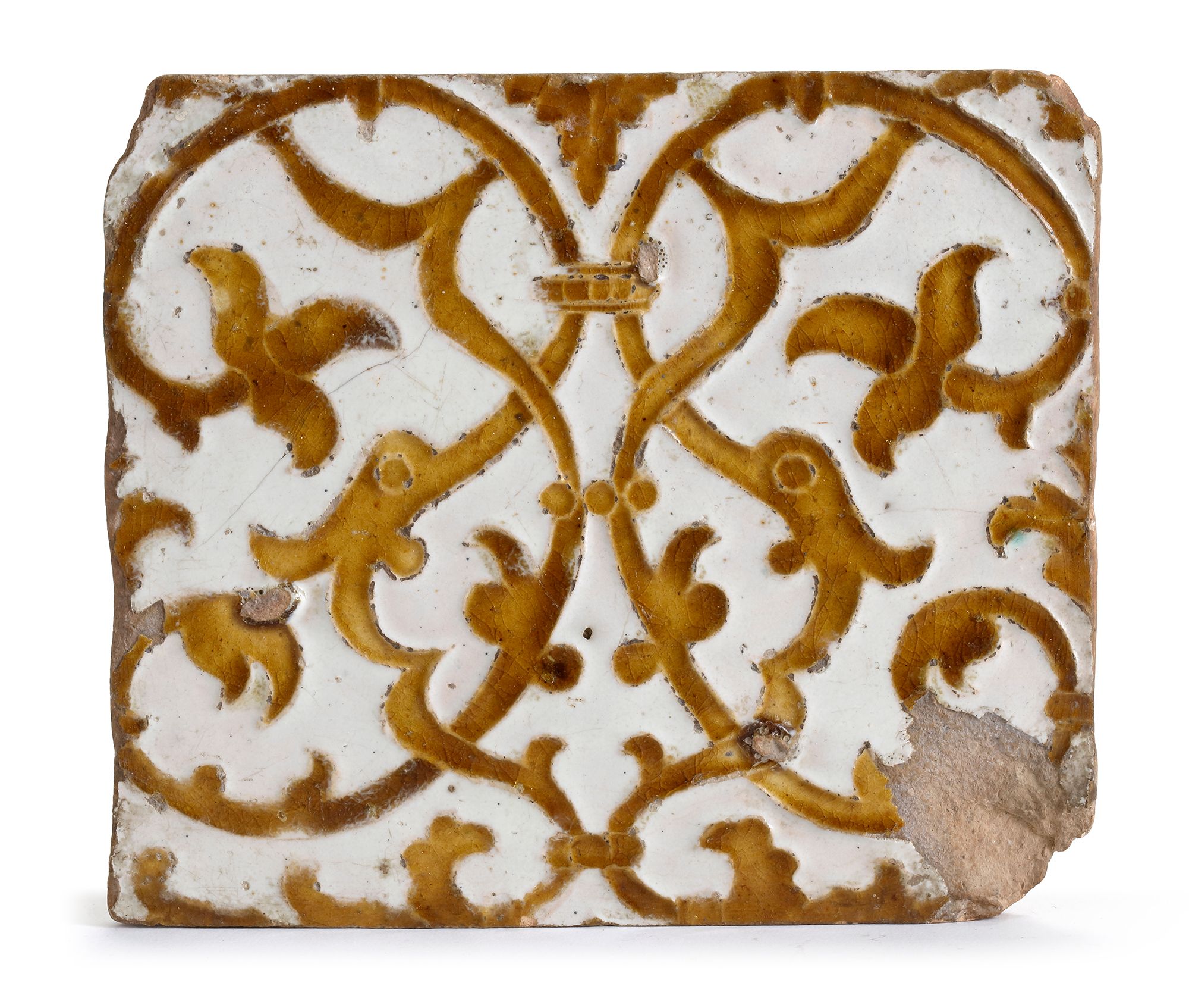 Of square form decorated with mustard yellow on a white ground, with an arabesque of interlocking tendrils issuing split and full palmettes.