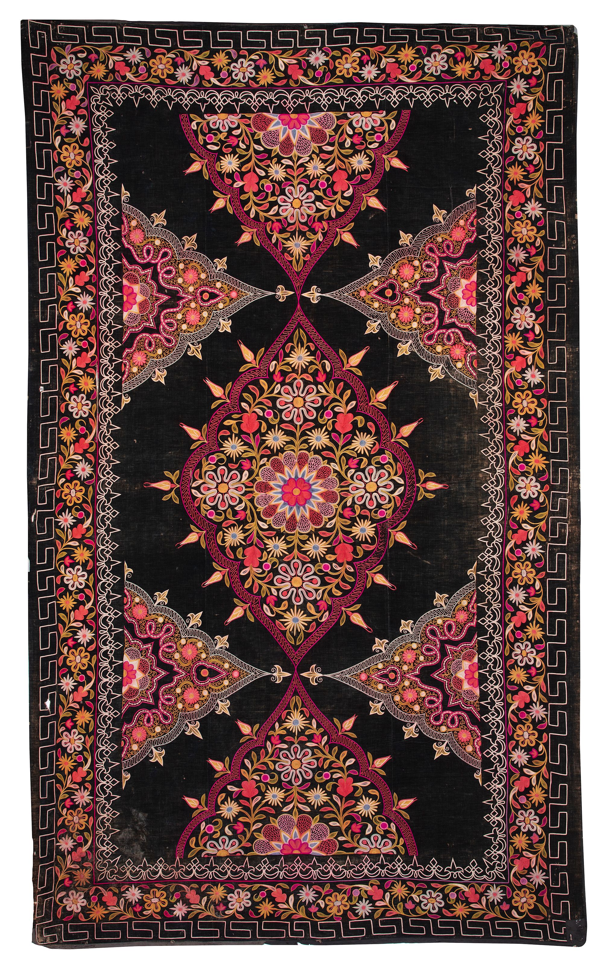 Embroidered in elegant colours with interlocking panels enclosing flowers and foliage with a floral border on a black ground. 240 by 140 cm.