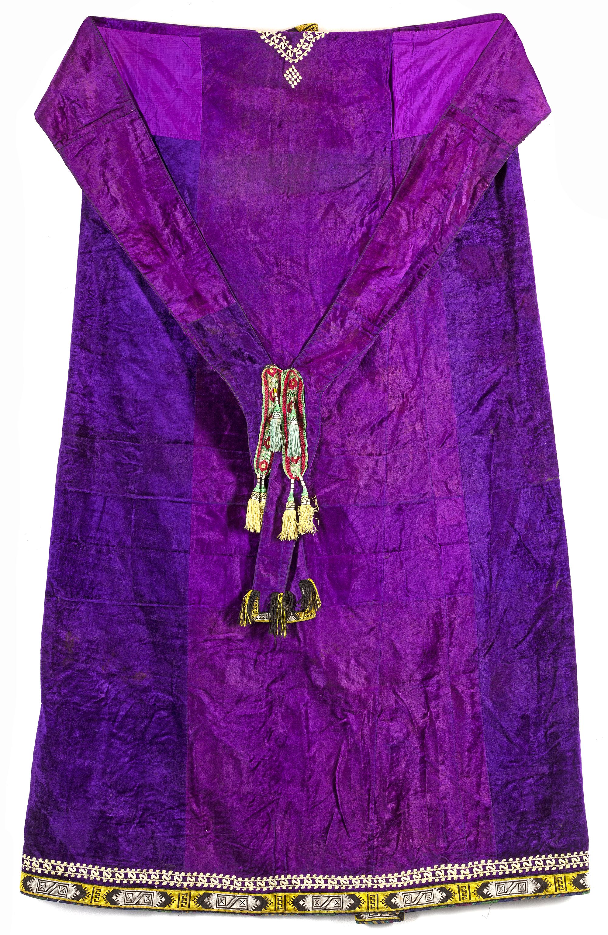 The paranja was a cape-like garment with long false sleeves that were fastened together and hung down the length of the back. Draped over a woman’s head, it was designed to envelop her completely. Most paranjas were made from “banoras” – a handwoven, silk warp/cotton weft cloth with narrow black pin stripes on a dark green, blue, or gray ground. Except for any embellishments such as tassels and embroidery, the overall look was rather drab.This elegant paranja is the exception. Made of lustrous taffeta that appears purple depending on the light, it was no doubt worn by a well-to-do woman on special occasions.While the outside of the paranja usually presented a rather plain face to the world, the inside was often lined with imported Russian printed cotton. The variety of patterns seemed endless, and often they were strikingly beautiful – seen only by the woman who wore them. The body of this paranja is lined with a traditional paisley print. However the wide facing material is unusual – the pattern was obviously inspired by a Japanese design.
