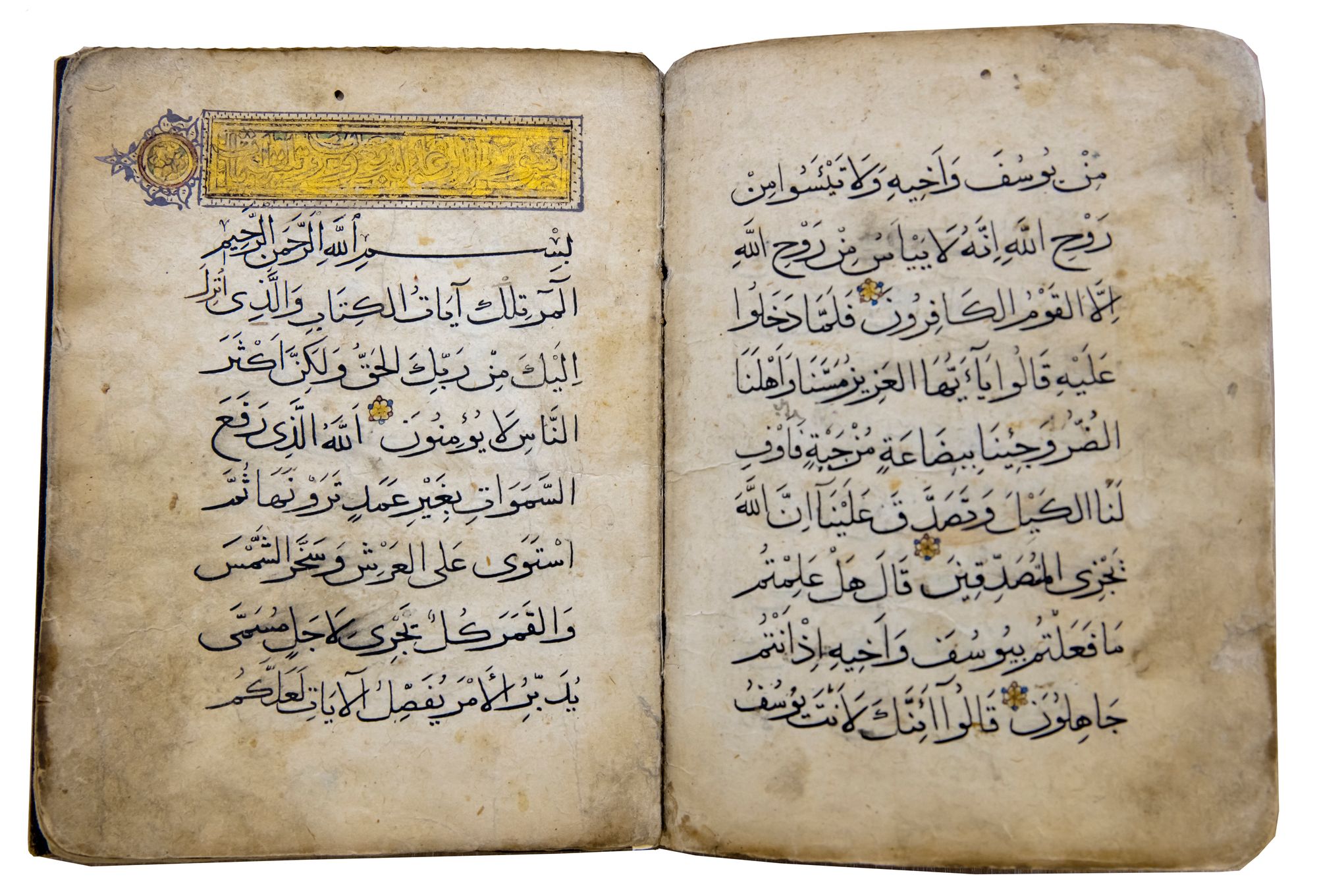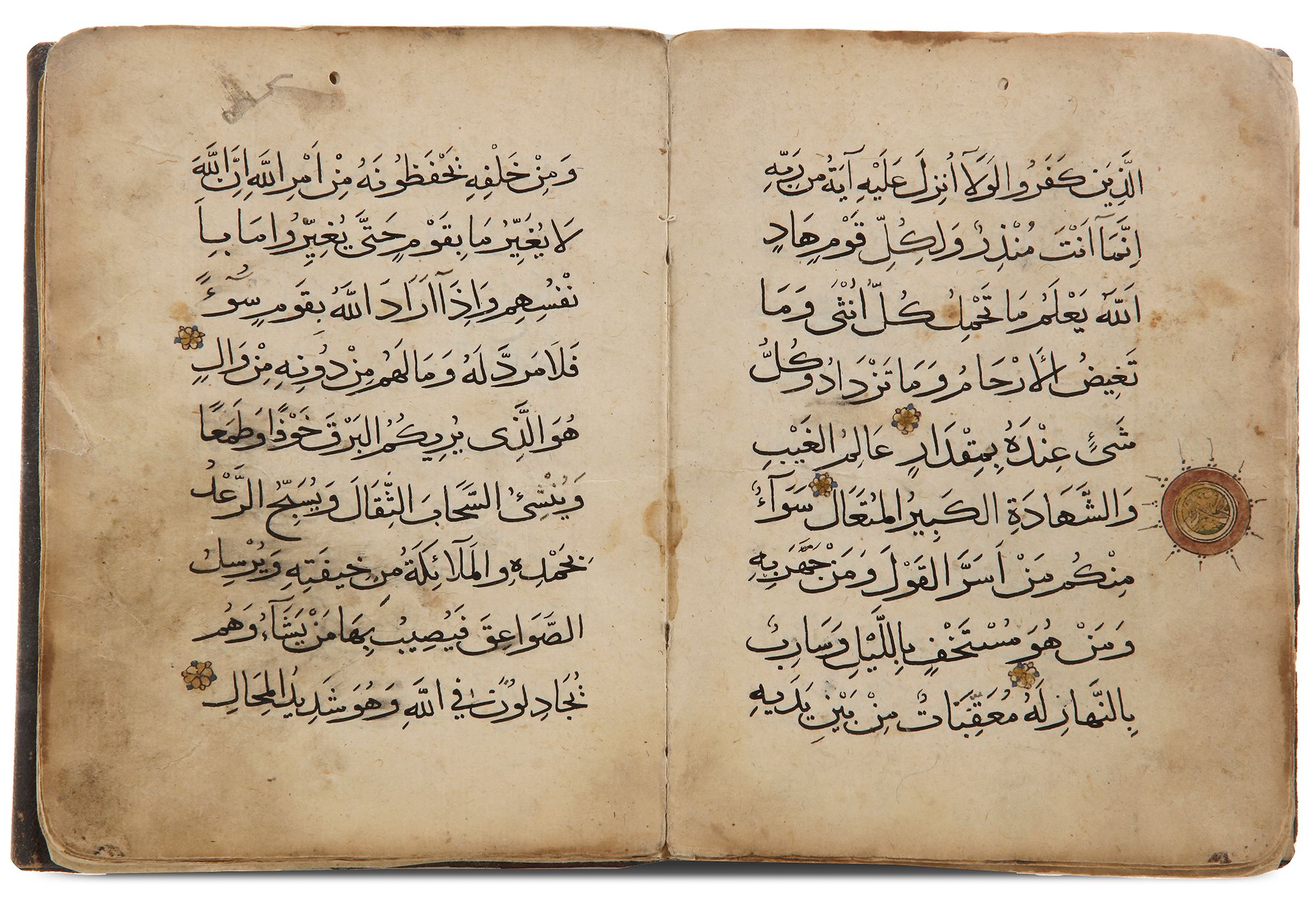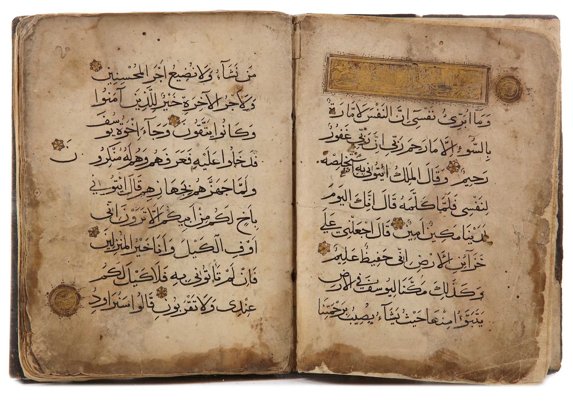 comprising text from Juz' 13: surah Yusuf (12:53) to Ar-Ra'd (13:22), then Ibrahim (14:814:45), together 18 leaves (plus 2 flyleaves), single column, 9 lines black muhaqqaq, surah headings outlined in black against gold banners, decorative marginal ornaments in gold, heightened in red and black, roundels marking the verses throughout in gold, red and blue, contemporary notes to recto of first leaf, some smudges and light staining, a few outer edges of leaves stained.