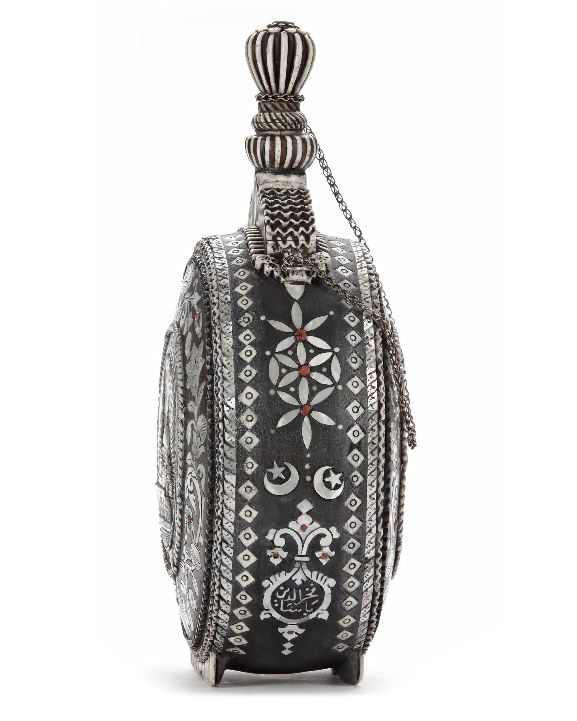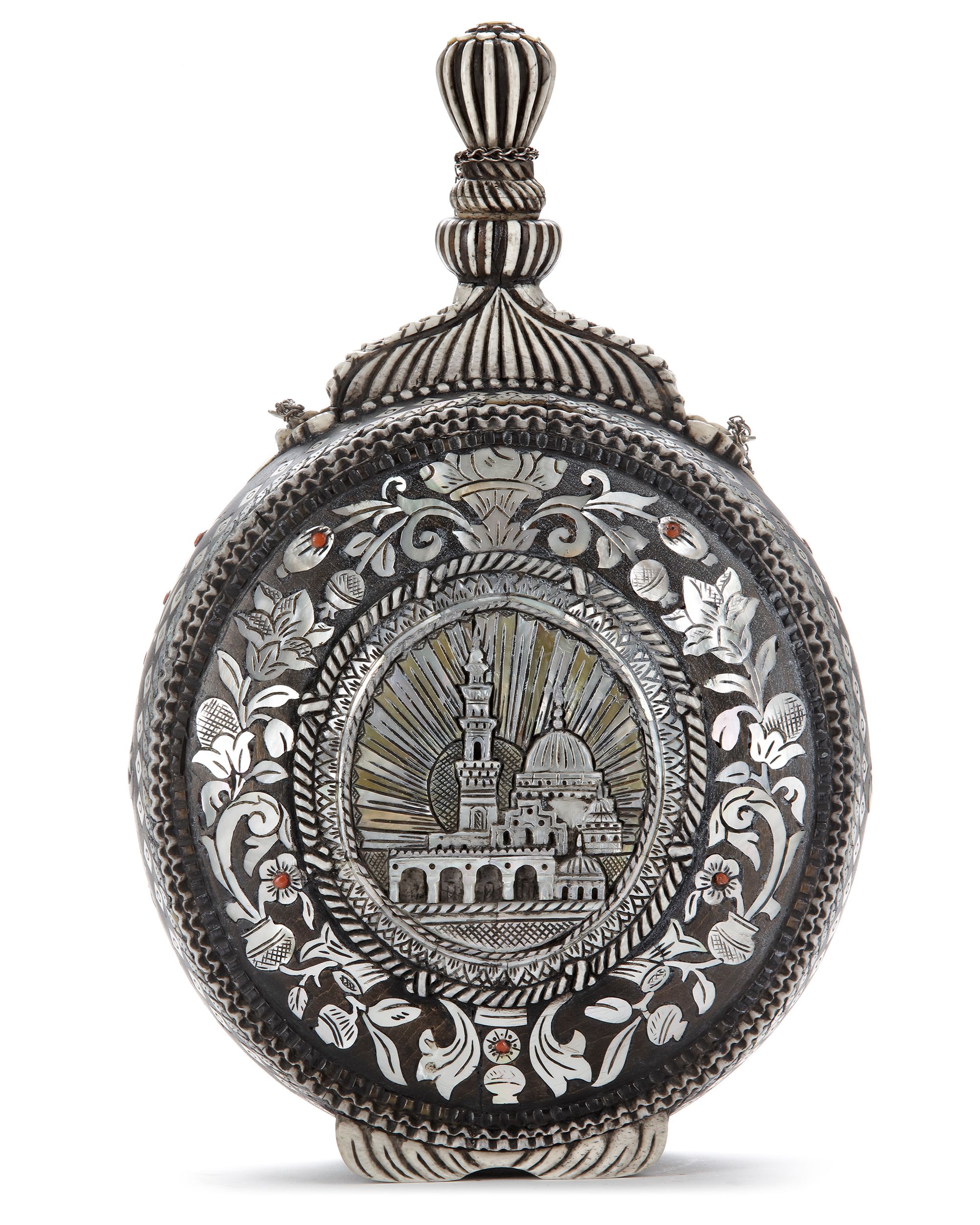 An Ottoman wooden moonflask set on both sides with a floral roundel enclosing the Kaaba in al-Masjid al-Haram and al-Masjid al-Nabawi, stylized in mother of pearl with floral sprays issuing from a vase.