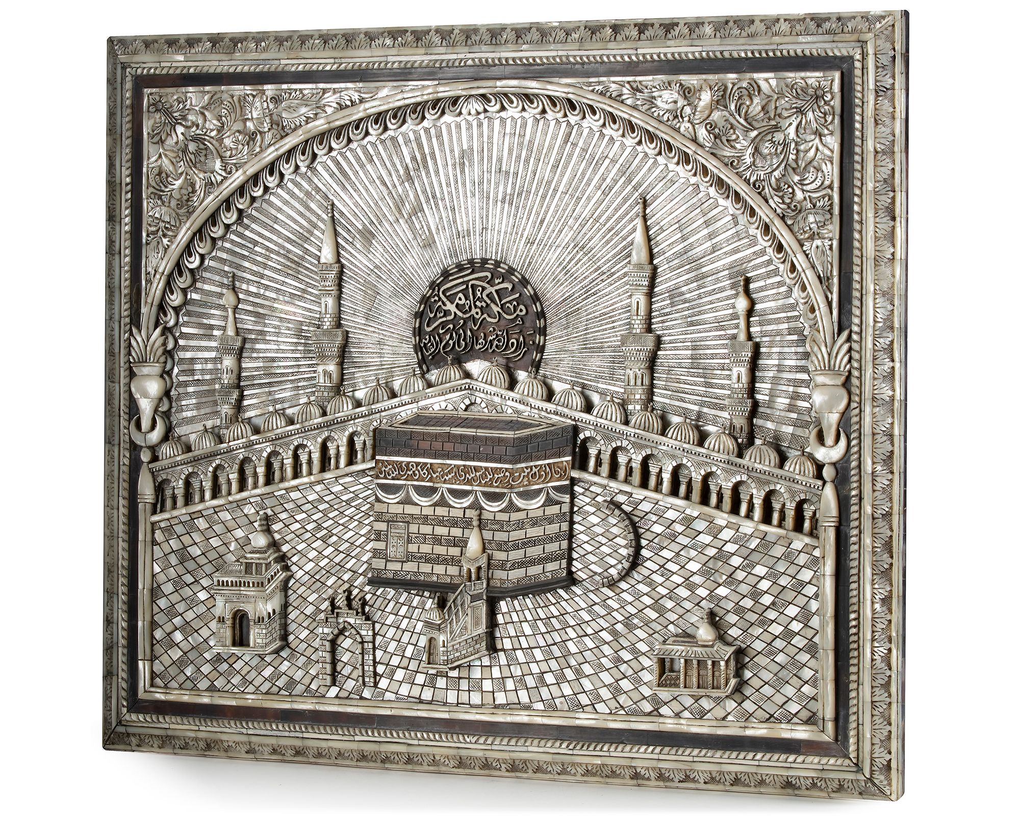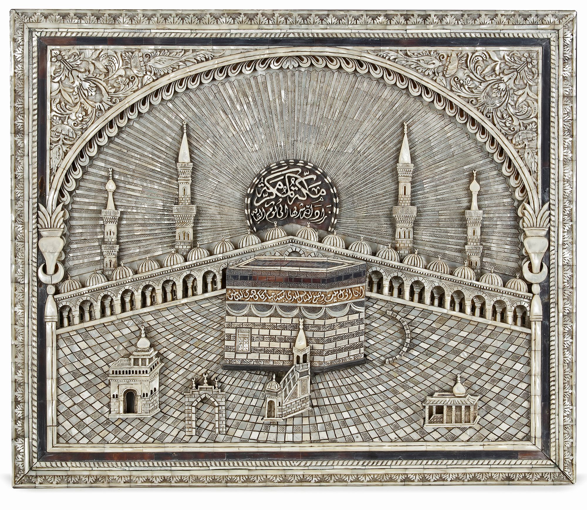 Of rectangular form and inlaid with mother-of-pearl in low relief on a wooden panel, depicting Al-Kaaba in Al-Masjid Al-Haram with Haijr Ismail, zamzam well, Minbar and Hanbli maqam.