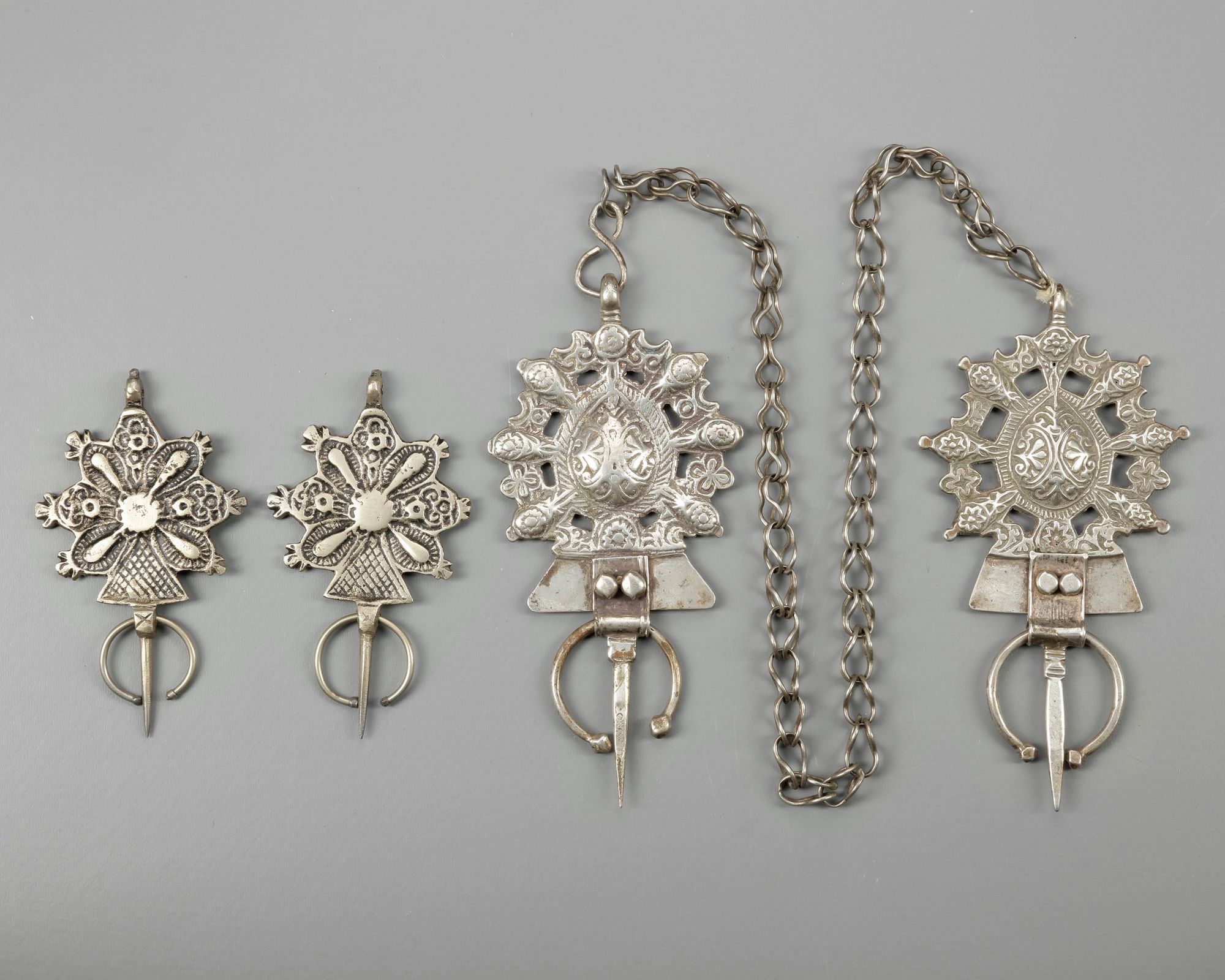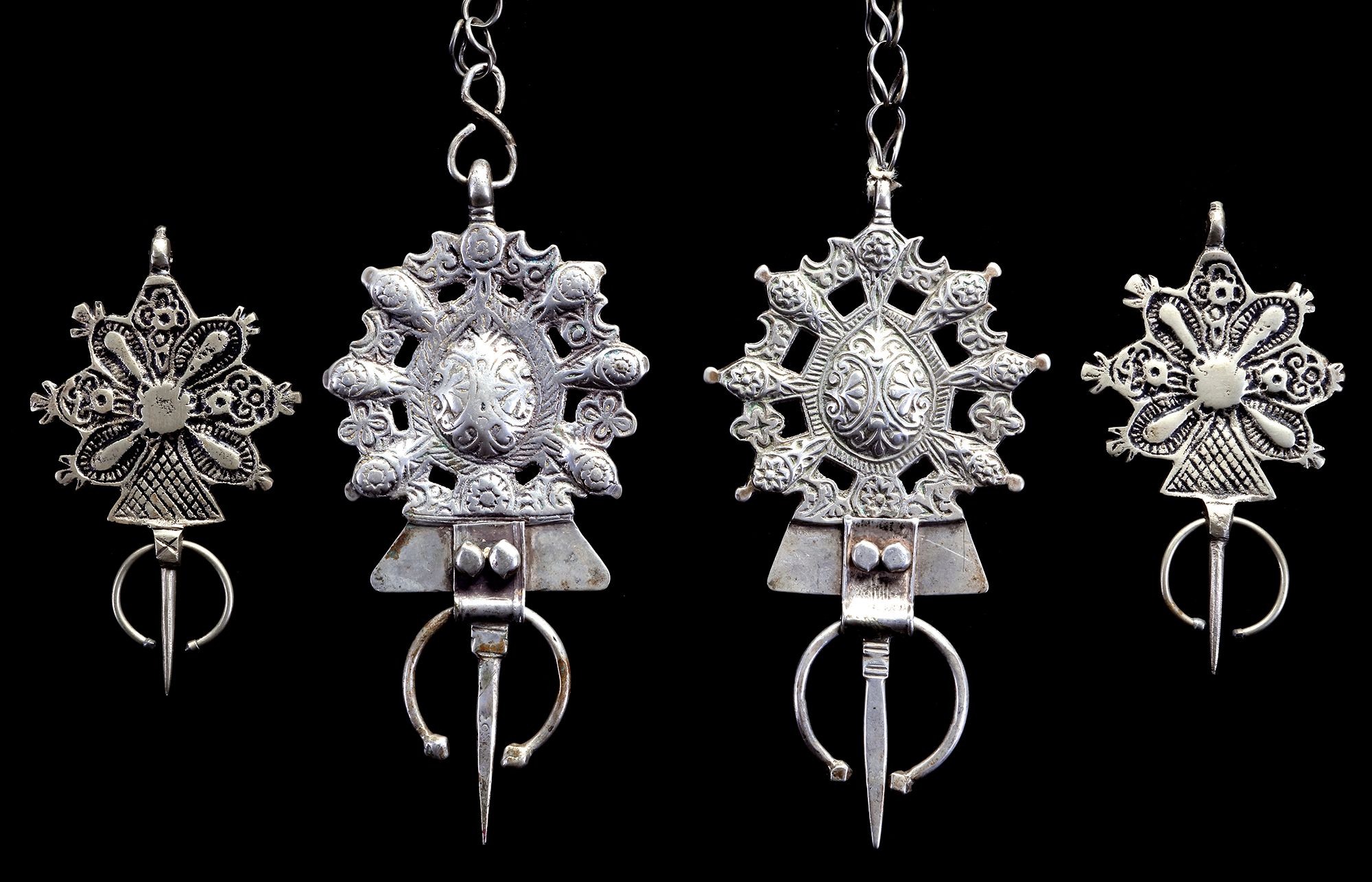 Fibulae were commonly worn by women as an everyday adornment whilst going about daily work as well as on special occasions. It is essentially a cloak fastener, comprising an ornate metal triangular, round or oval shape with detailed etchings in filigree or enamel, and a pin which serves to fasten two layers of material together. They were usually worn as a pair. These type of Fibulae are worn by Berbers, the indigenous ethnic group of North Africa. Weight: 453 gr.