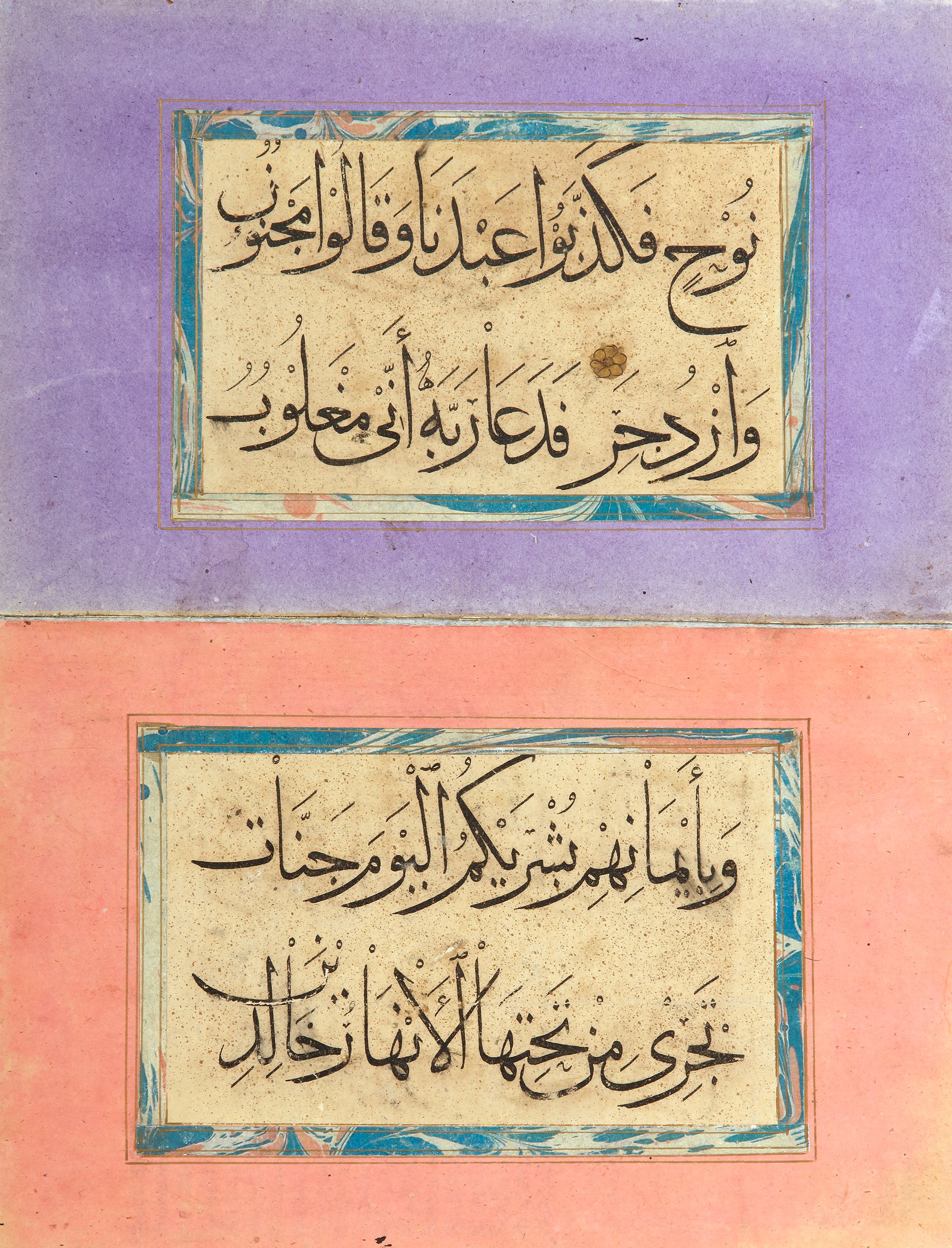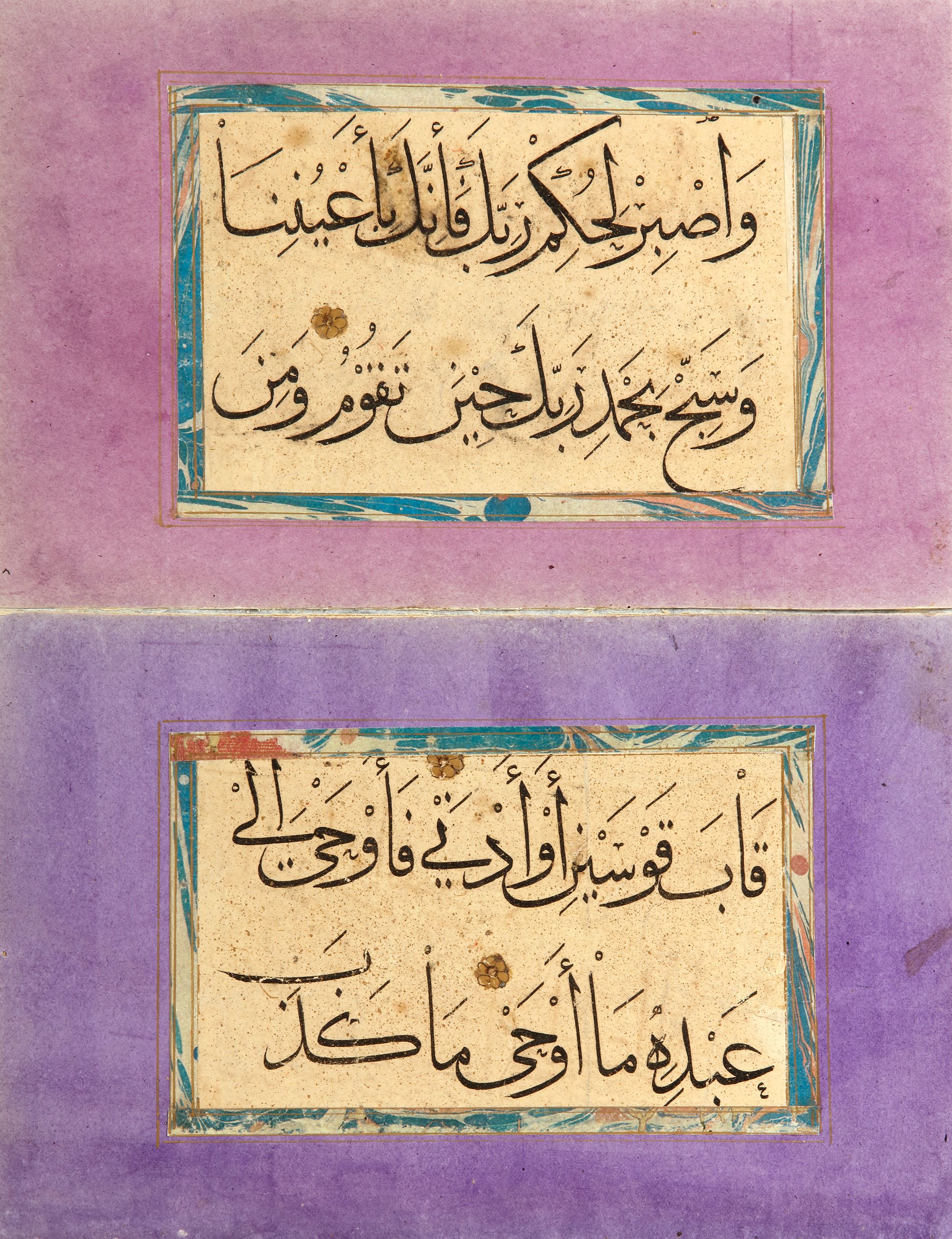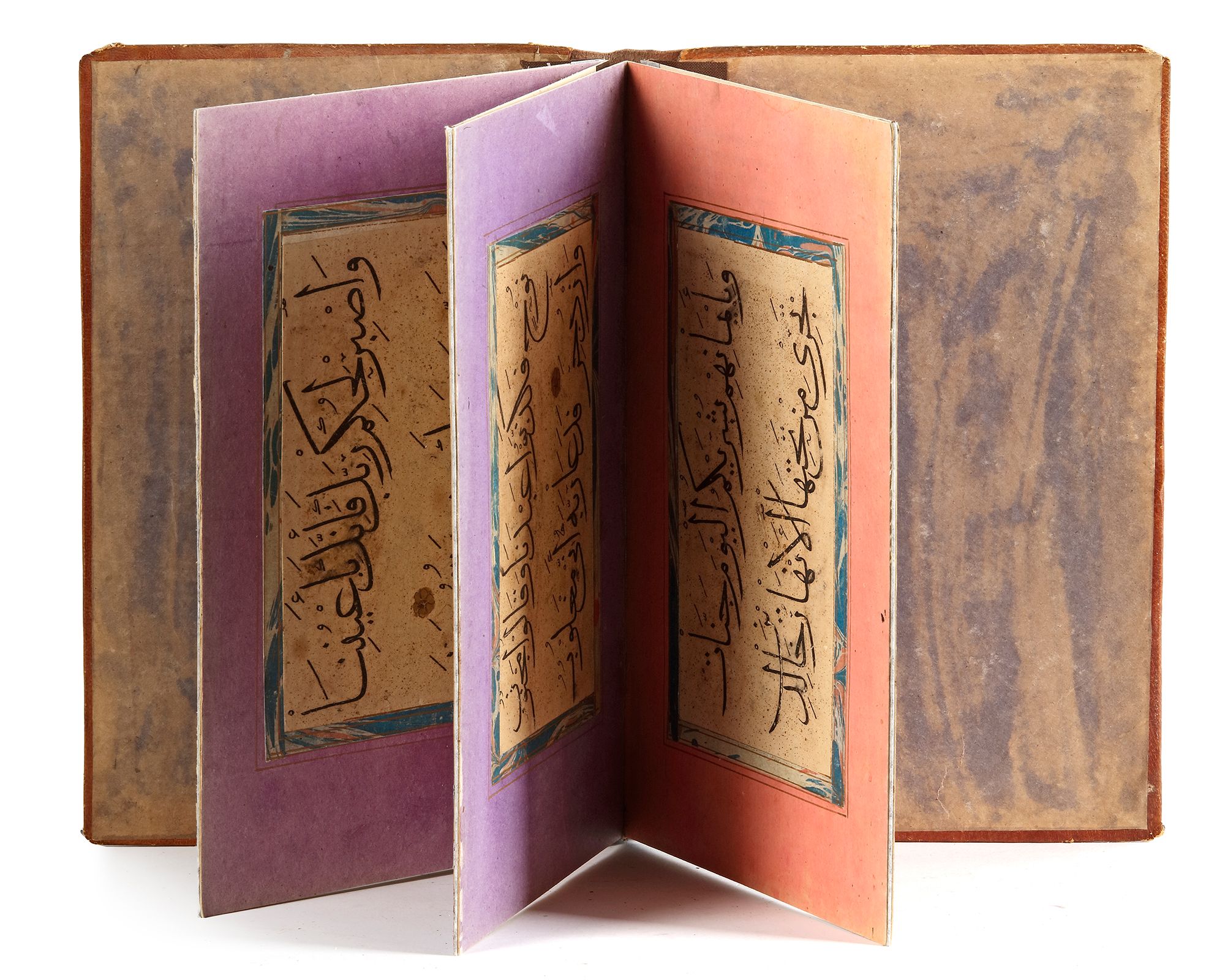 Black ink on gold-speckled paper, 6 folios, each with a panel of two lines of large strong black thuluth script, with gold and polychrome rosette verse markers, final folio with later attribution to Ahmed Karahisari in black tawqi' script, laid down on card with colored borders, in simple stamped brown morocco binding.