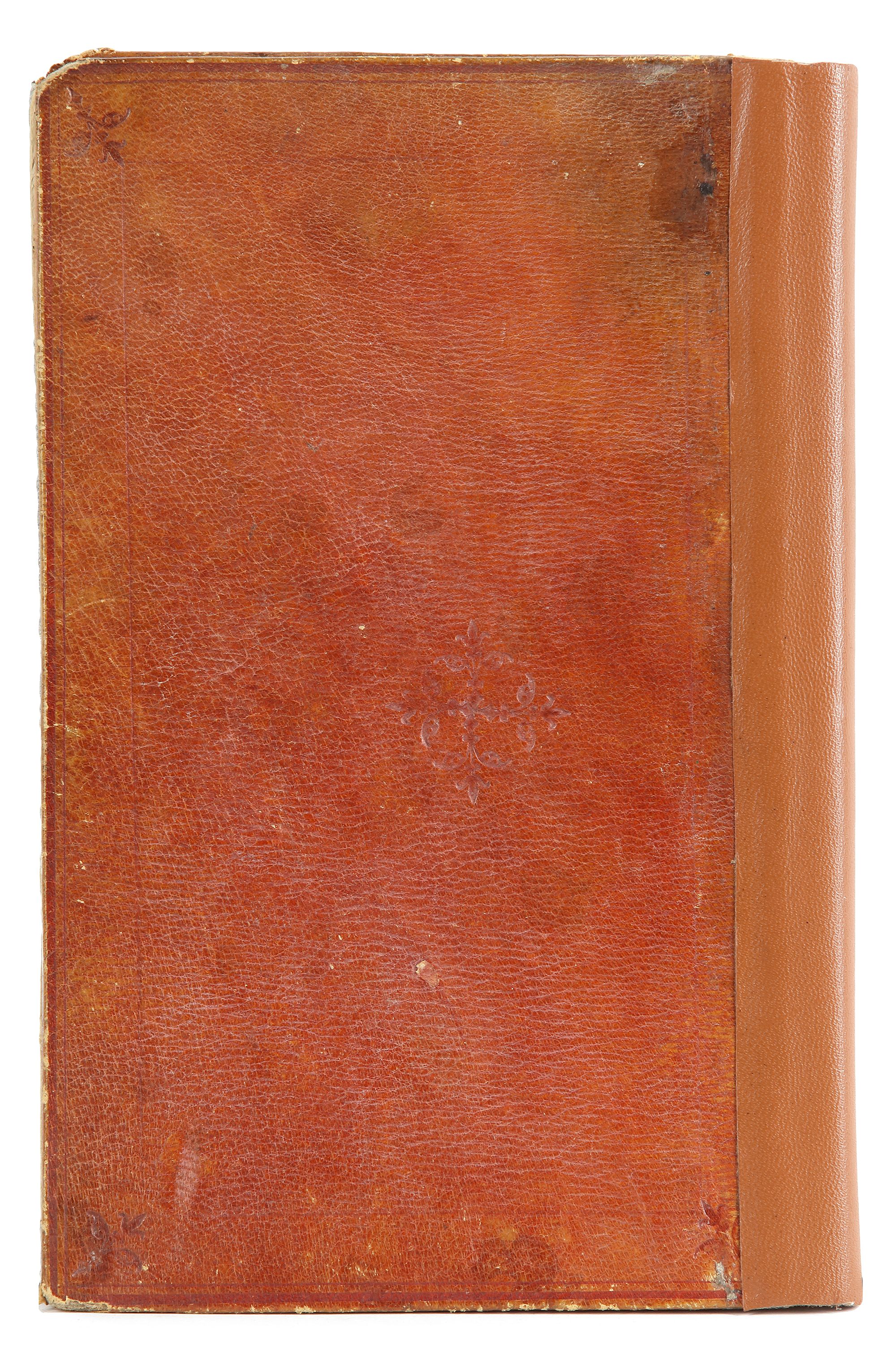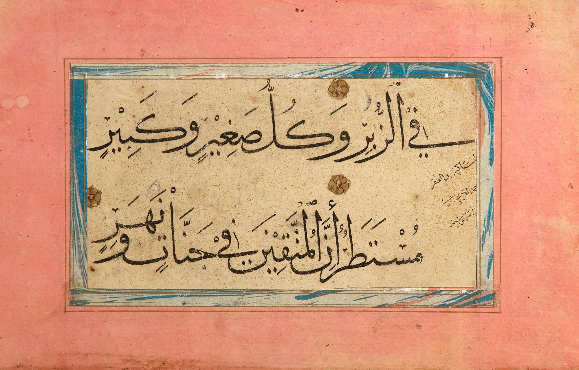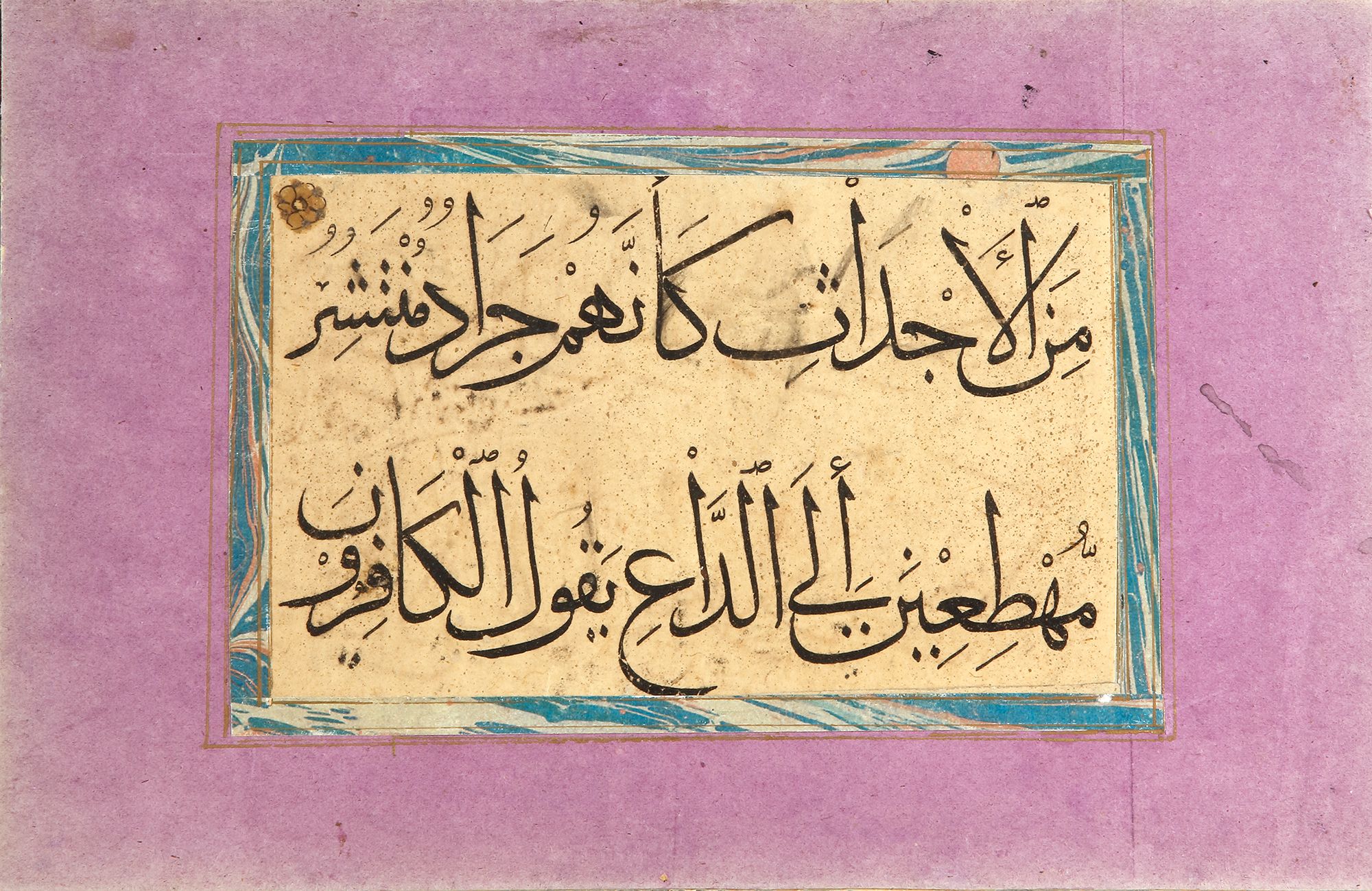 Black ink on gold-speckled paper, 6 folios, each with a panel of two lines of large strong black thuluth script, with gold and polychrome rosette verse markers, final folio with later attribution to Ahmed Karahisari in black tawqi' script, laid down on card with colored borders, in simple stamped brown morocco binding.