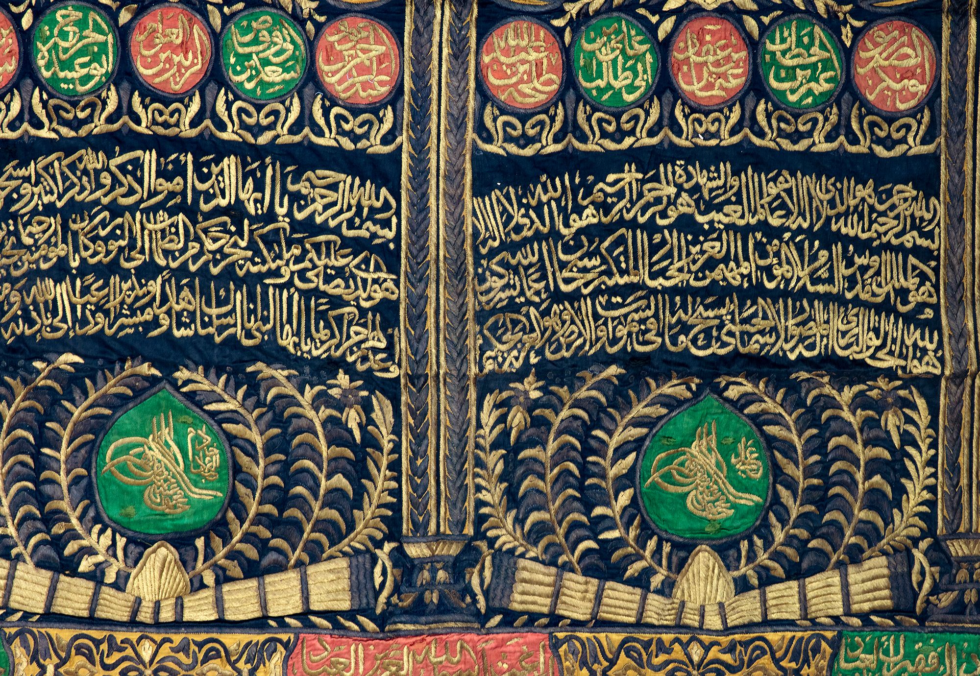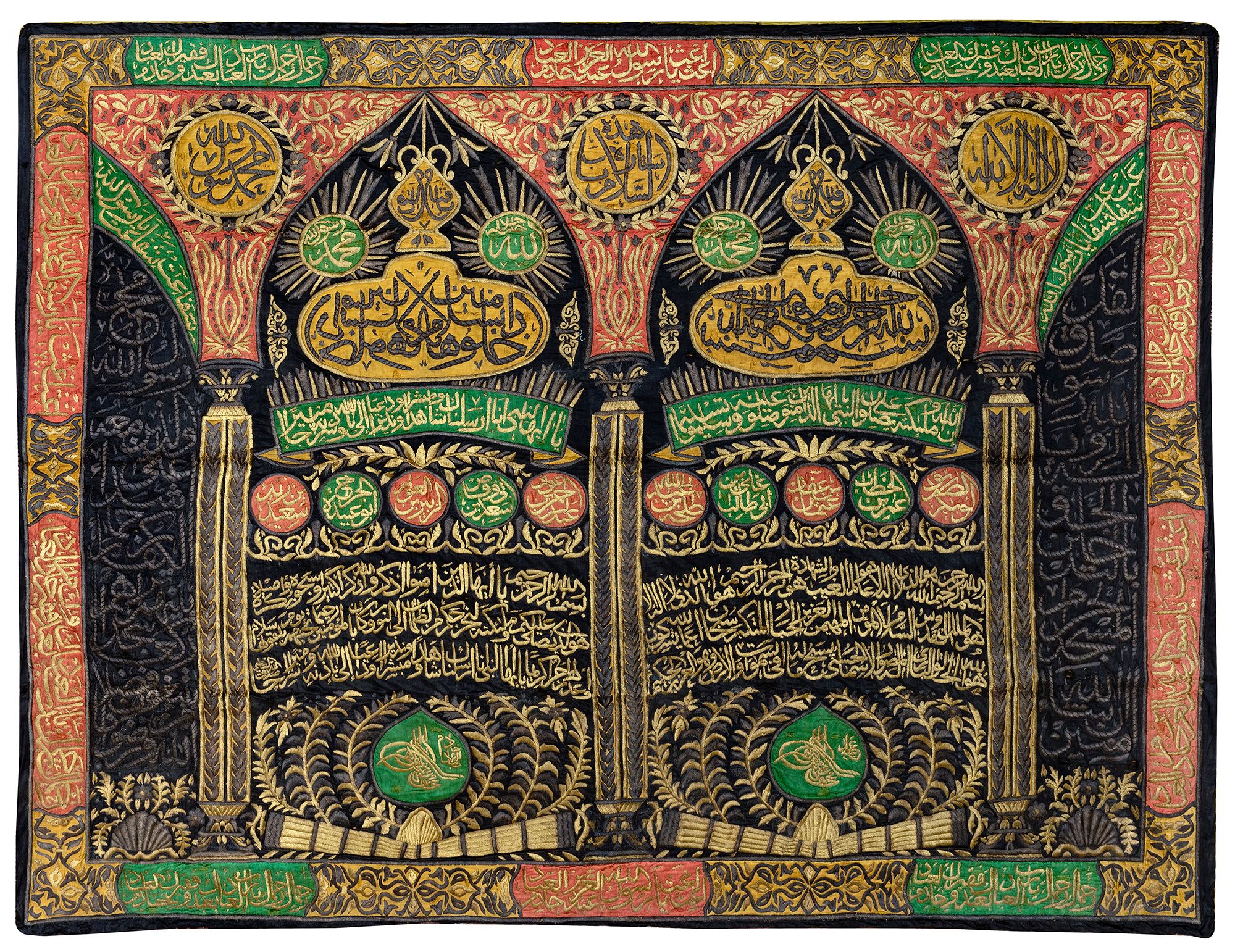 Of rectangular form, embroidered in silver and silver-gilt thread over a black silk ground, the surface broken into cartouches of various shapes and sizes containing inscriptions in naskh and thuluth script, the interstices filled with vegetal designs. The main design of consists of two large calligraphic mosque lamps framed by an arch with wreath and garlanded spandrels supported by twisted columns, enclosing wreaths and inscriptions with the tughra of Sultan Mahmud, further ruled by cartouches enclosing inscriptions and Arabesque scrolls.