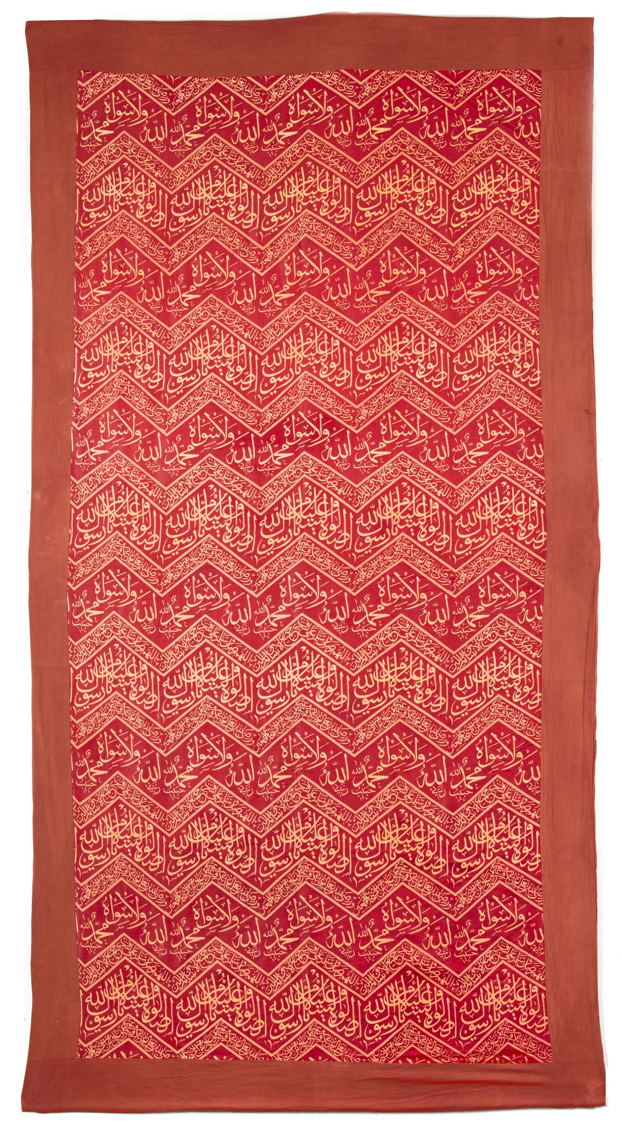 A fragment of silk hanging panel of the inner kiswa, with an inscribed weave in cream color over a light red silk ground. Embellished with a prominent inscription within a broad border in thuluth script of praise of the prophet ‘Prayer and peace be upon you, O Messenger of Allah’. Below with a narrow band containing prayers for the four righteous caliphs Abu Bakr, ‘Umar, ‘Uthman and ‘Ali as well as for the companions of the Prophet.