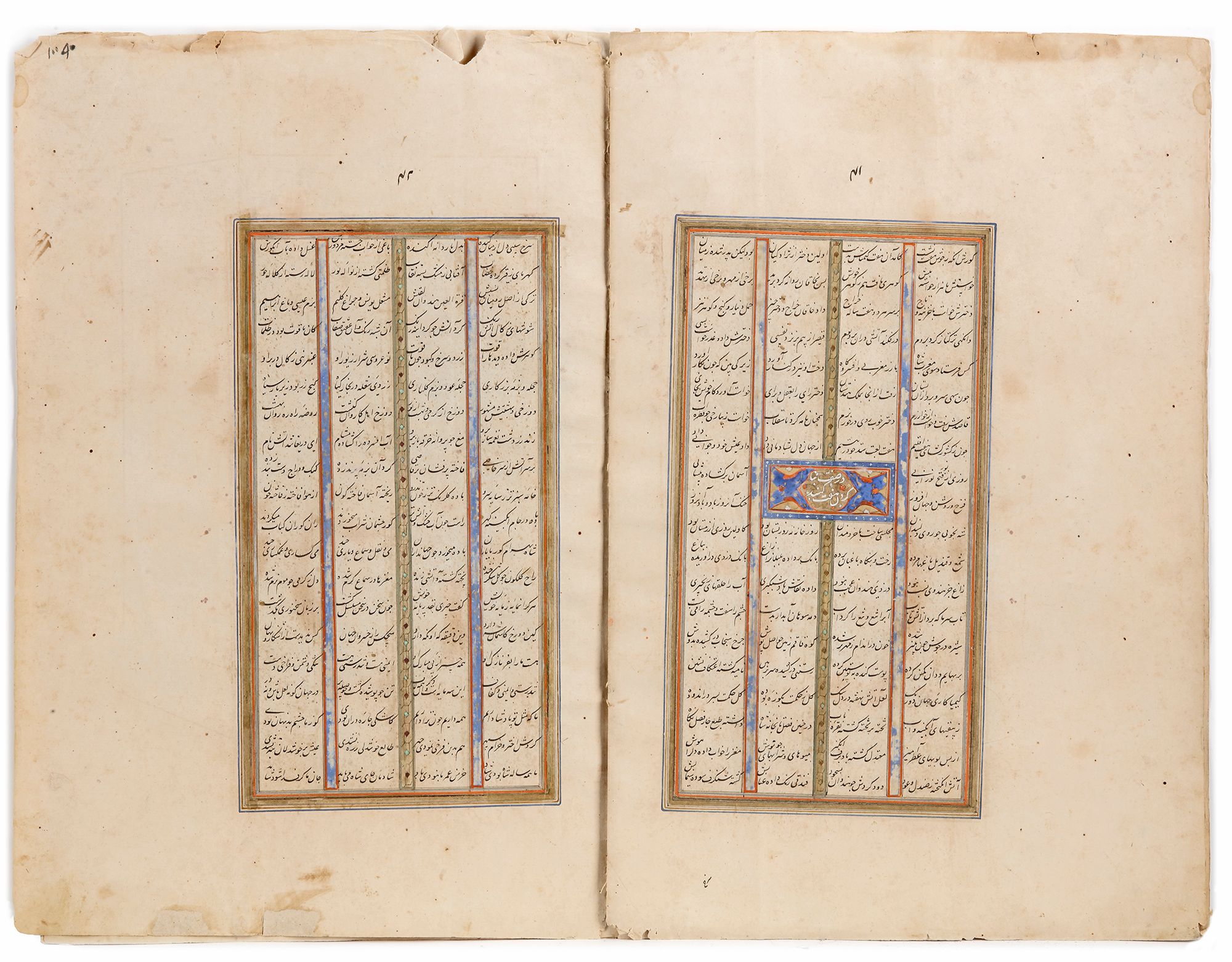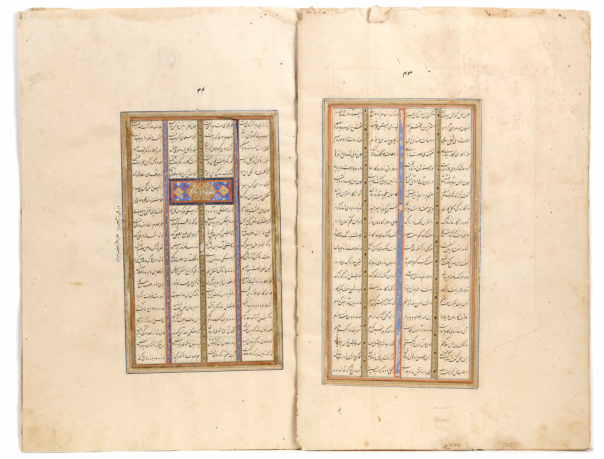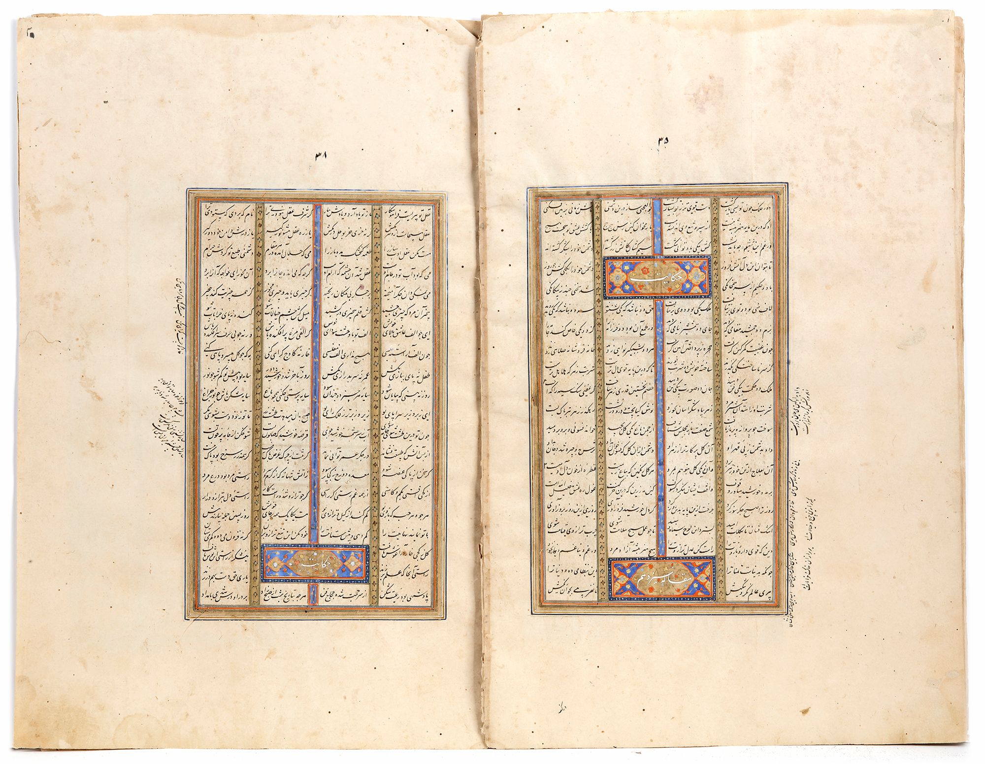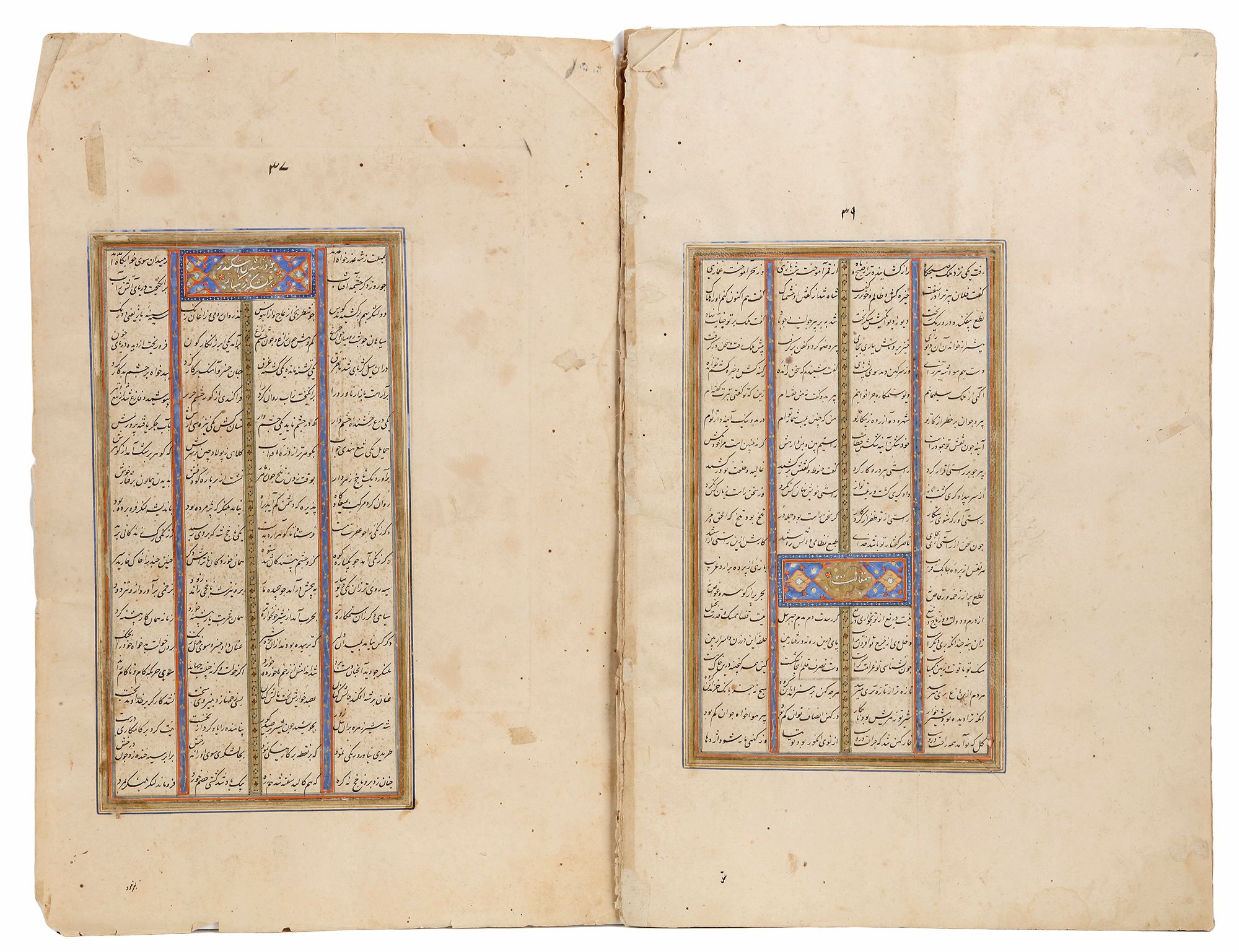 Persian manuscript on paper, 7 leaves with 20 lines to each page written horizontally in four columns of neat nastaliq script on paper, intercolumnar illumination throughout, chapter headings written in white nastaliq on illuminated panels, margins ruled in colors and gold several pages with small triangular panels of floral illumination amongst text.