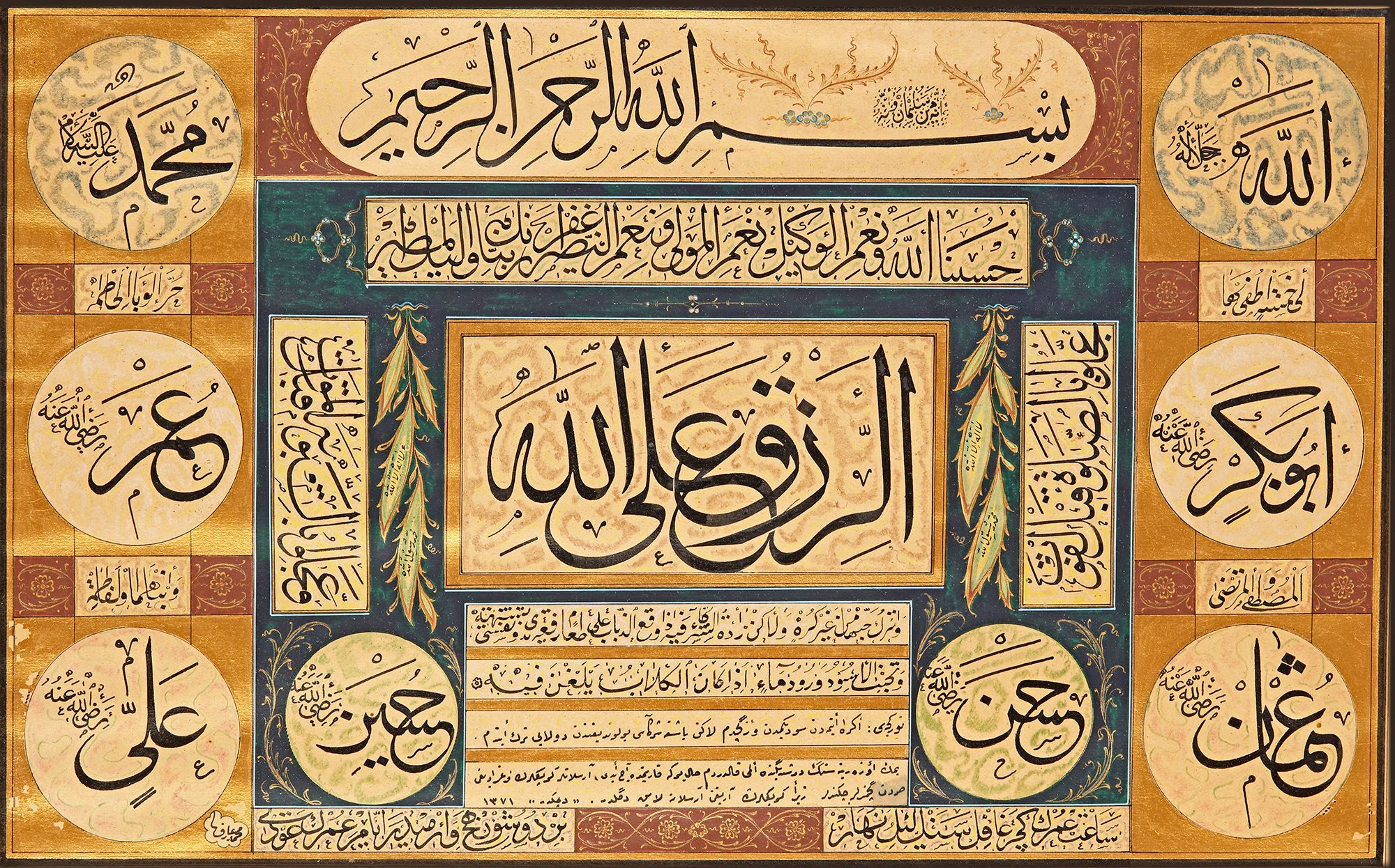 A central rectangular panel enclosing inscription in elegant thuluth script ruled in gilt border, above a panel enclosing Turkish inscription with gilt borders, on both sides a circular device with 'Hasan and Hussein'.