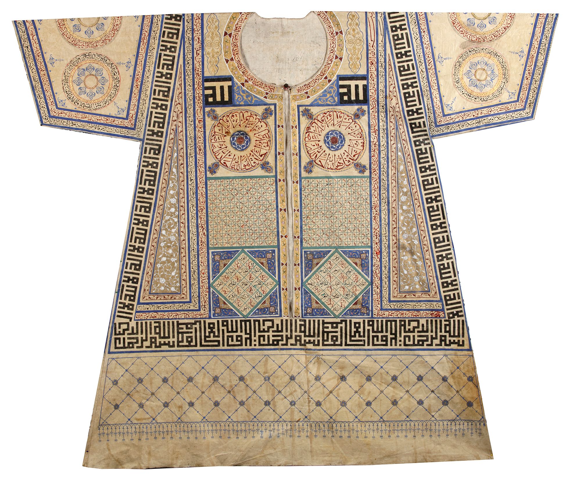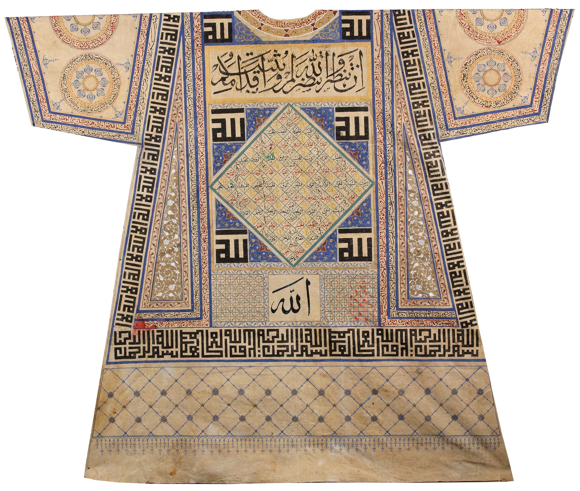 A shirt (jama) covered with text written in naskh, thuluth and Kufic scripts, in assorted colors, arranged in numerous panels, roundels, cartouches, cypress tree forms.