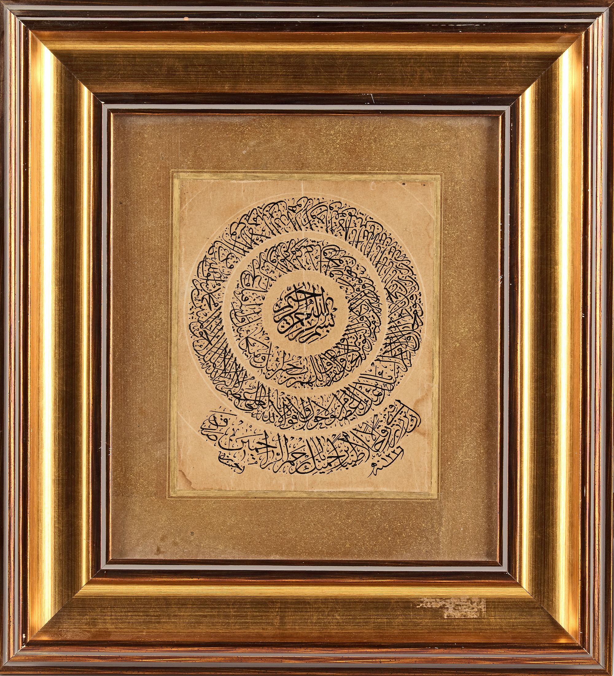 An Ottoman calligraphic panel, Arabic manuscript on paper, written in large elegant thuluth script, shaped as circles within each other and dated 1336 AH/1917 AD.