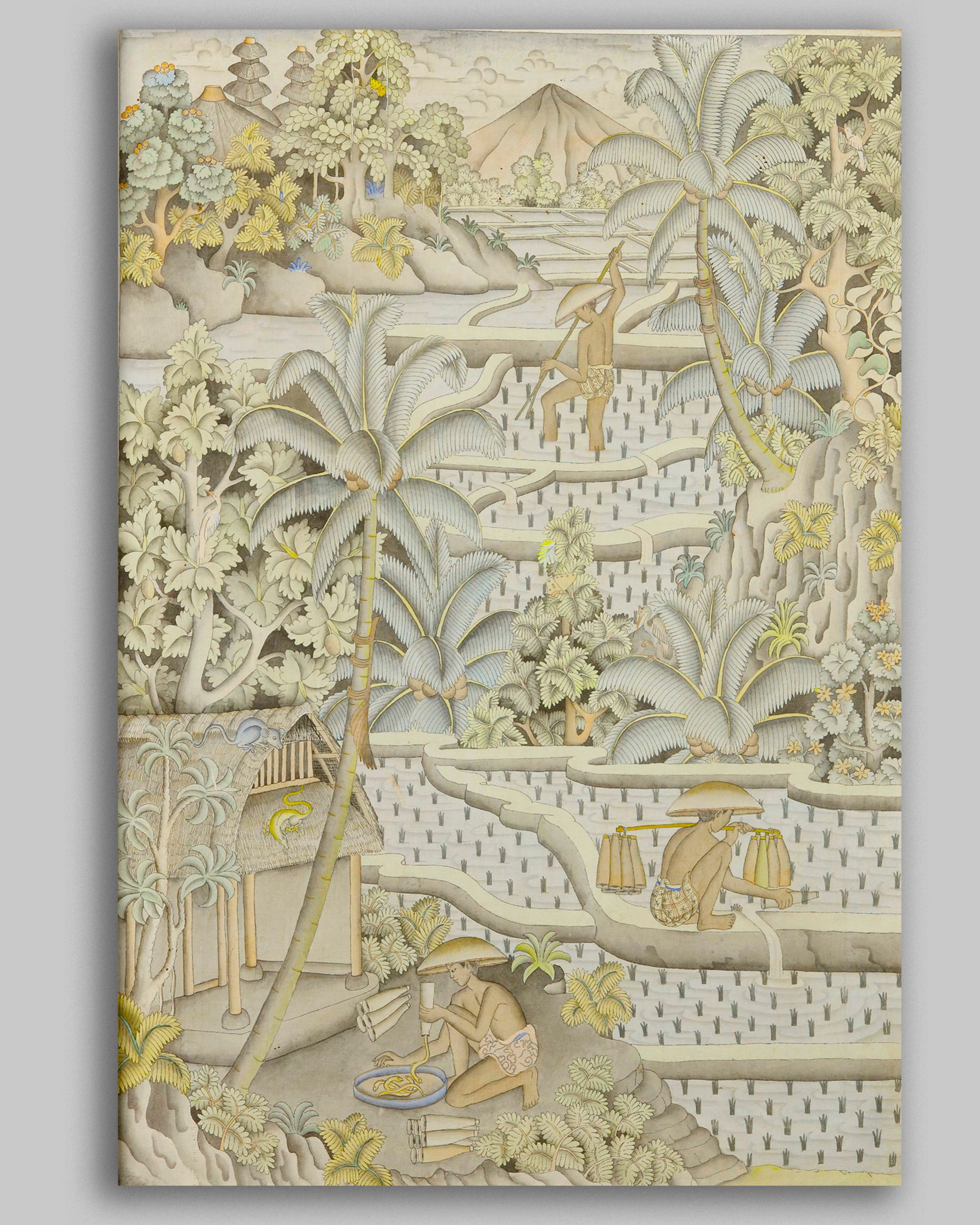 Depicting figures on a sawa and mount Agung in the background. Dewa Poetoe Bedil, a student of Bonnet. 55 by 38 cm.