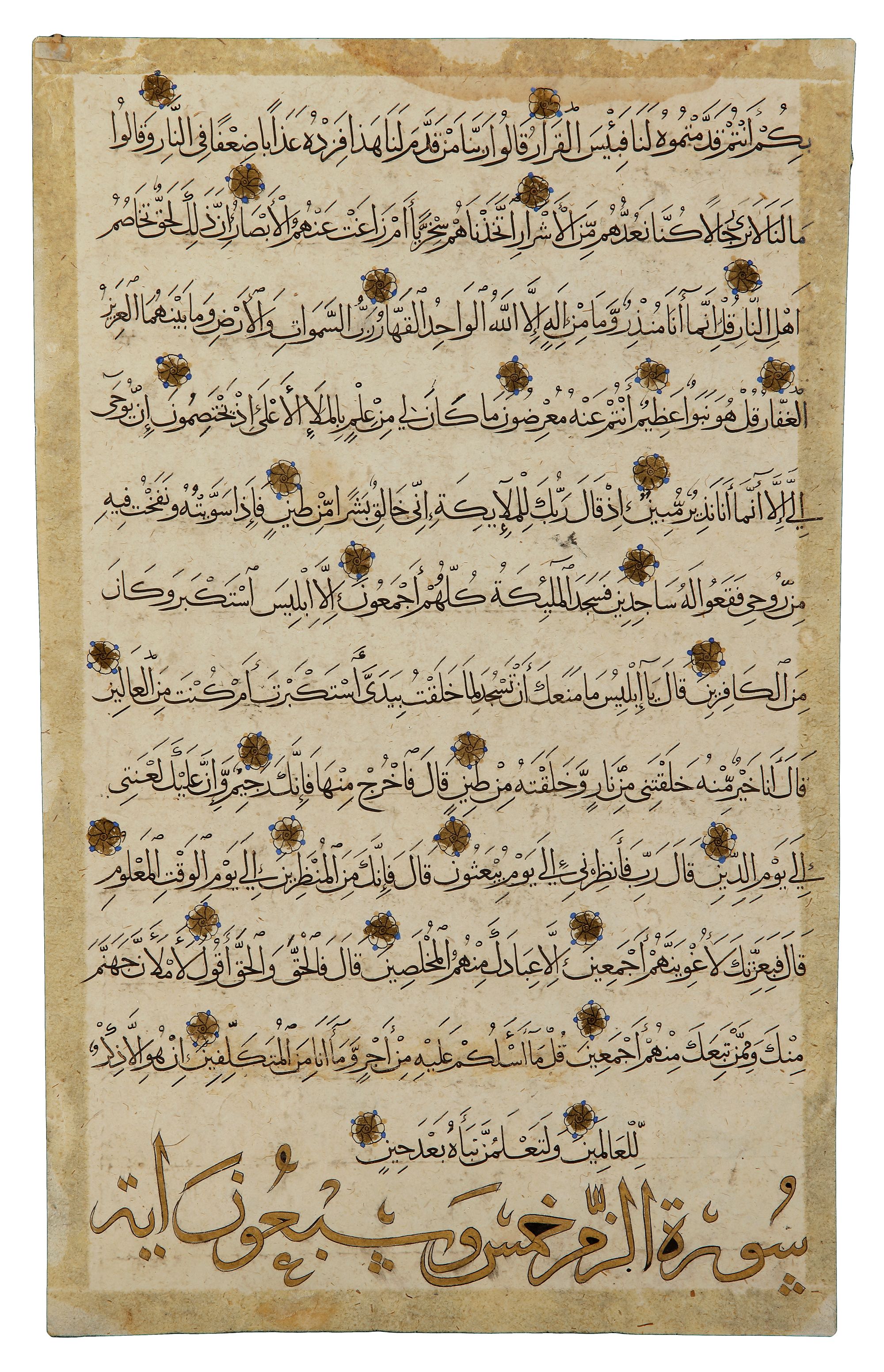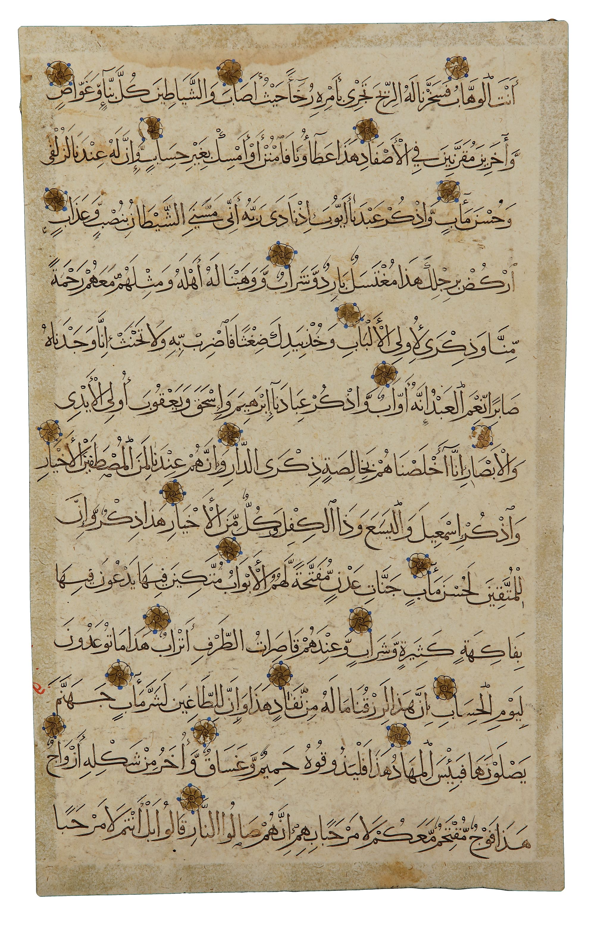 Arabic manuscript on paper, 11 lines to the page, written in fine muhaqqaq script in black ink, verses separated by small gold roundels pointed with blue dots. Surah heading written in elegant gilt thuluth script outlined in black.