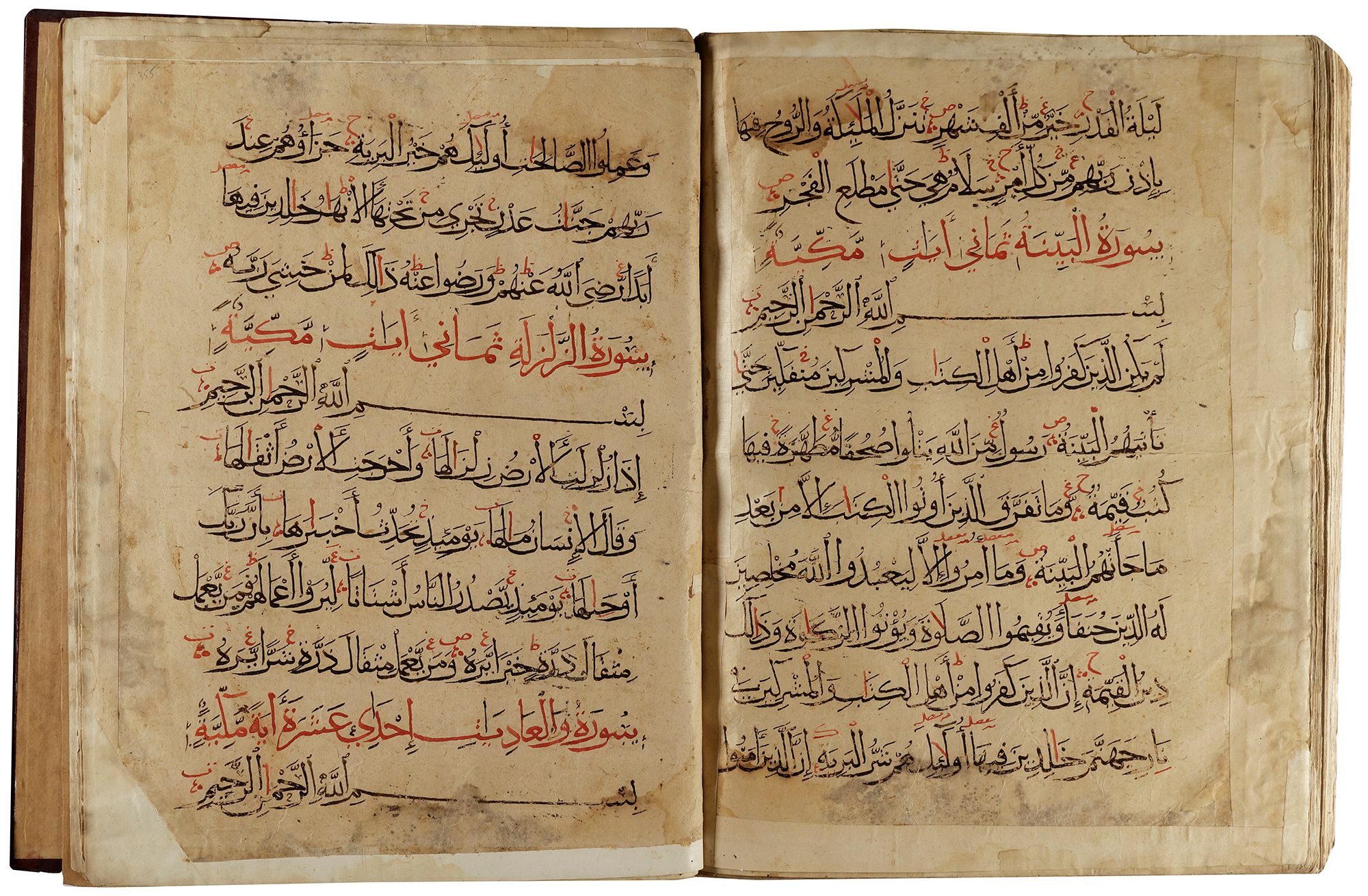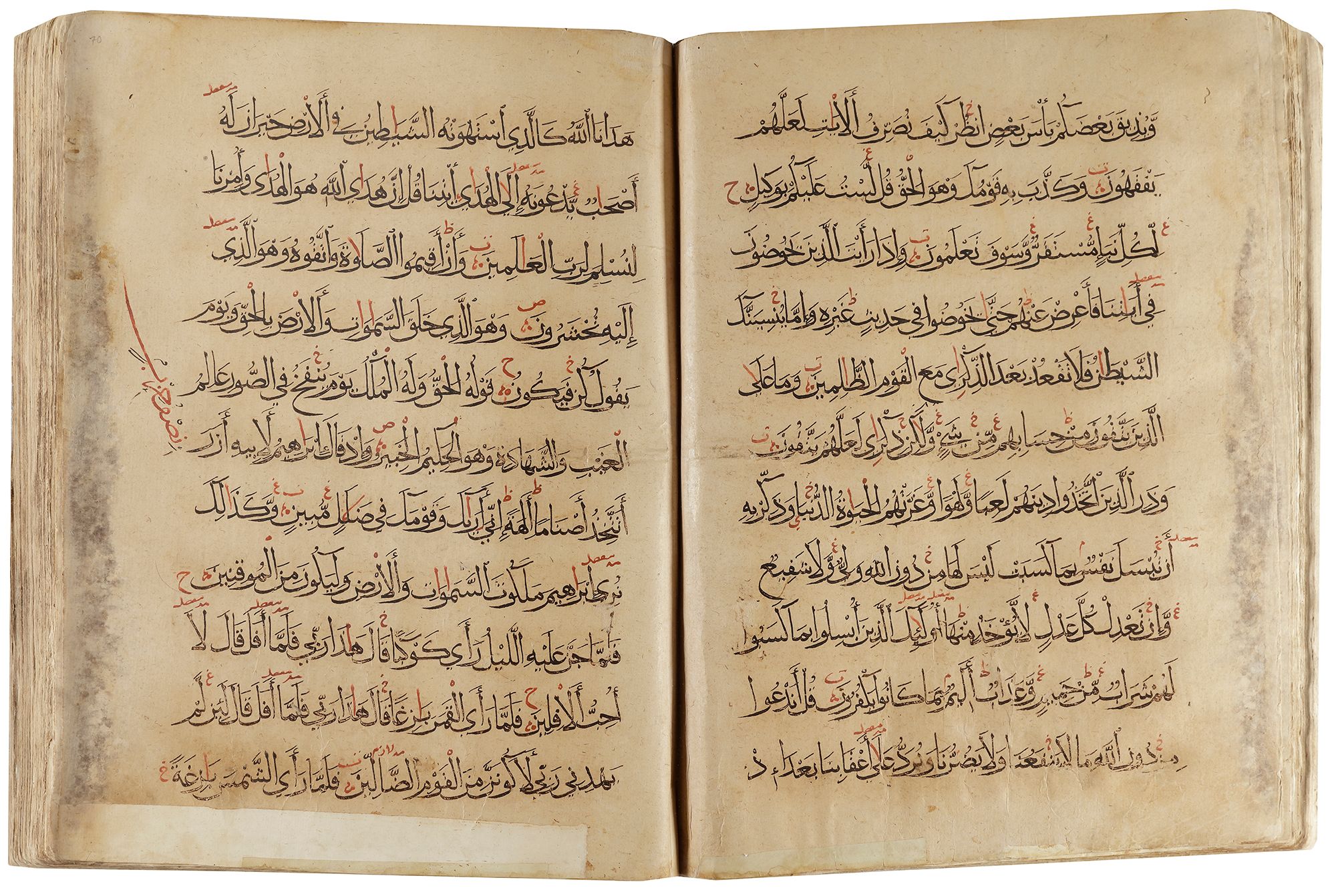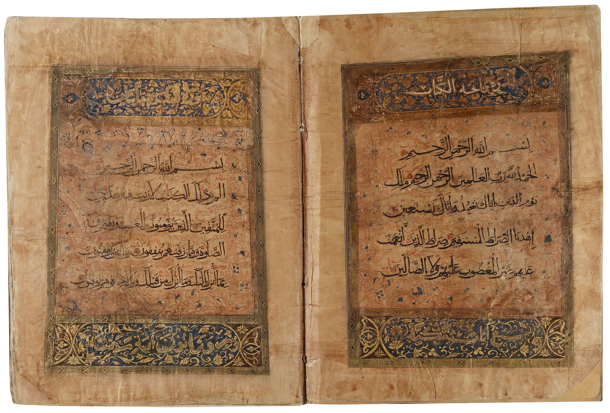 A complete Quran manuscript on paper, 424 pages, 11 lines to the page, written in Tawqi or Muhaqqaq script in black ink, opening illuminated double-page with Quran title in white Thuluth reserved against red and blue-ground panels with gold flowers leaves, vocalization, diacritics and beginning of each surah in red color, contemporary moroccan mamluk brown binding with pressure-moulded doublures, outer boards with a central medallion on one side, with flap.