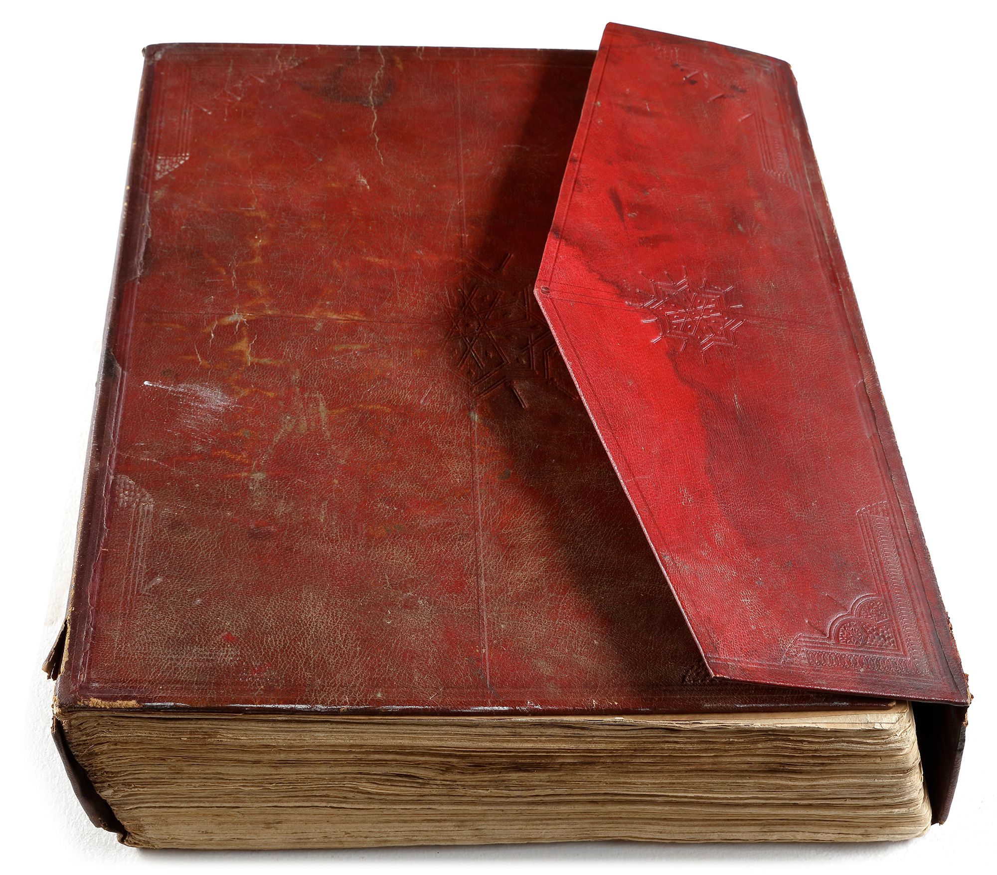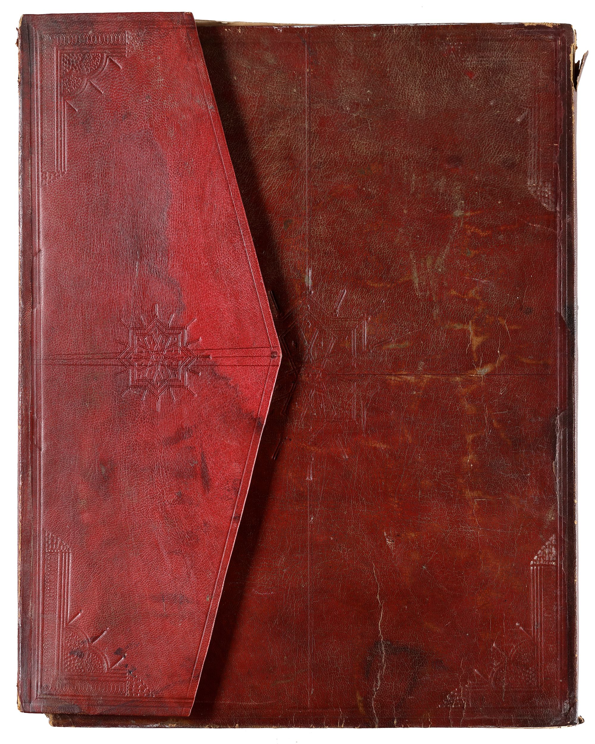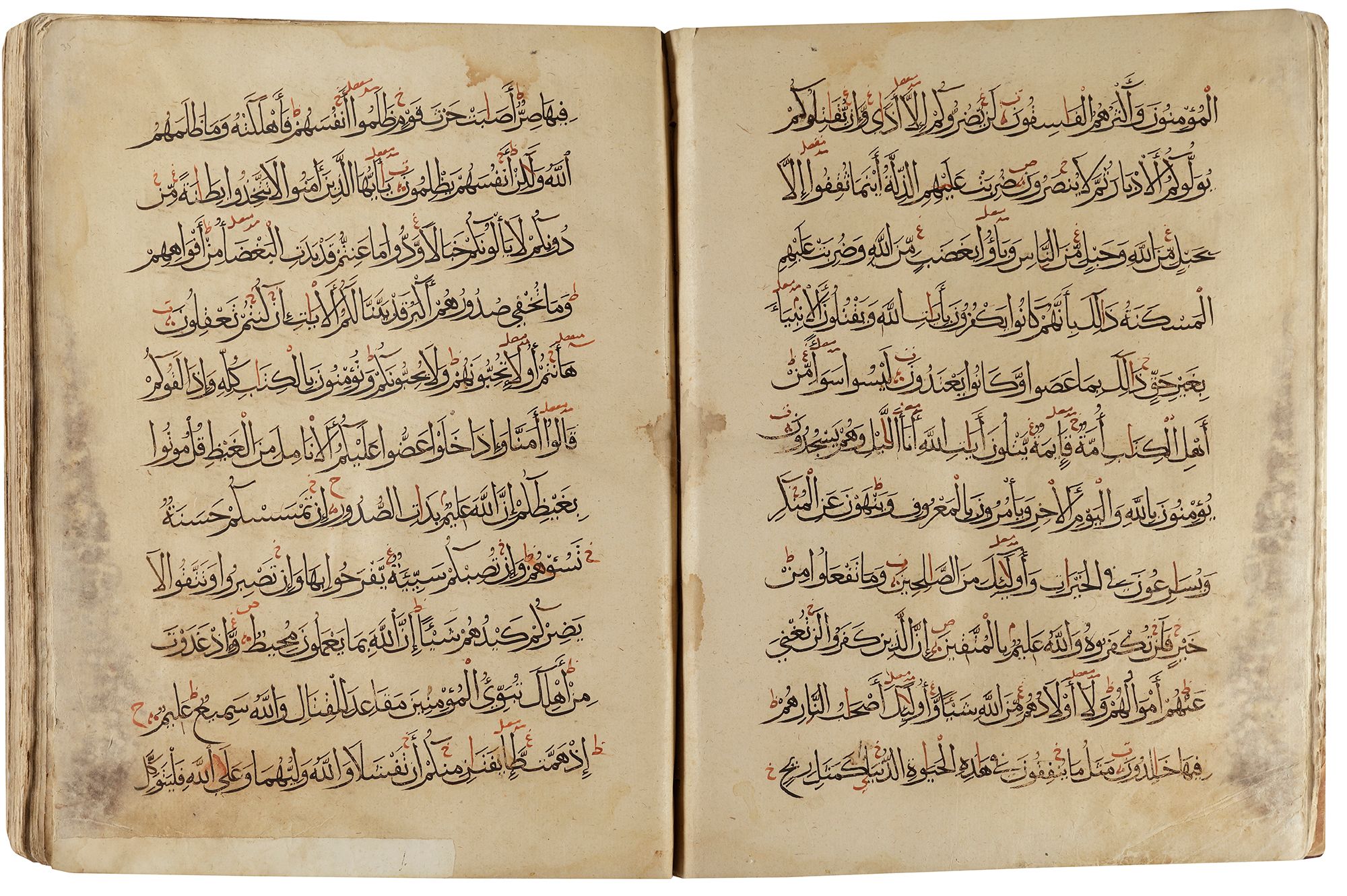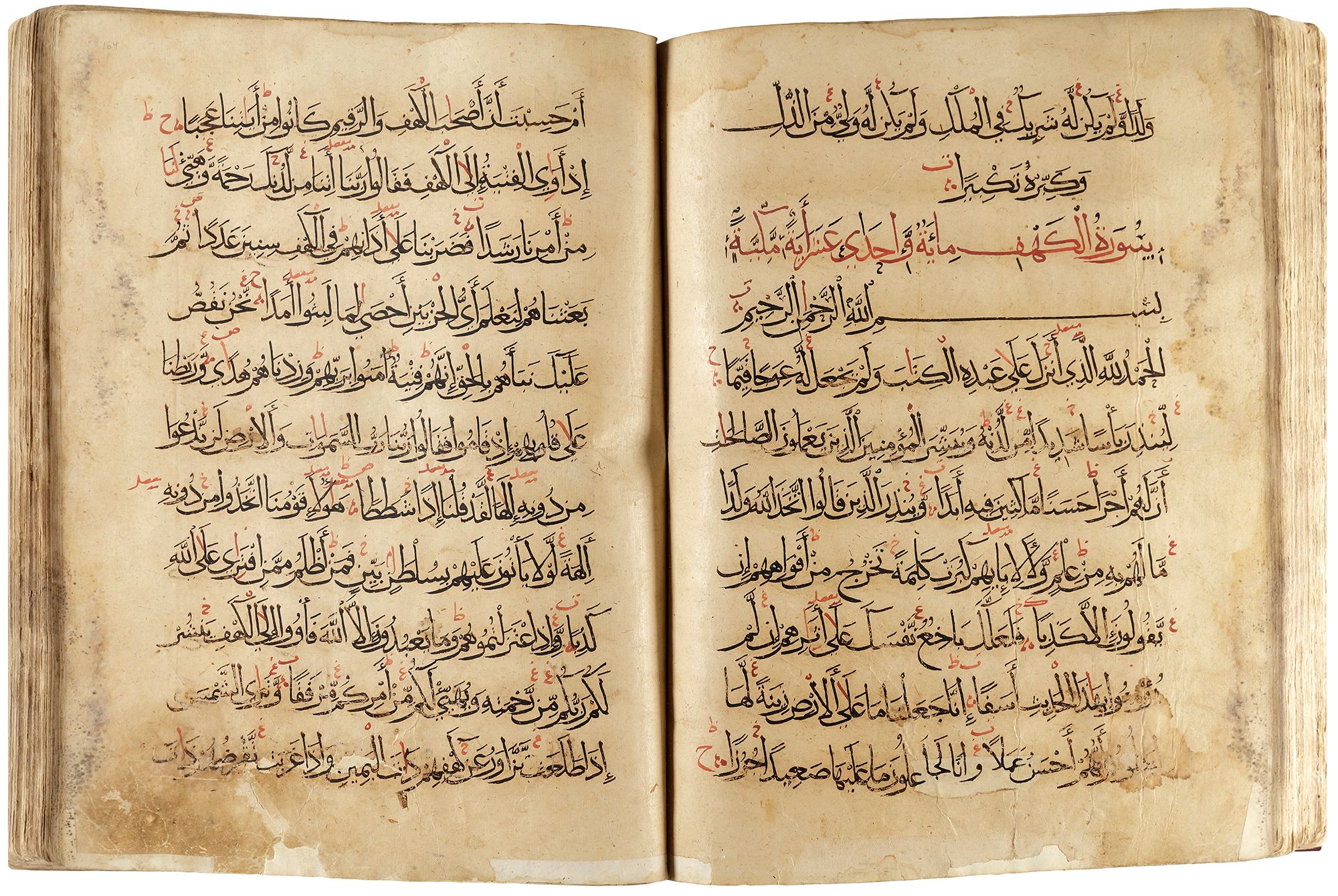 A complete Quran manuscript on paper, 424 pages, 11 lines to the page, written in Tawqi or Muhaqqaq script in black ink, opening illuminated double-page with Quran title in white Thuluth reserved against red and blue-ground panels with gold flowers leaves, vocalization, diacritics and beginning of each surah in red color, contemporary moroccan mamluk brown binding with pressure-moulded doublures, outer boards with a central medallion on one side, with flap.
