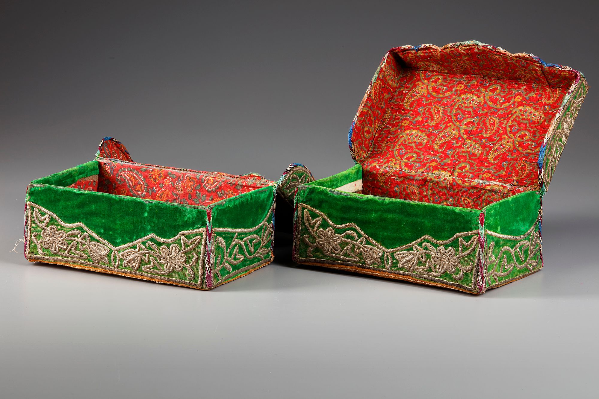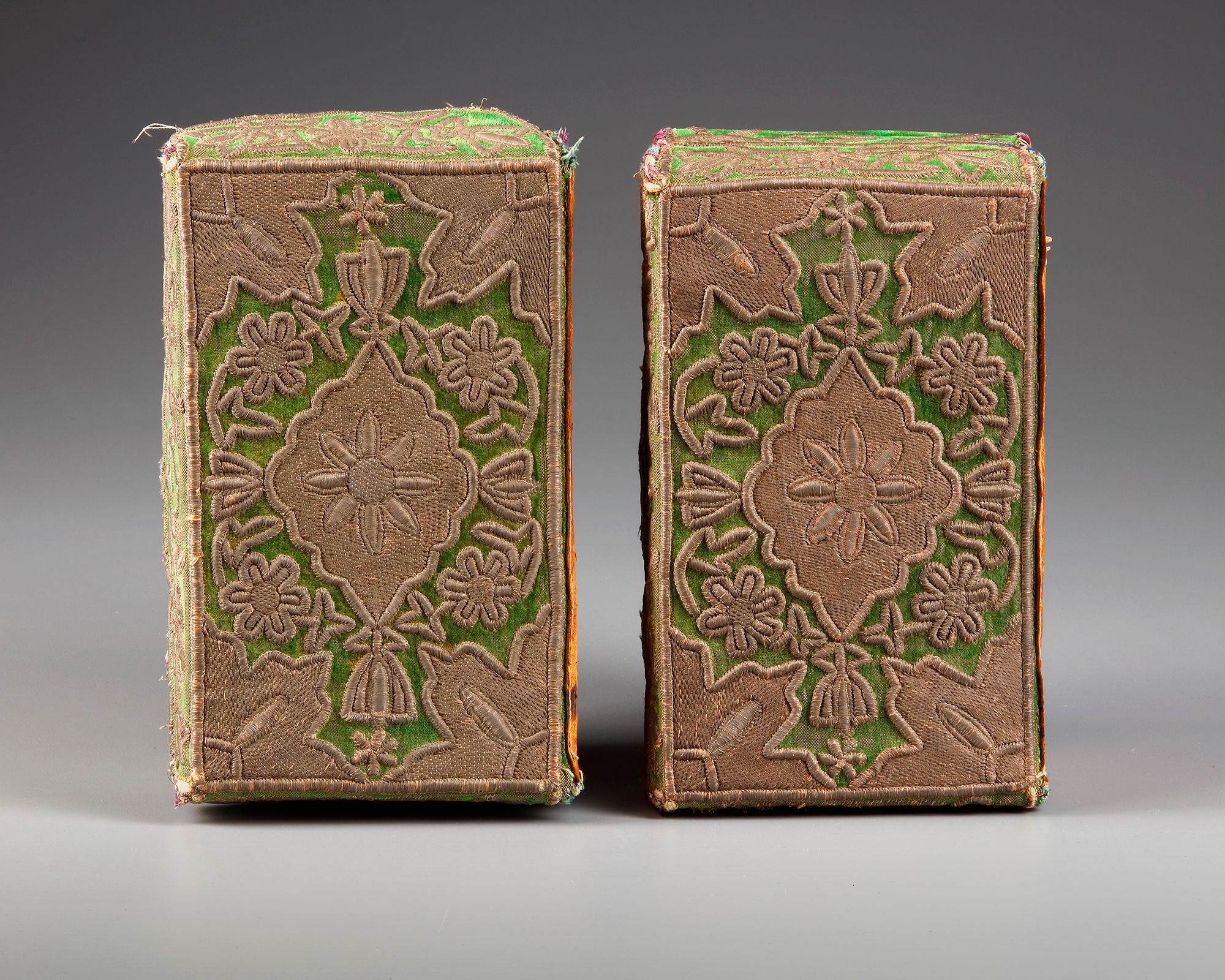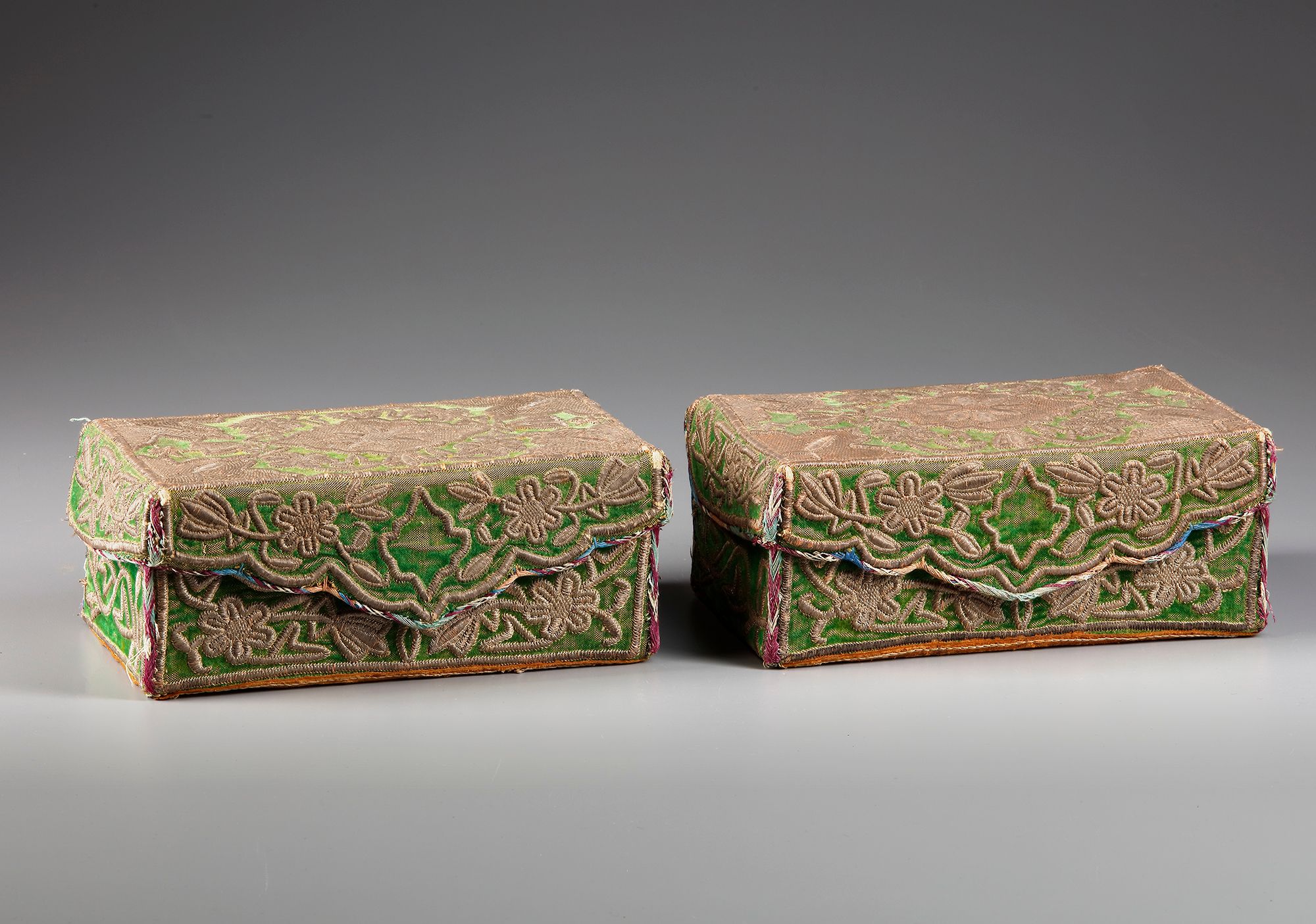 Embroidered in silver threads with flower heads, floral sprays and foliage on a green velvet ground. Height: 9.5 cm. Length: 22 cm.