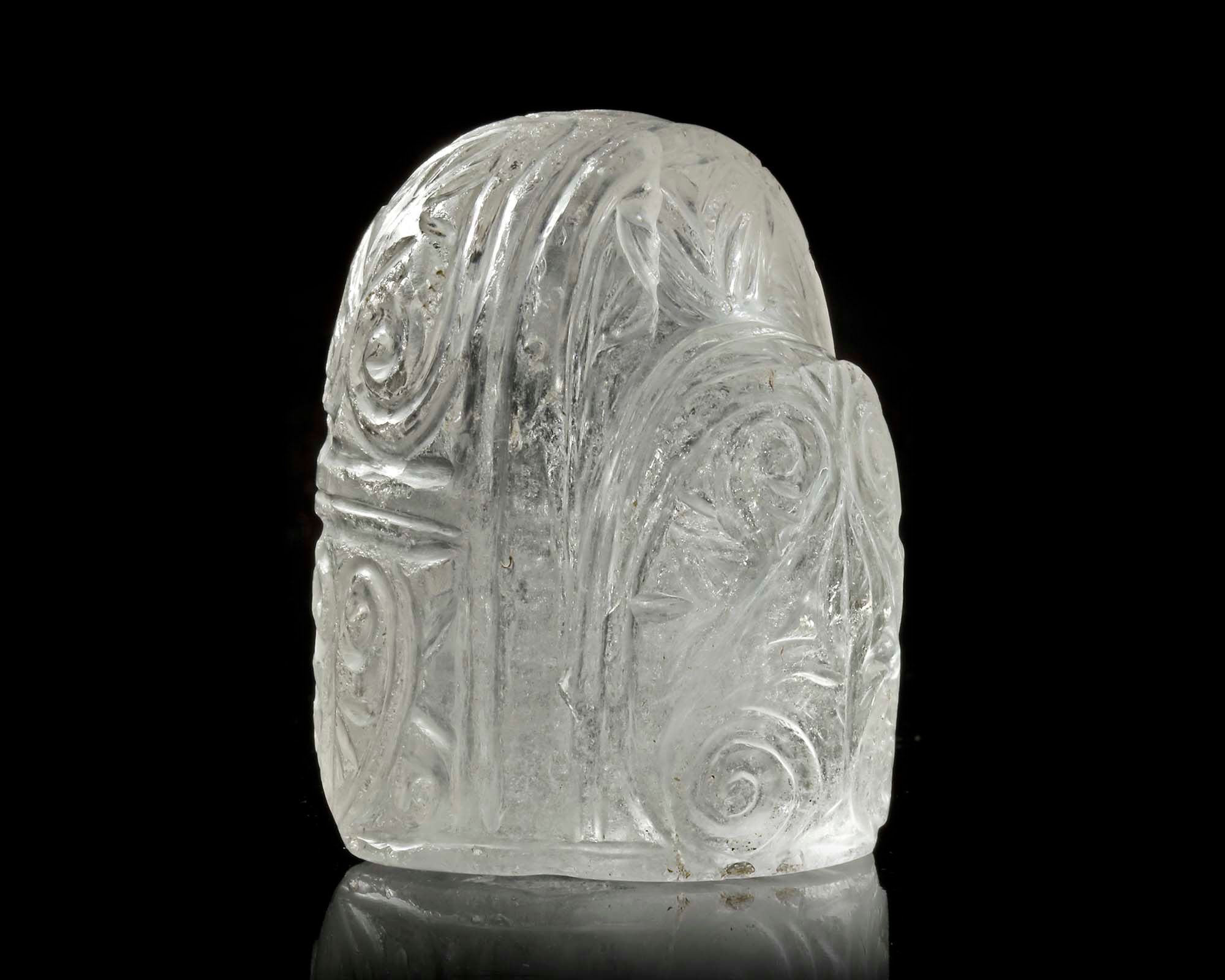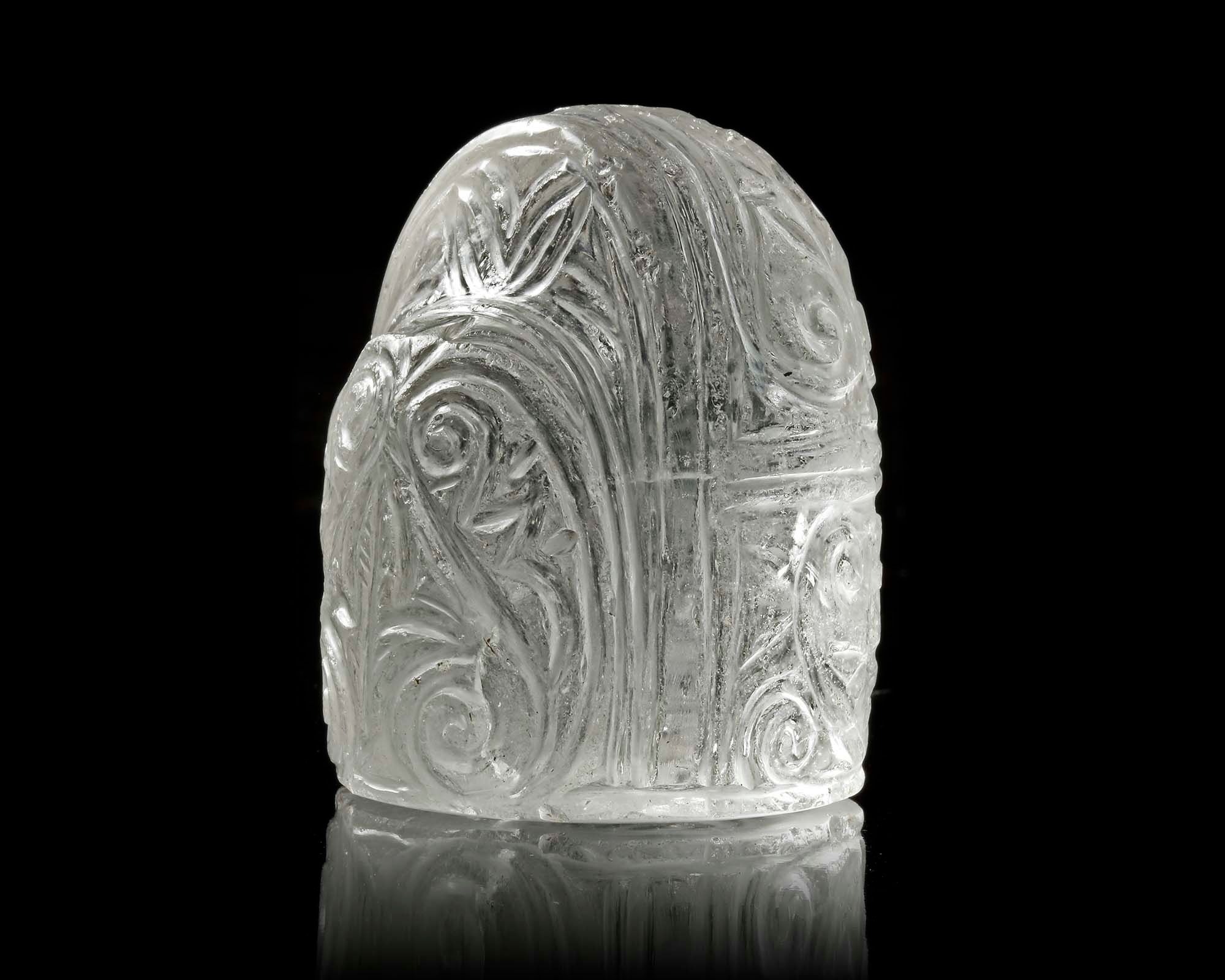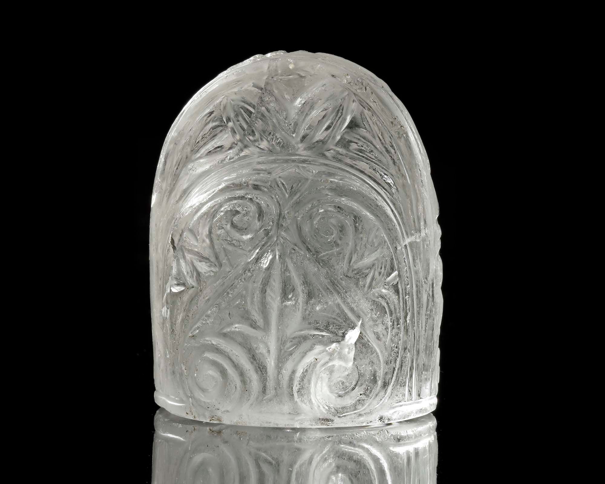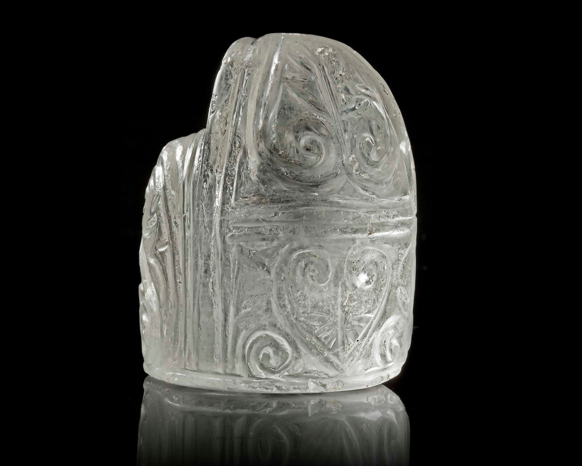 This piece of rock crystal is carved as a chess piece, probably a king. In the Middle East the king originally showed the monarch riding on an elephant in full state. However, the shape soon became highly stylised, and its main distinguishing feature is its lack of symmetry front and back. This piece has a low, plain, recessed oval base. The main body has a rounded top and has been carved as three separate elements. A high band with a decorated upper surface separates two faces that curve outwards. The front shows a pair of birds confronting one another. They make a pattern that looks a little like an elephant's face. The back is much lower and is decorated with a pattern of leafy scrolls.