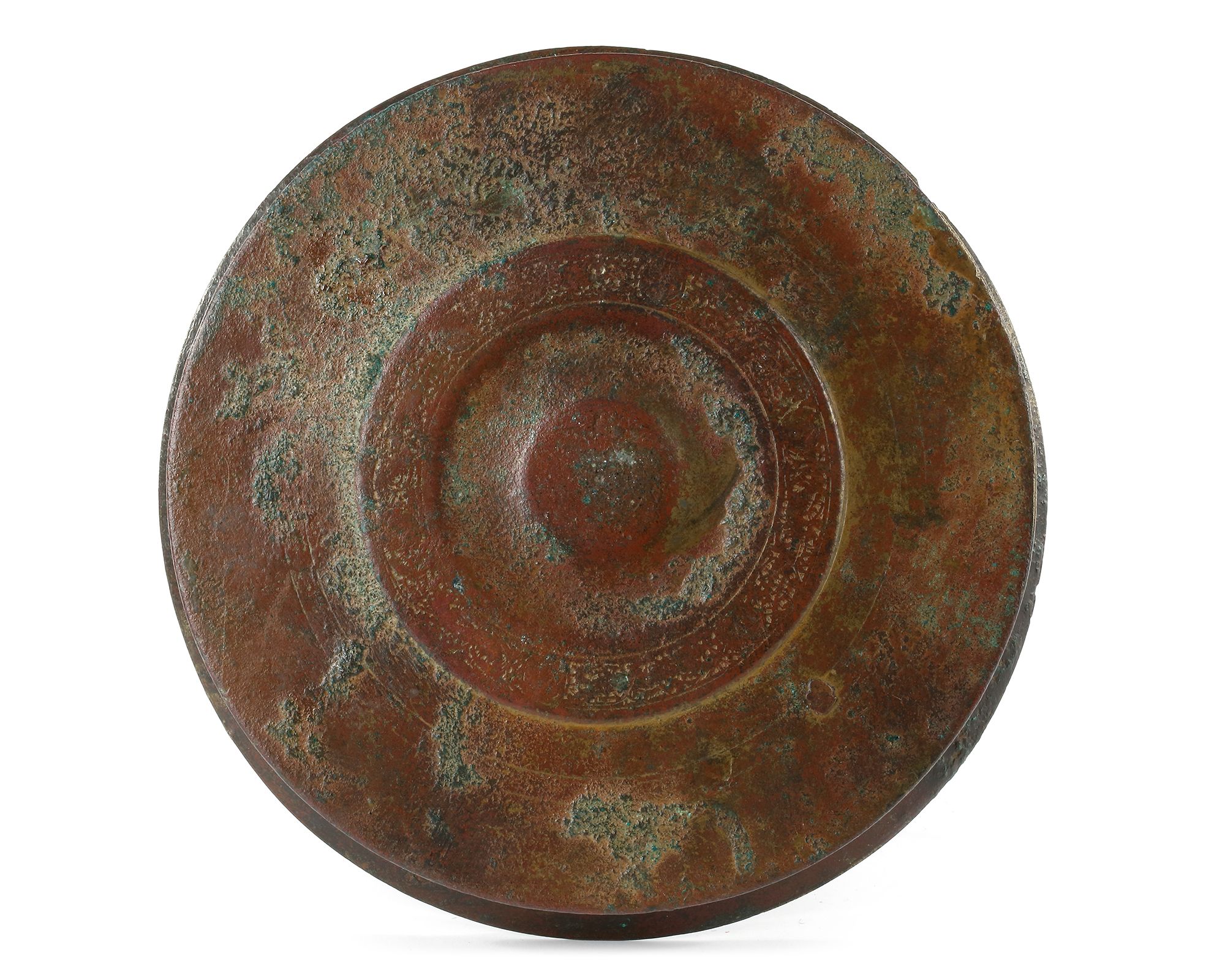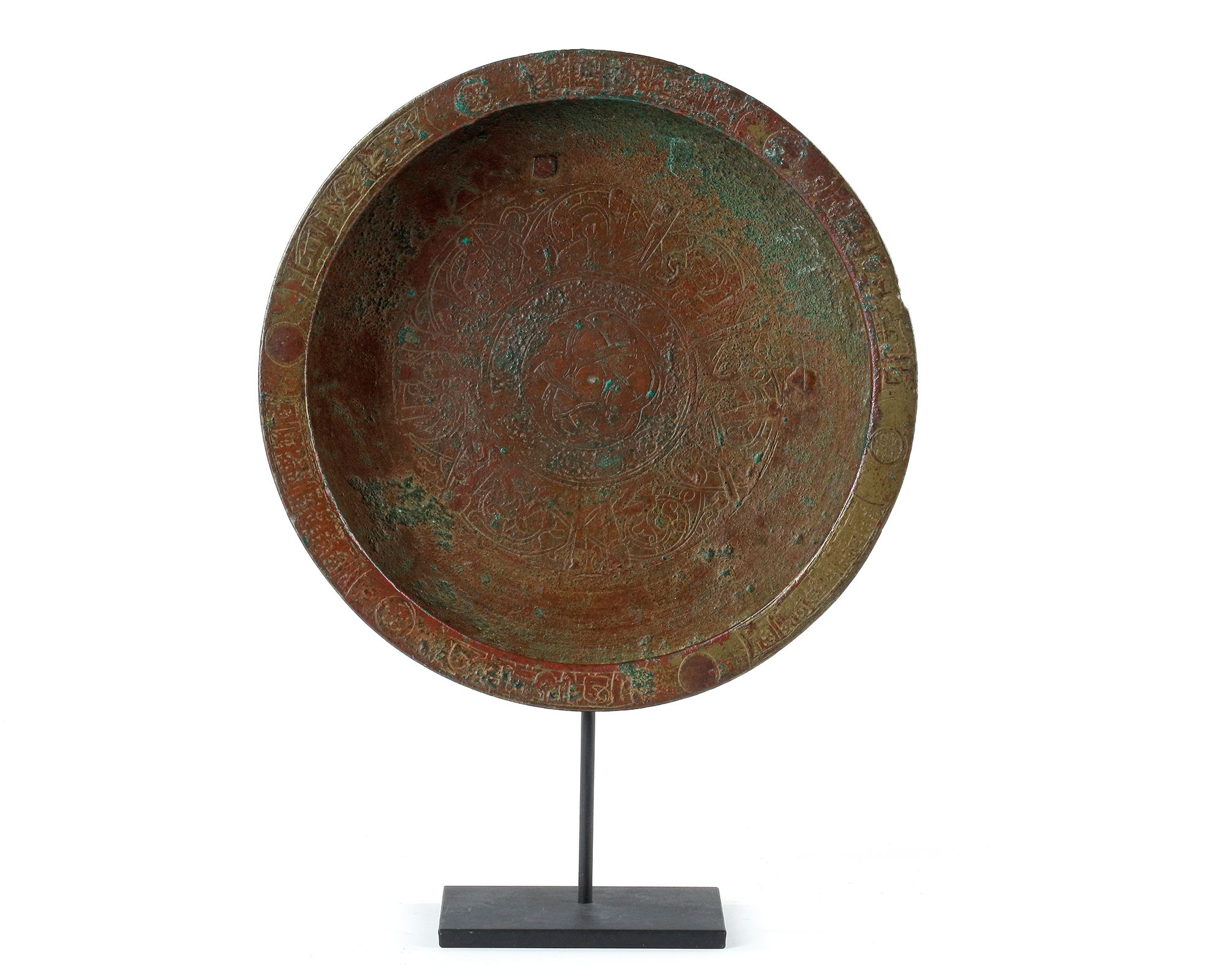 Of shallow form with everted rim, cast with a central roundel containing on a ground of vegetal interlace, surrounded by a band of inscription in kufic intertwined with vegetal interlace interspersed by circles and roundels containing six-pointed stars, the rim with cartouches containing stylised palmette and trefoil motifs.