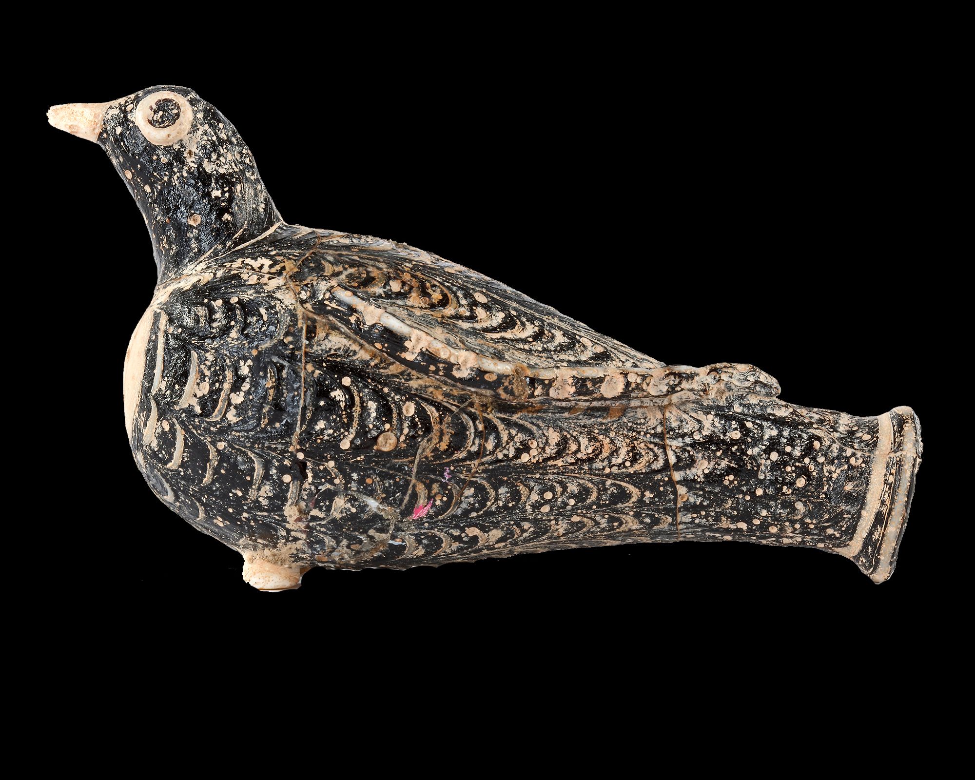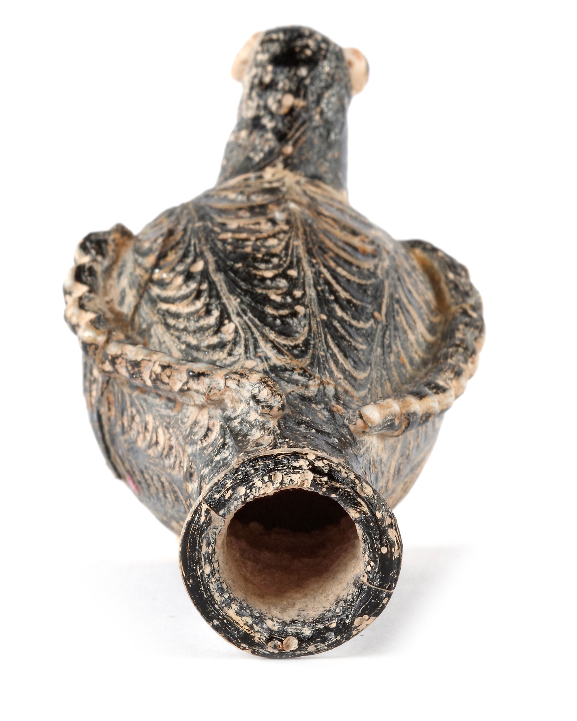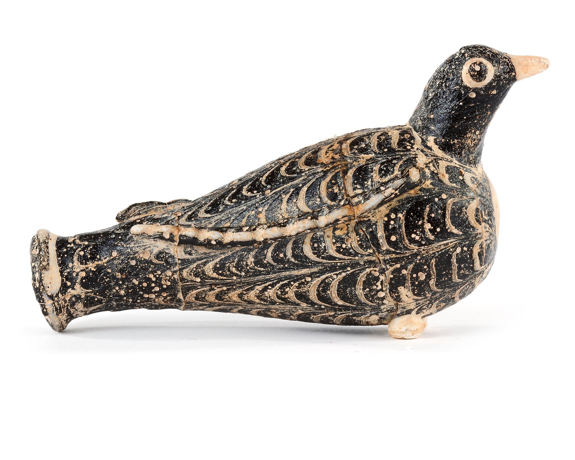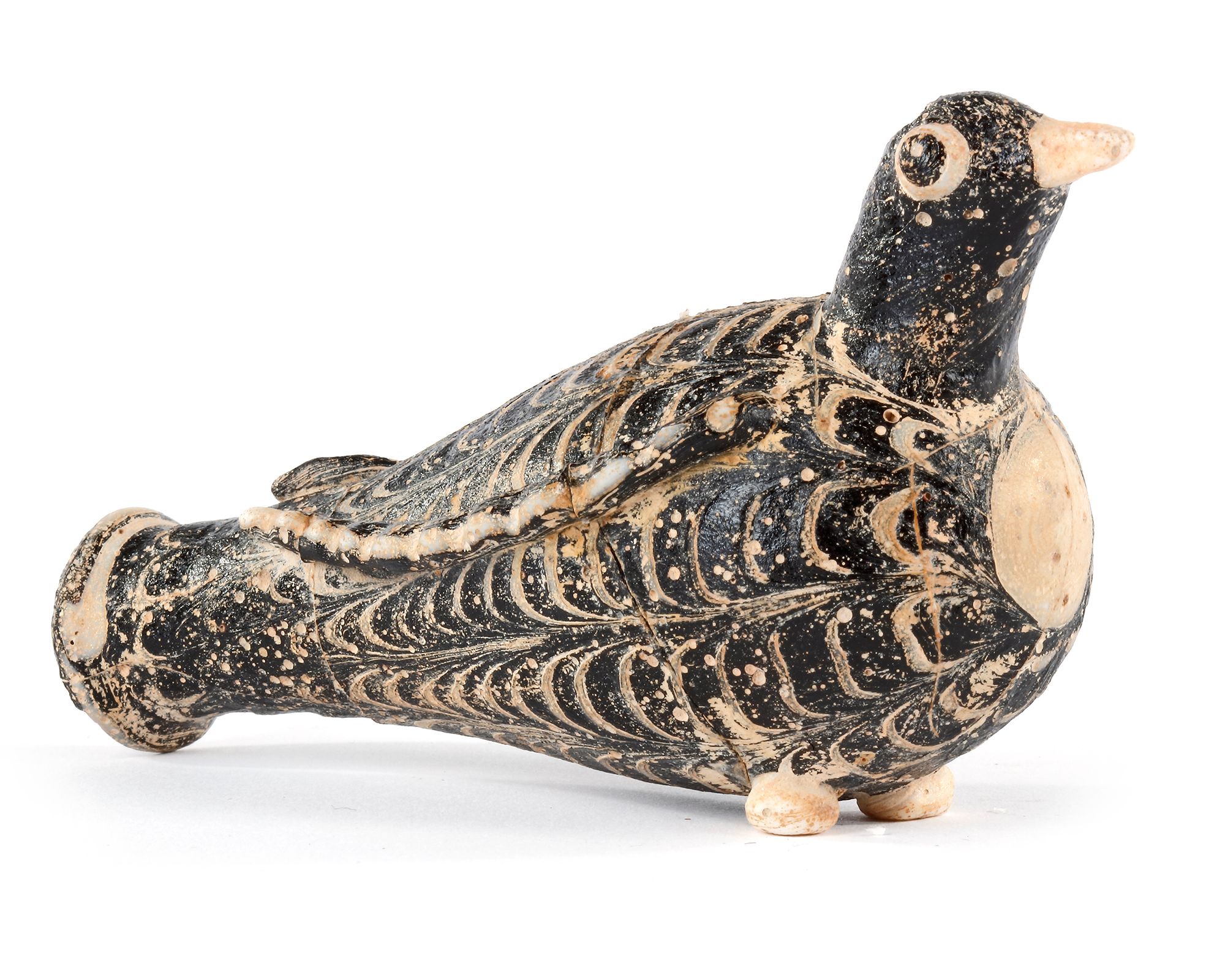 A standing bird, of black and cream white glass, roughly pear-shaped with a hollow body, a plump breast and open tail. Circular protruding black eyes. Stylized wings dropped onto shoulders and drawn back along body and marvered feathers.