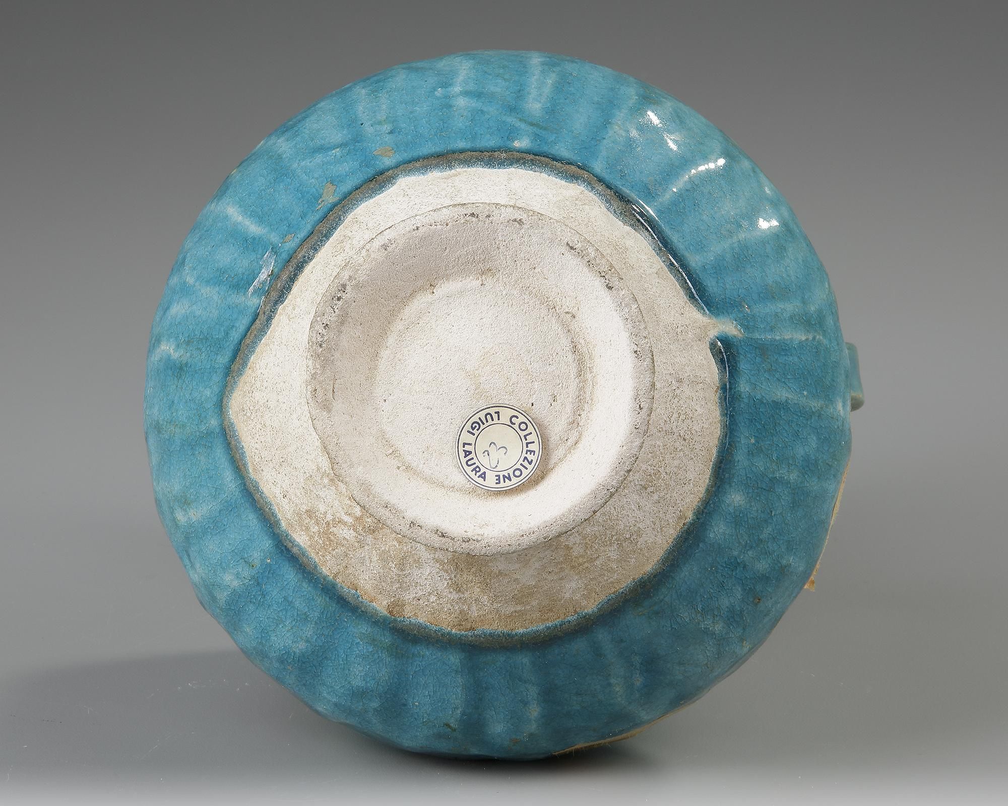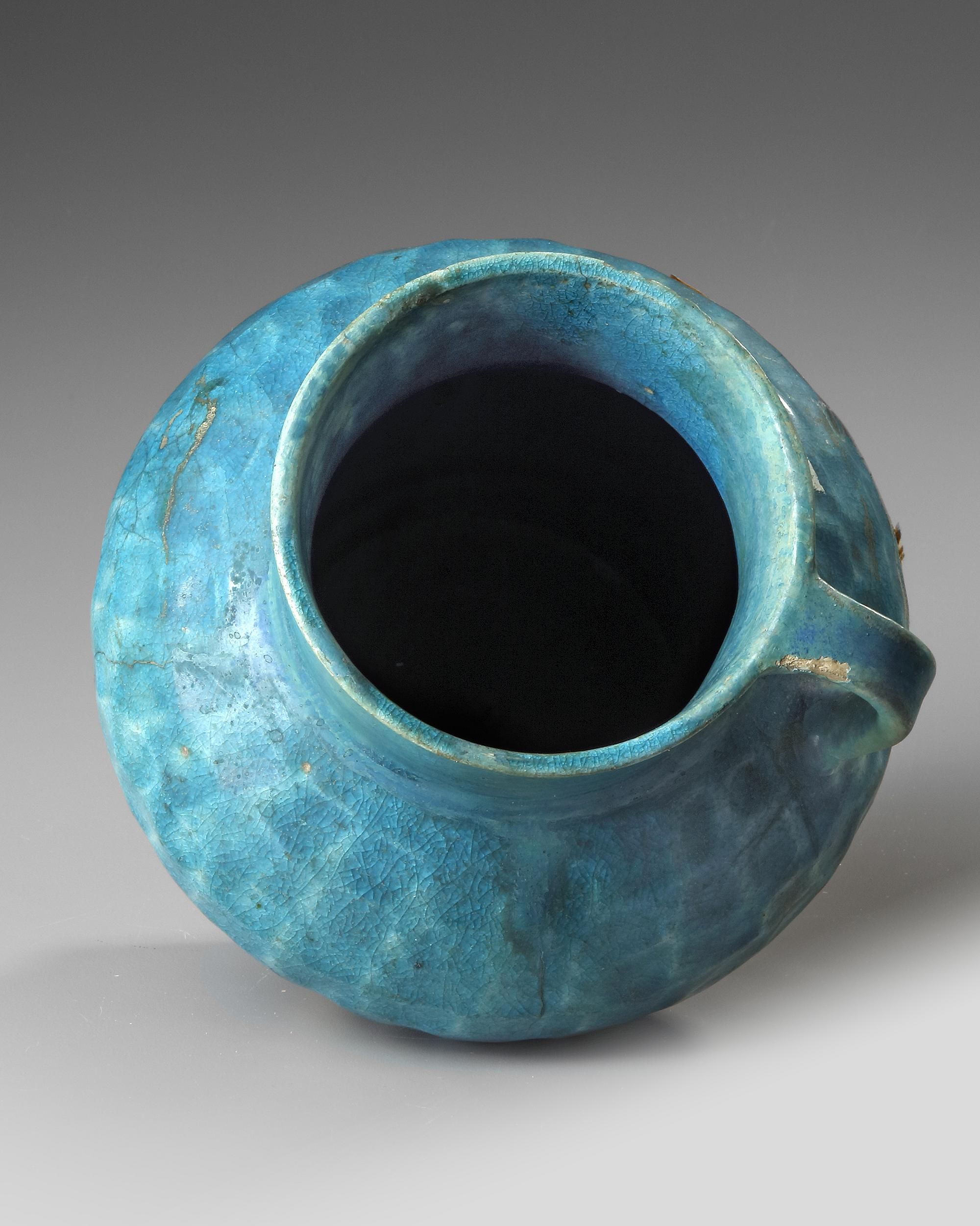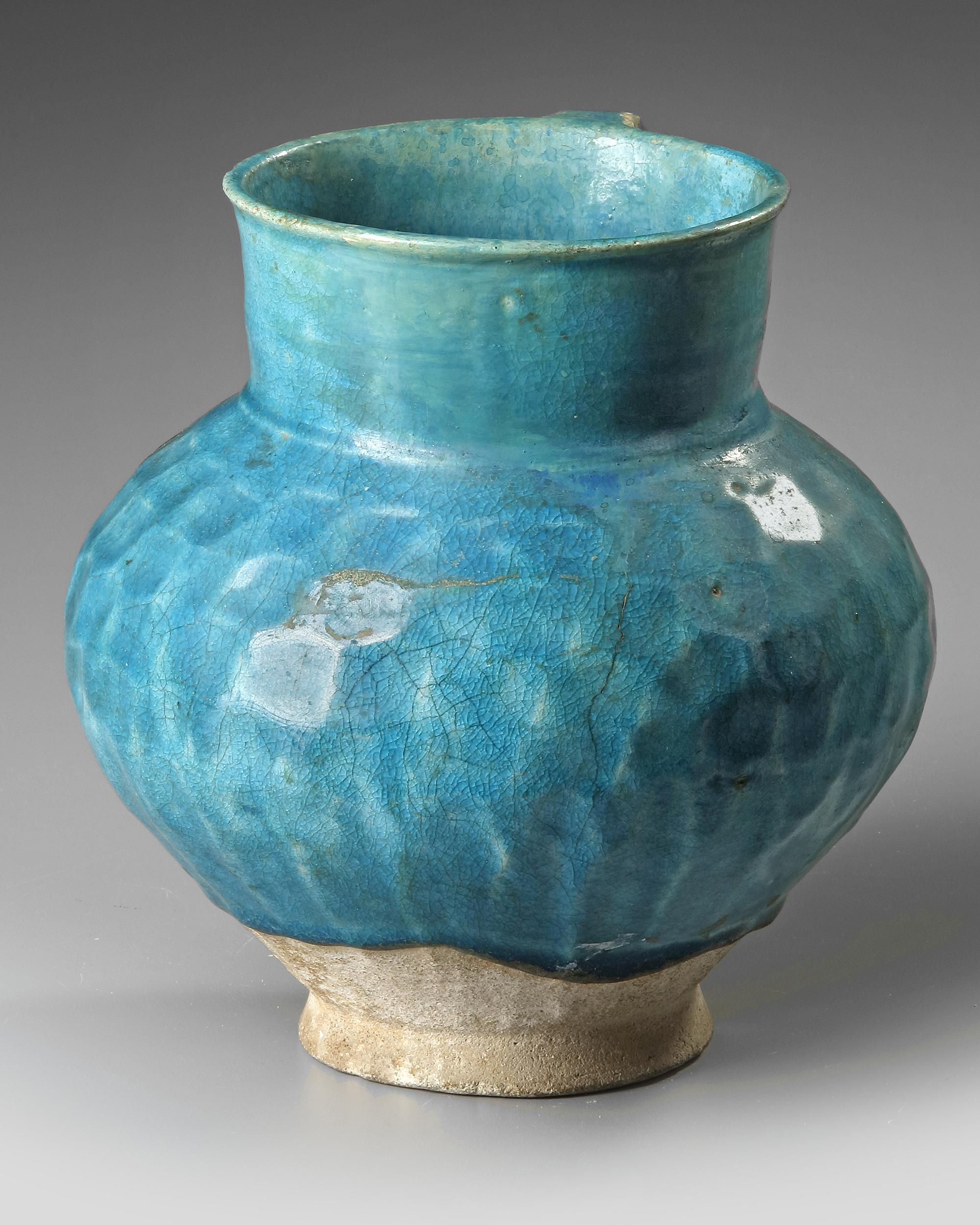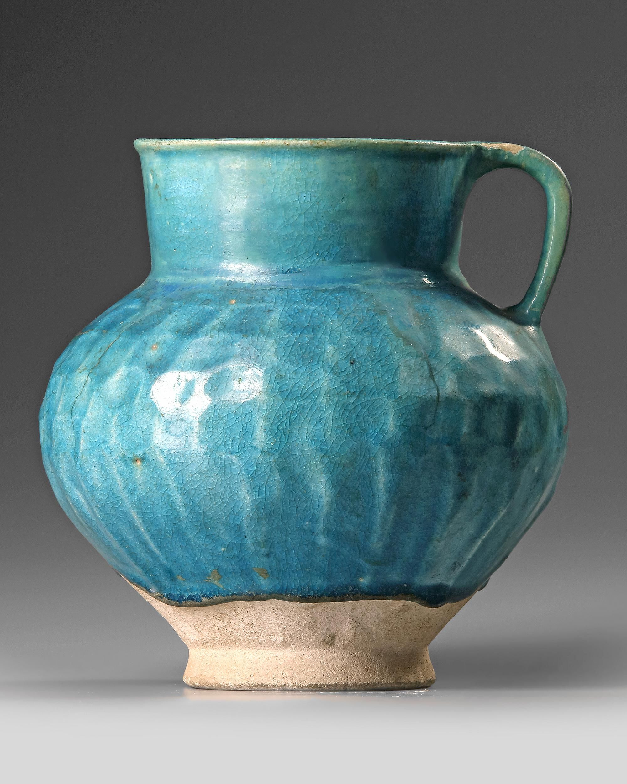 A kashan jug with rounded ribbed body and cylindrical neck standing on a small unglazed foot, covered with a turquoise glaze.