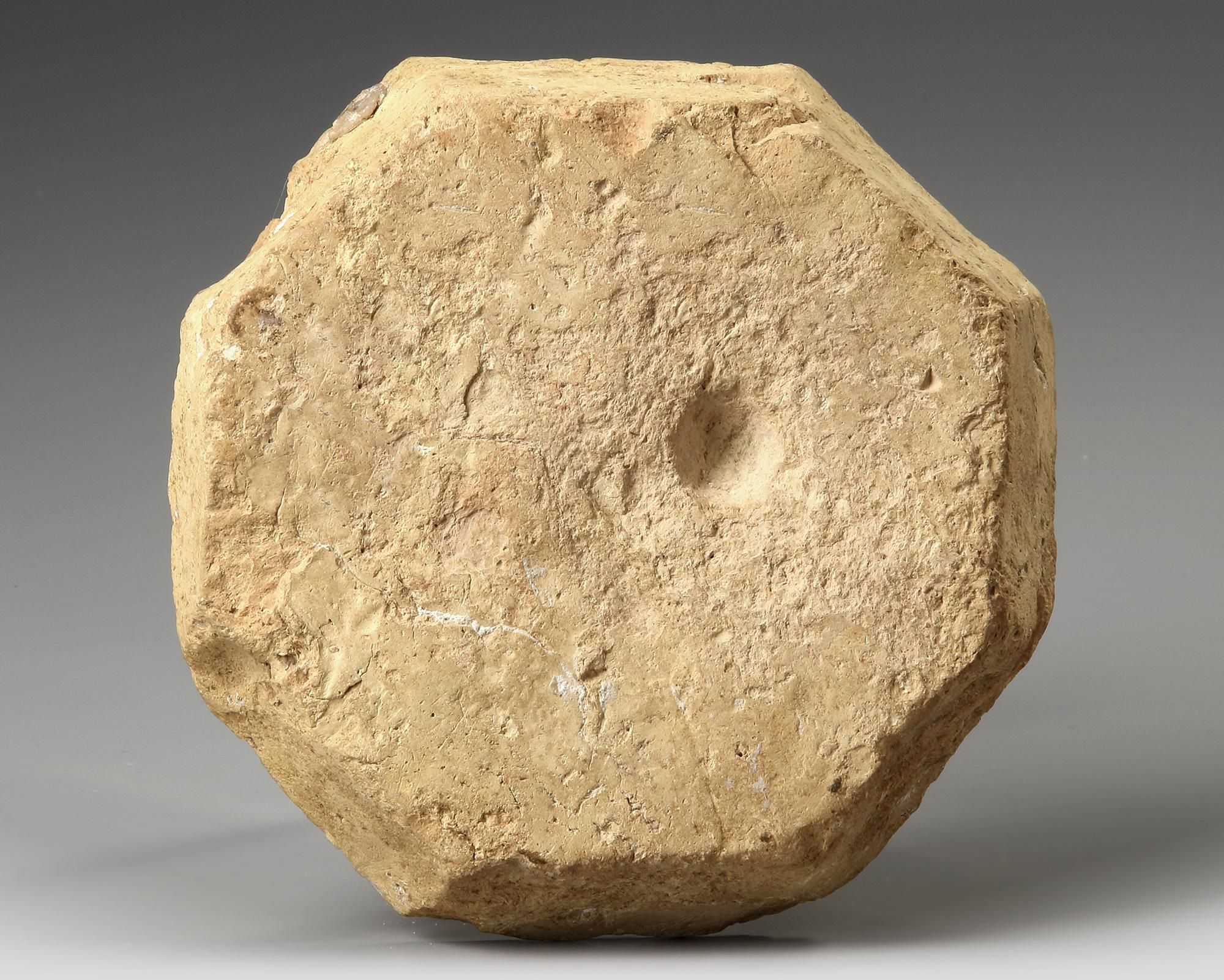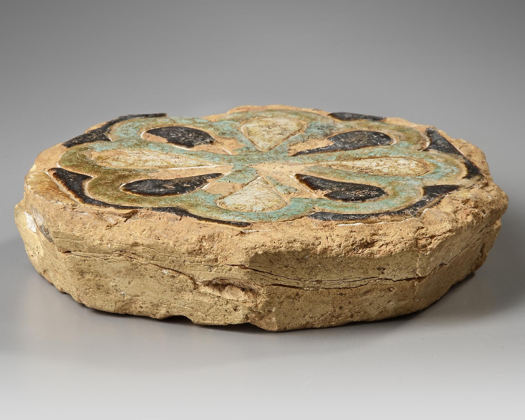 Of octagonal form, decorated in turquoise, white and black glazes with a flower motif. Width: 16 cm.