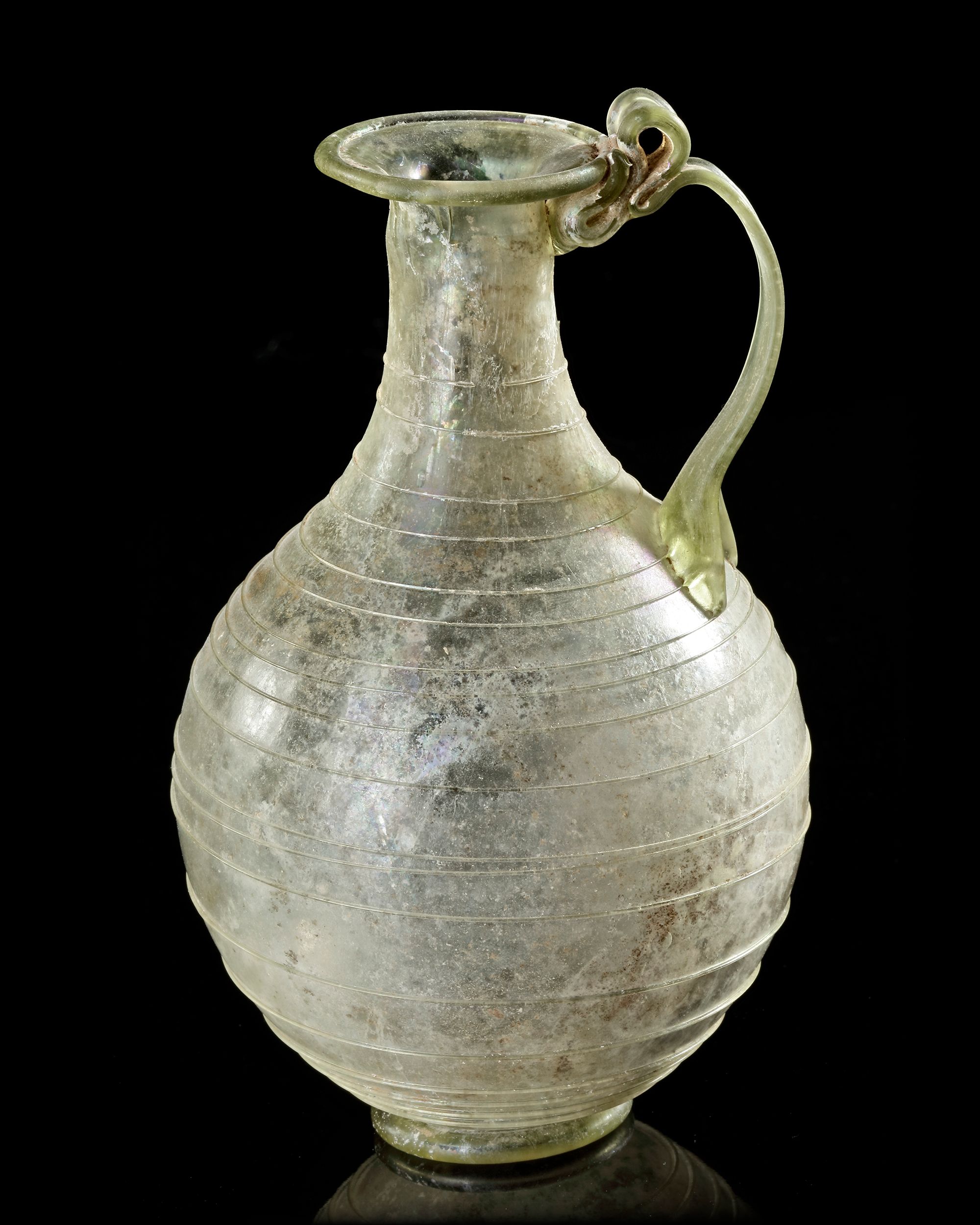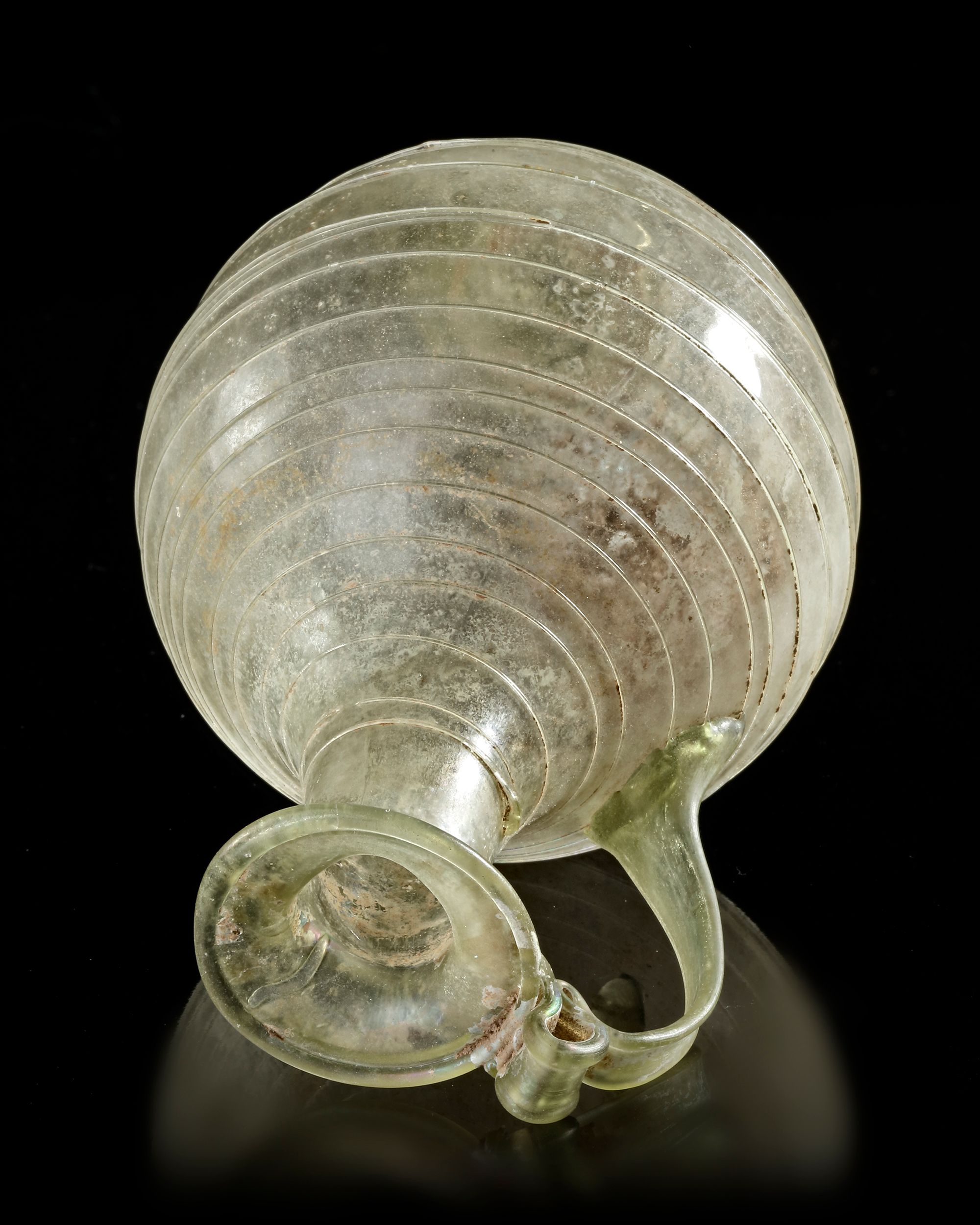 Roman light green glass jug, 1st century A.D., the flaring mouth with an infolded rim on a pear-shaped body and hollow tubular base-ring, decorated with an applied spiral around the neck and handle in contrasting streaky light blue glass.