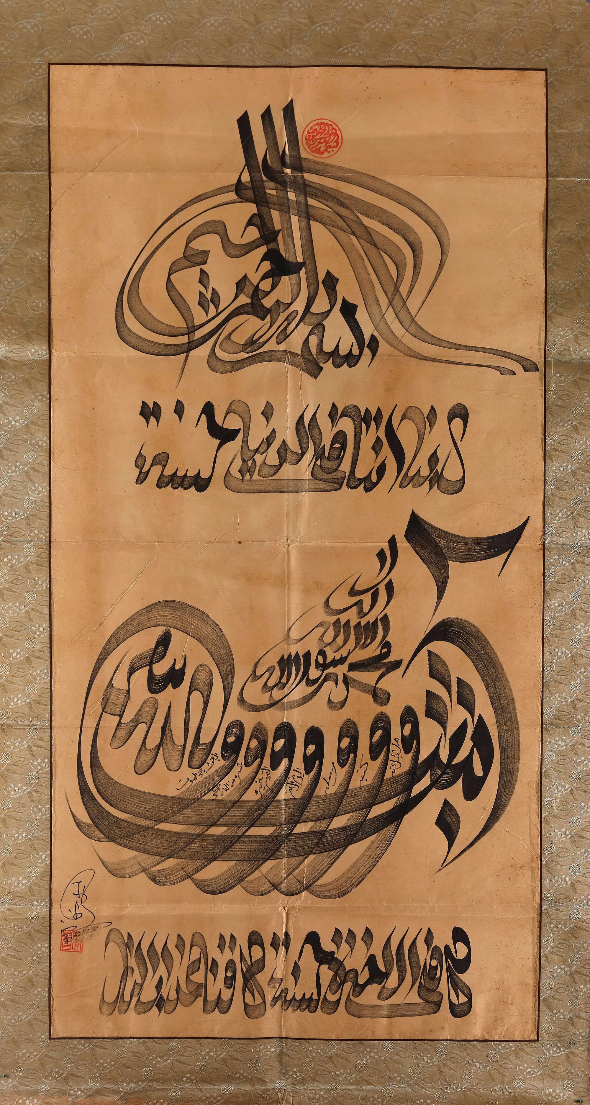 Hanging calligraphic scroll in sini (Chinese) script, in black ink on paper mounted on cream silk.