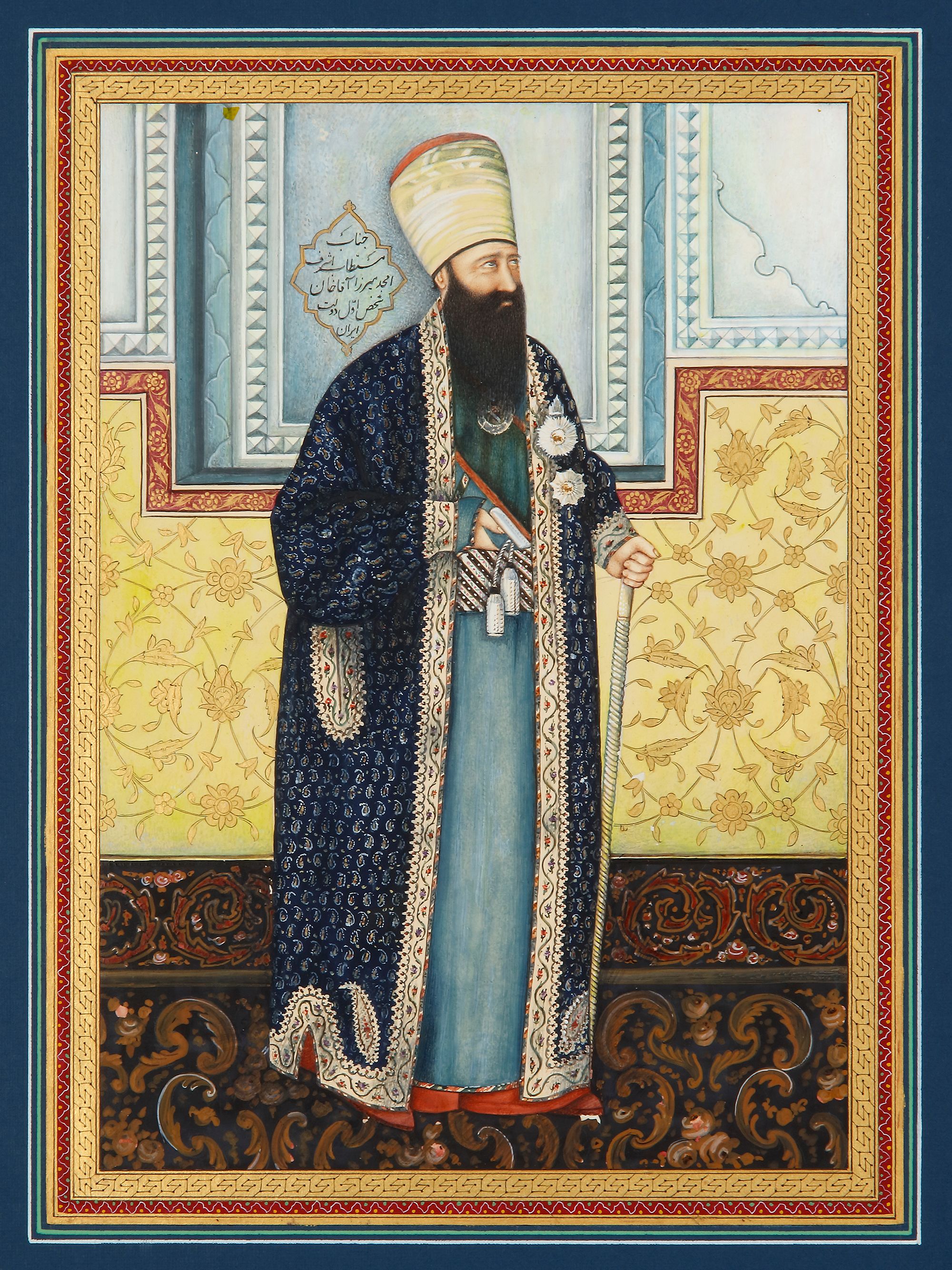 Mirza Aqa Khan Nuri known as Aqa Khan Nuri , E'temad-ol Dowleh (born 1807 – died 1865) was a politician in Qajar Iran, who served as prime minister (ṣadr-e aʿẓam) between 1851-58 during the reign of king Naser al-Din Shah Qajar (r. 1848–1896). 22.5 by 17 cm.