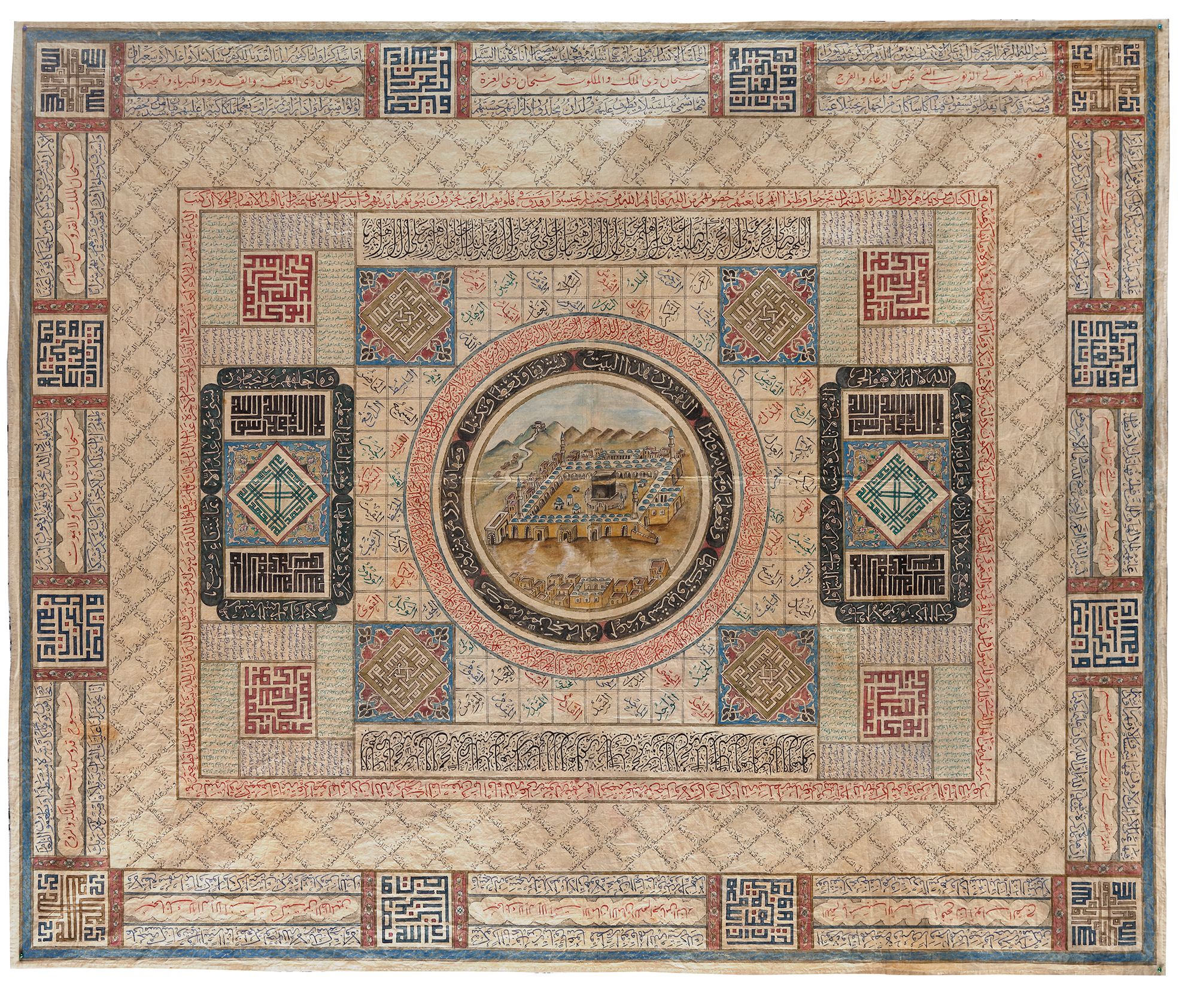 To the centre a large view of Mecca with Al-Masjid al-Haram, surrounded by double circles enclosing Dua'a al-Talbiyah in naskh script and v.1-v.5 from surah al-Mulk. Further flanked by two panels enclosing Kalimaat al-Tawhid in kufic script and Ayat al-Kursi in thuluth script on a ground decorated with beautiful names of Allah.